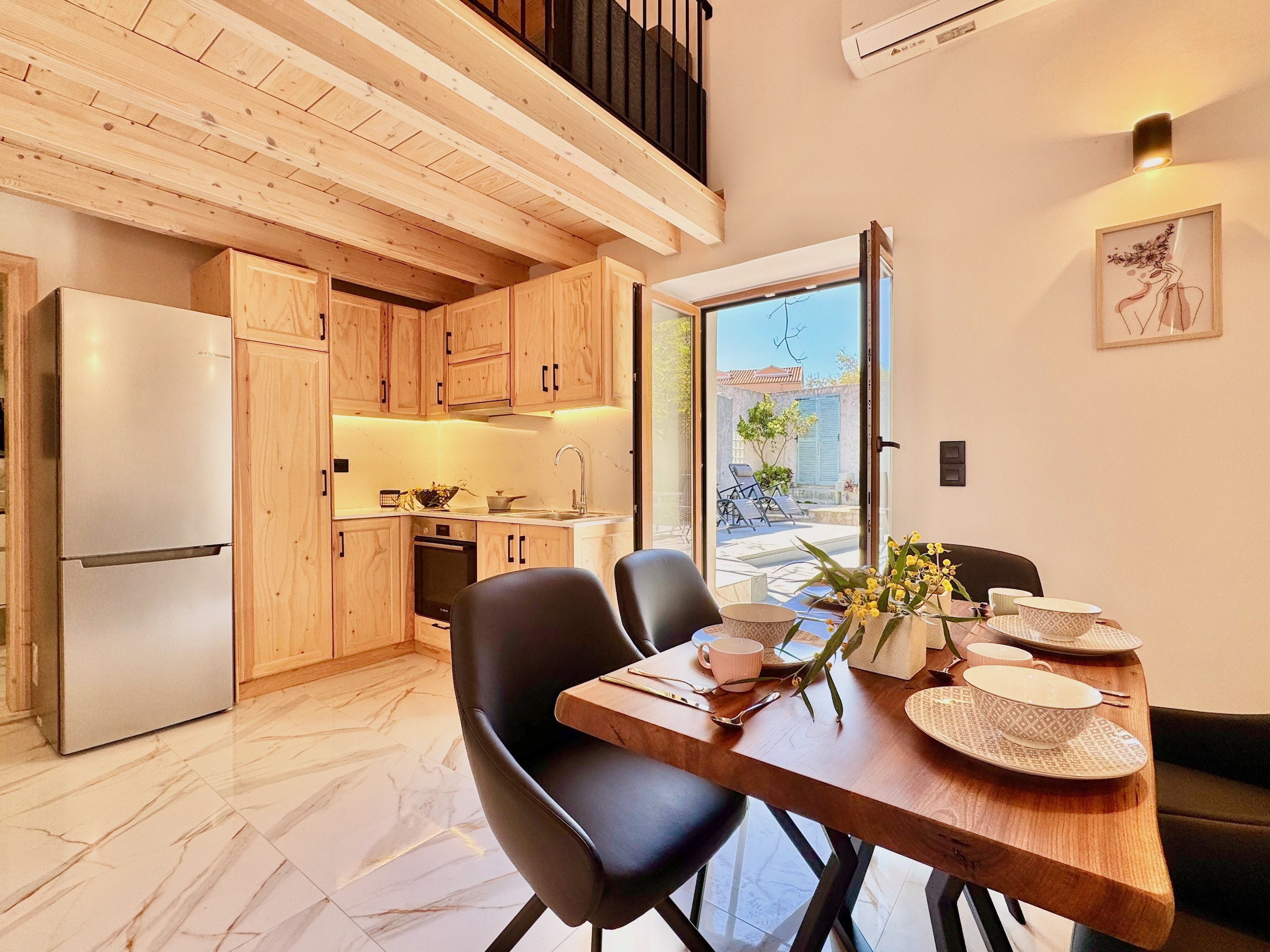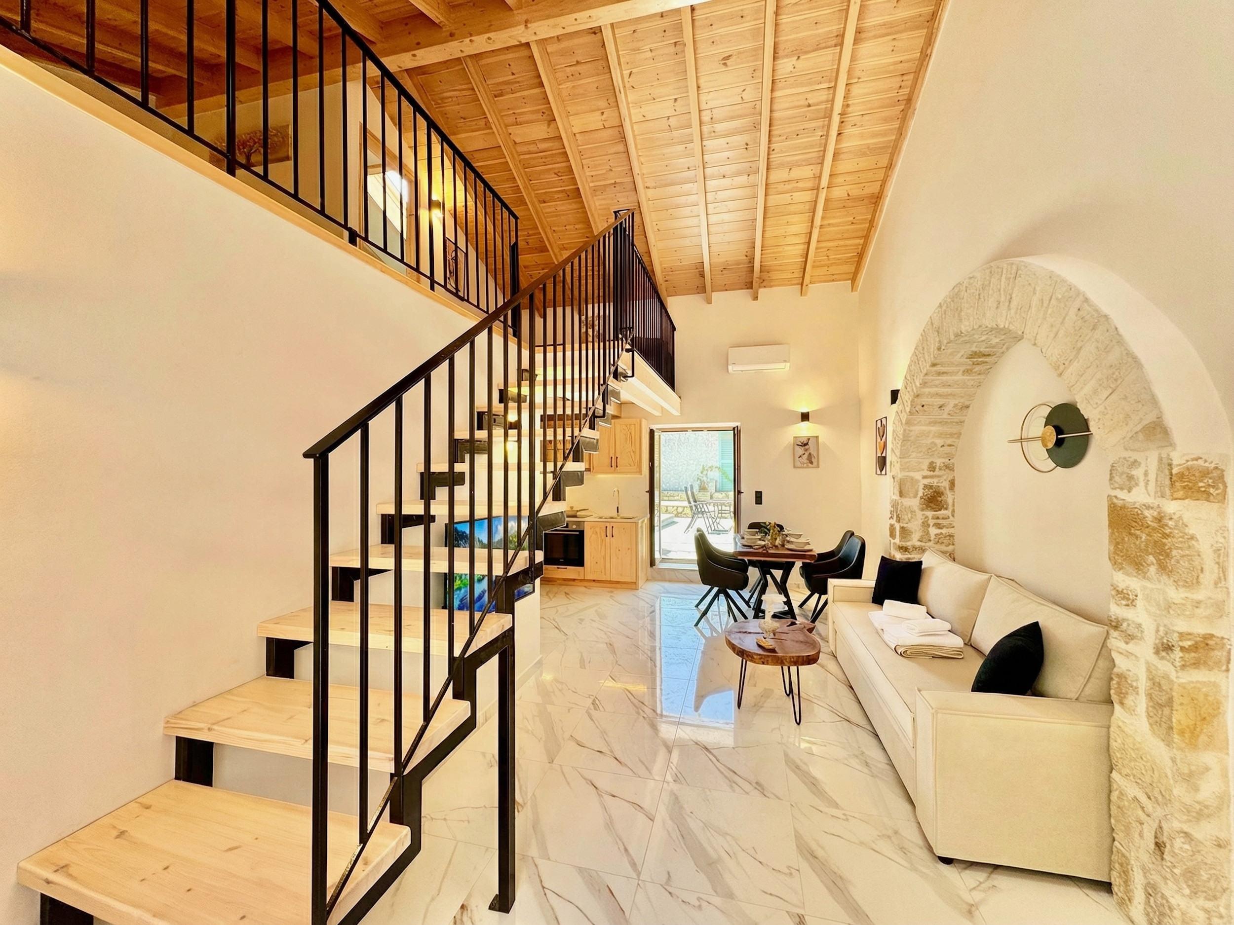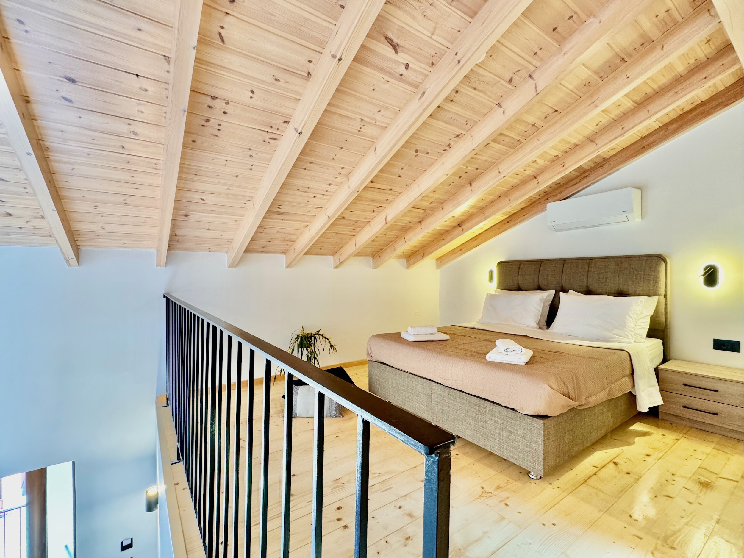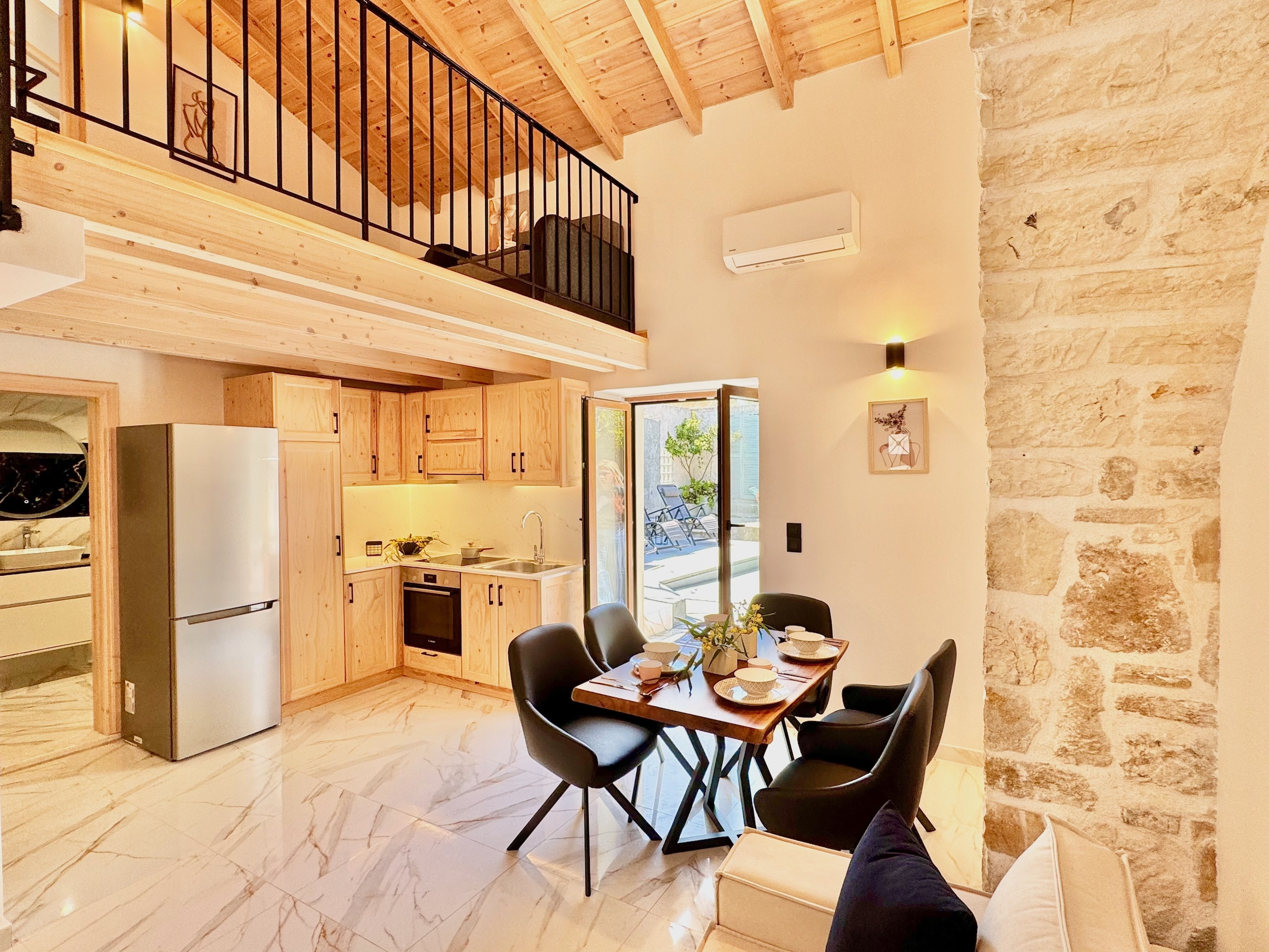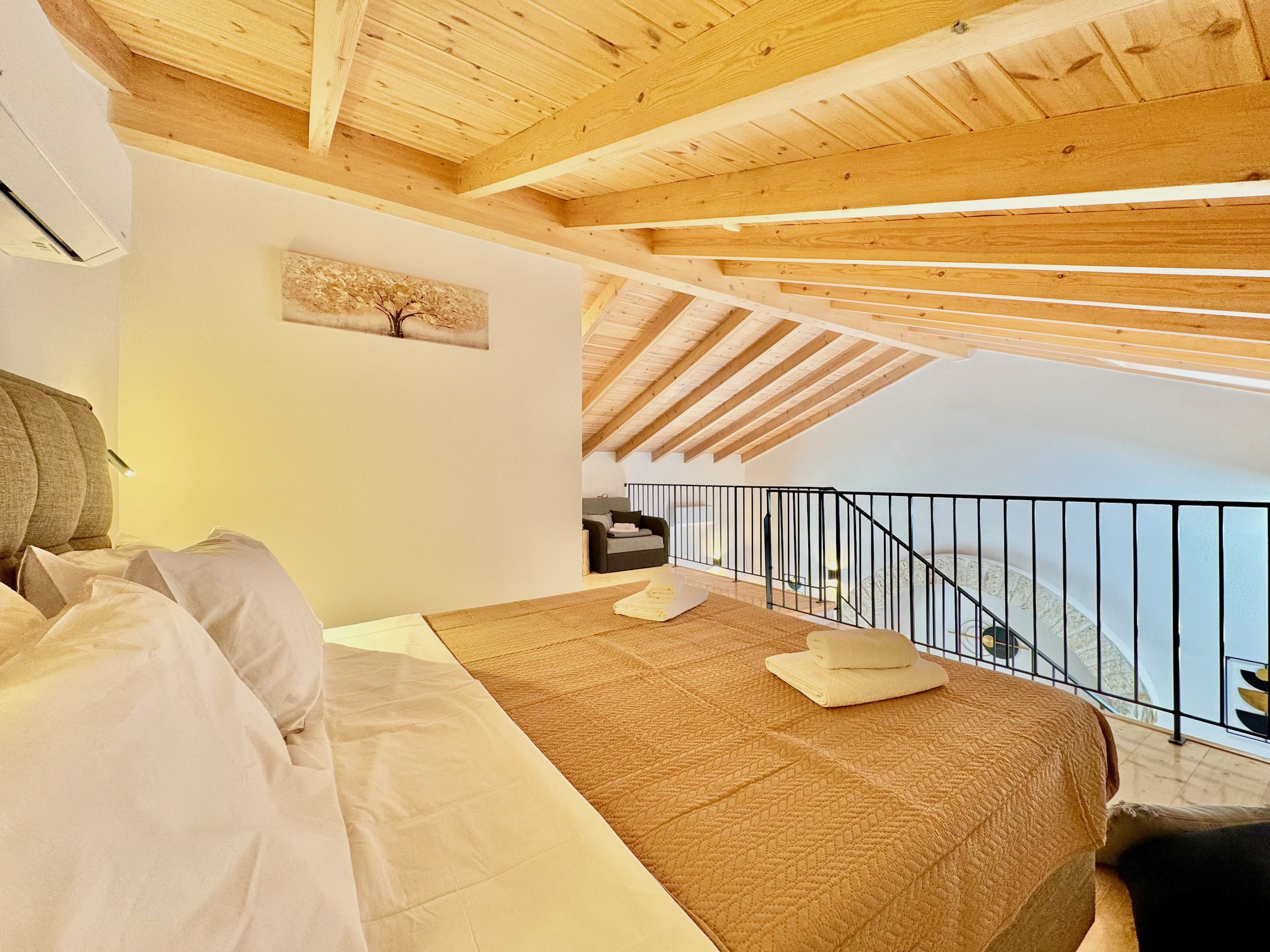 Skouna Suite 1 is the largest of the two Skouna Suites. Comfortable and extremely airy, thanks to its large windows and high beamed ceilings, this maisonette-style property with independent entrance can easily sleep 6 guests. Access is via the main door (trough ramp, no steps required) onto the main living area which is equipped with double sofa bed, smart TV, fully equipped kitchenette and dining table. On the ground floor a large double bedroom and a bathroom with shower and washing machine/dryer are located. Stairs lead up to the mezzanine, open above the living area, which houses a double bed, a useful extra shower room and 2 armchairs that, if required, can be turned into 2 full size single beds. Despite being designed for 6 guests, this clever layout and wide spaces allow to accommodate up to 8 people if needed. Quotes for guests exceeding the number of 6 are available on request. The property is fully air-conditioned (included in the rental price). During the renovation, with lasted over one year, great emphasis has been given to the style, the décor and the modern comforts (including perfect thermal and acoustic insulation), in order to offer a truly superior holiday experience, unparalleled in the area.