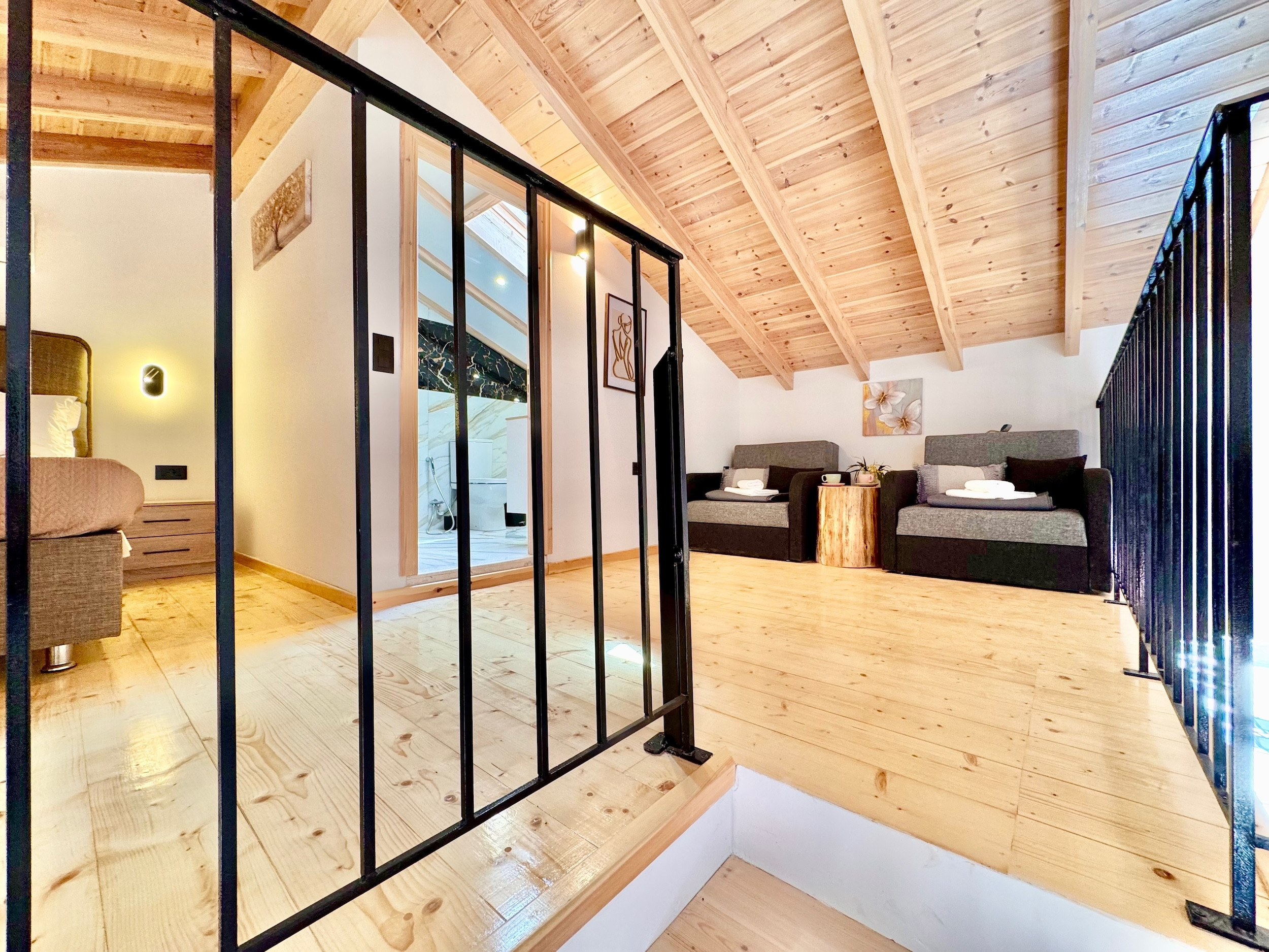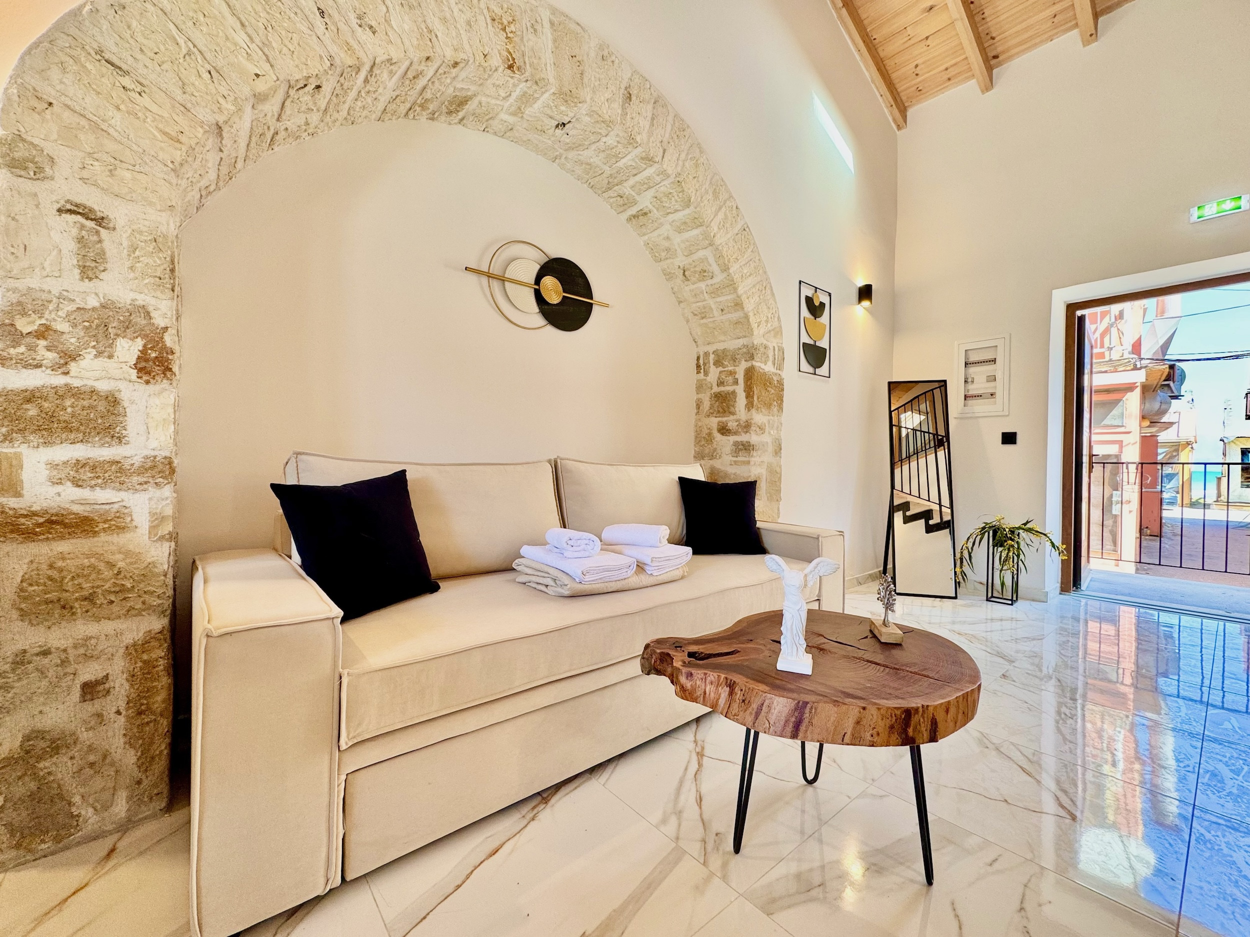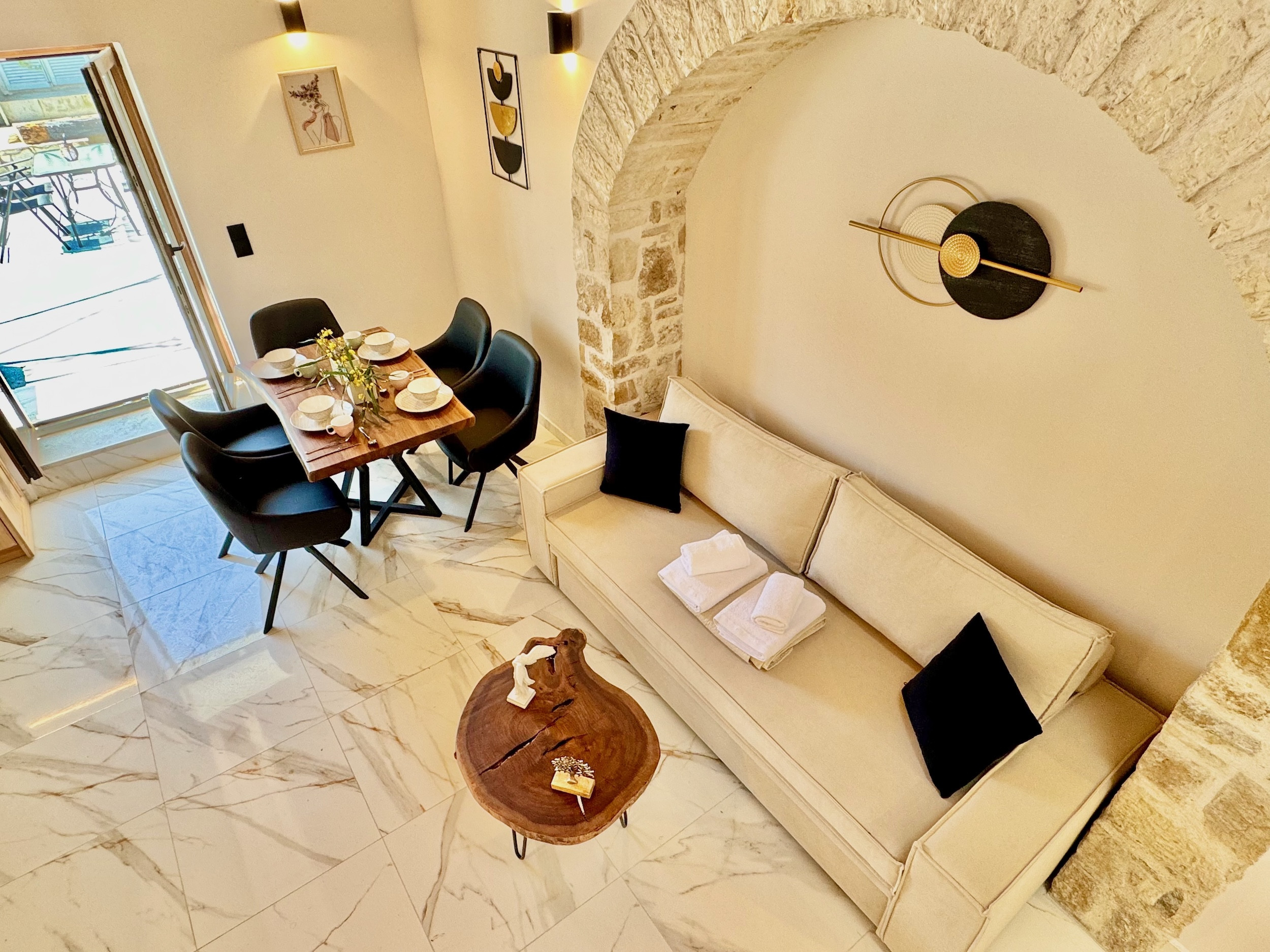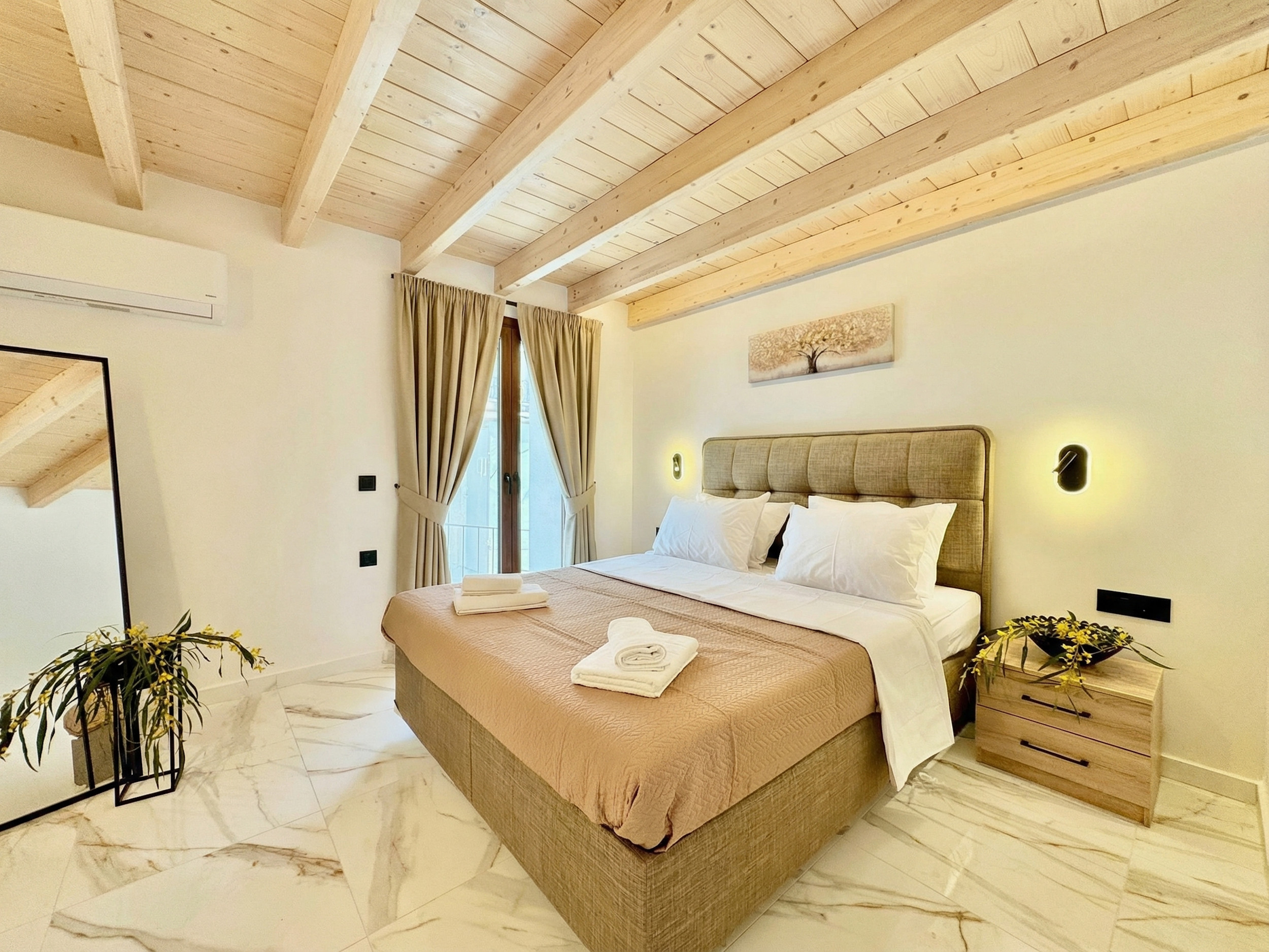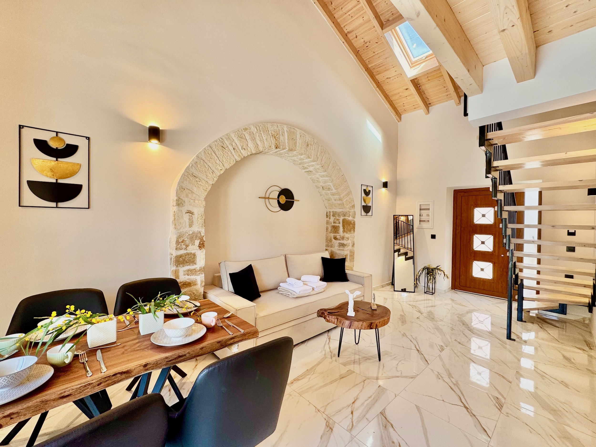 Skouna Suite 1 is the largest of the two Skouna Suites. Comfortable and extremely airy, thanks to its large windows and high beamed ceilings, this maisonette-style property with independent entrance can easily sleep 6 guests. Access is via the main door (trough ramp, no steps required) onto the main living area which is equipped with double sofa bed, smart TV, fully equipped kitchenette and dining table. On the ground floor a large double bedroom and a bathroom with shower and washing machine/dryer are located. Stairs lead up to the mezzanine, open above the living area, which houses a double bed, a useful extra shower room and 2 armchairs that, if required, can be turned into 2 full size single beds. Despite being designed for 6 guests, this clever layout and wide spaces allow to accommodate up to 8 people if needed. Quotes for guests exceeding the number of 6 are available on request. The property is fully air-conditioned (included in the rental price). During the renovation, with lasted over one year, great emphasis has been given to the style, the décor and the modern comforts (including perfect thermal and acoustic insulation), in order to offer a truly superior holiday experience, unparalleled in the area.