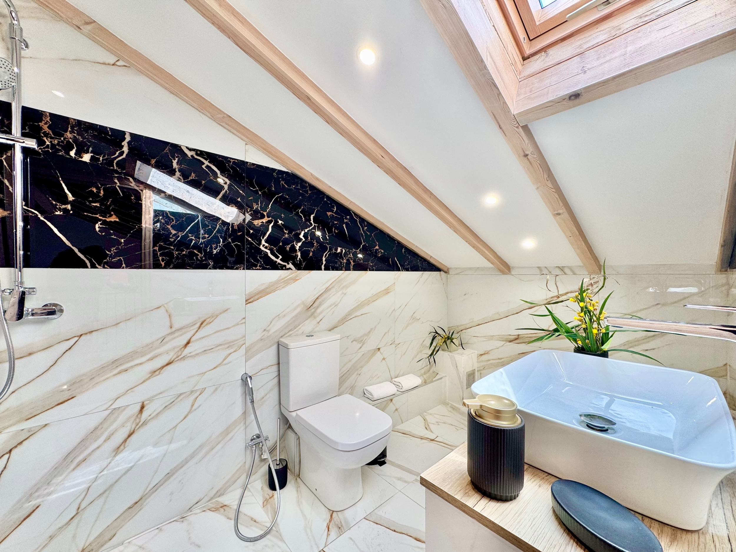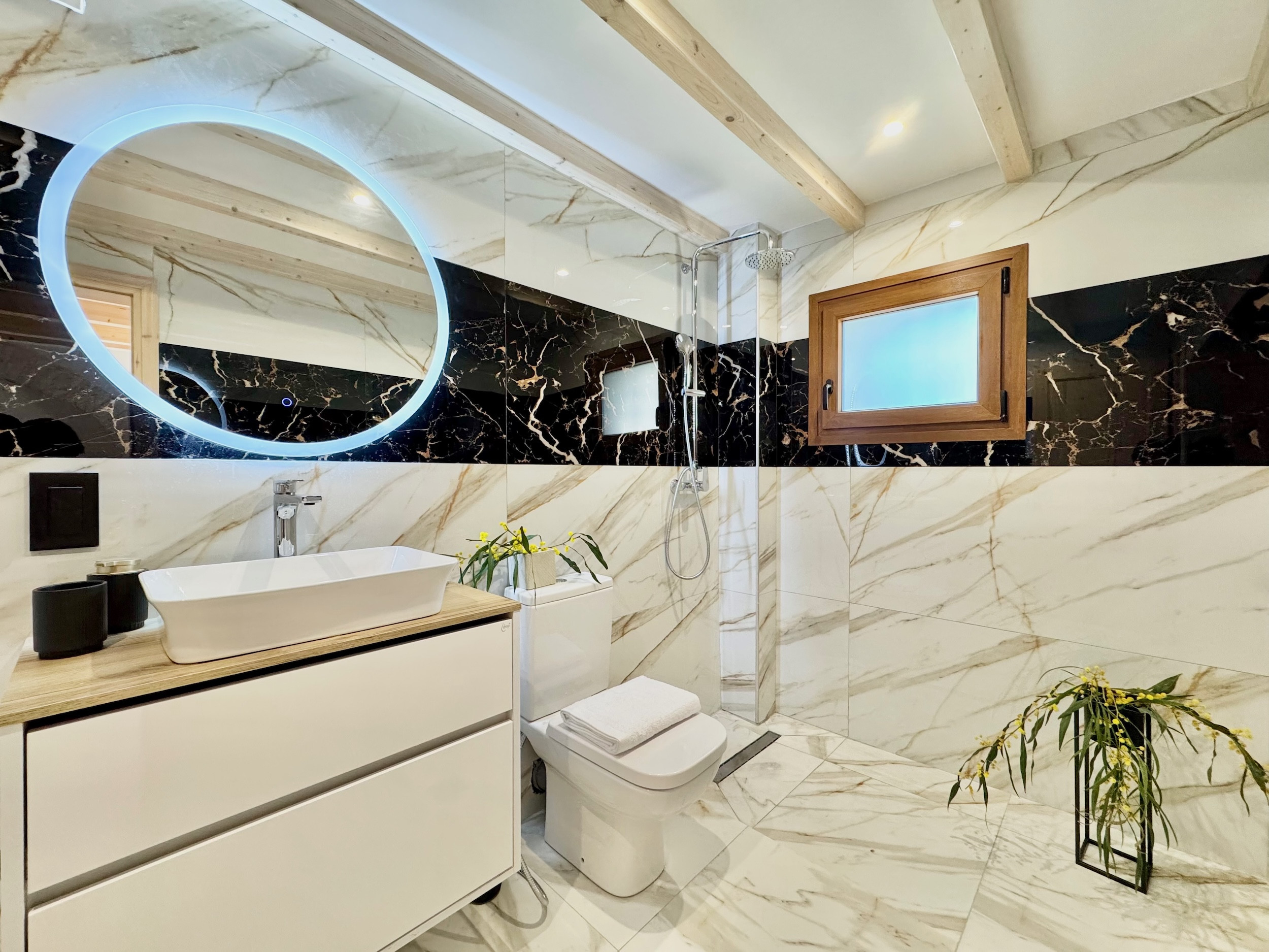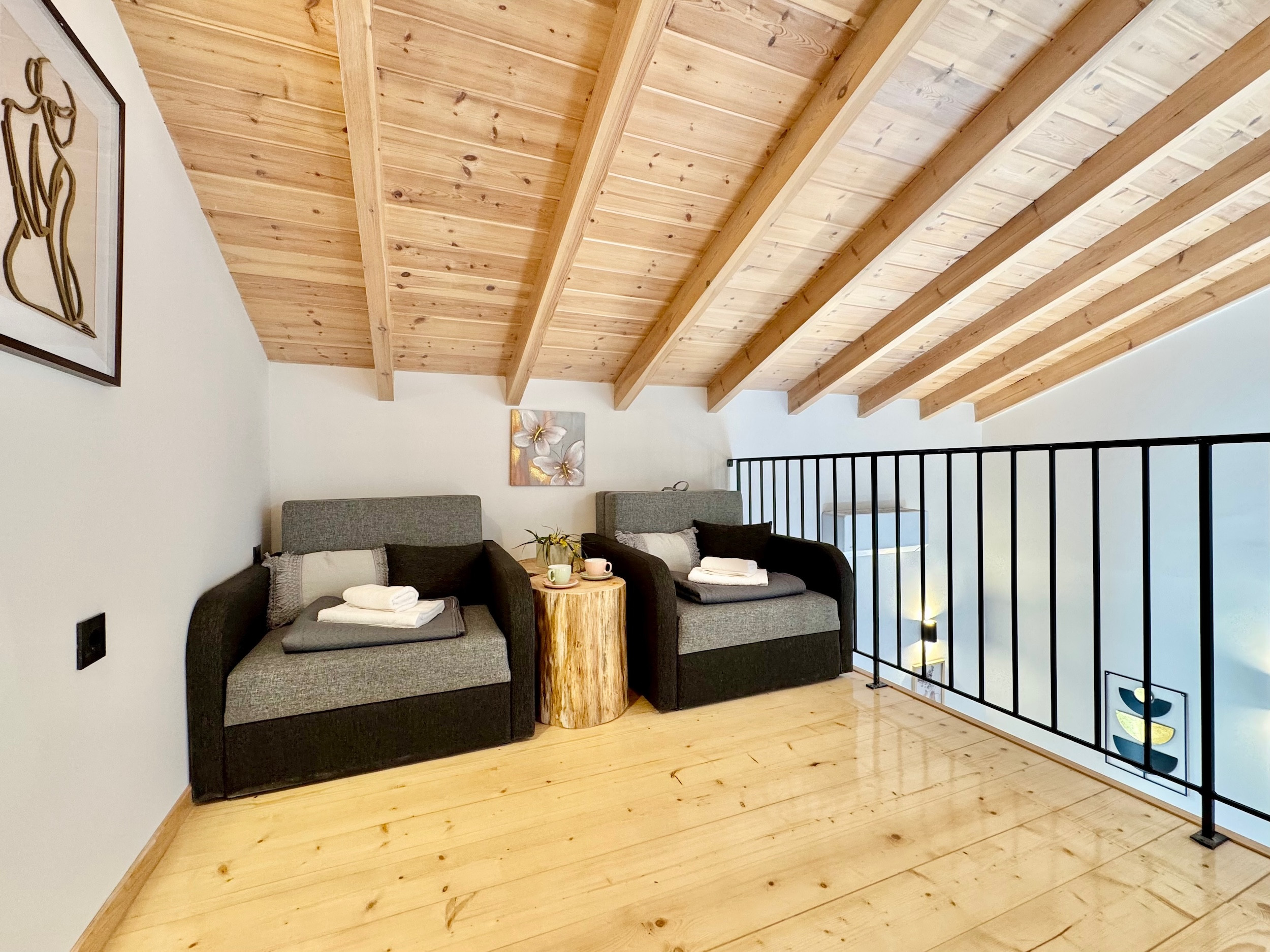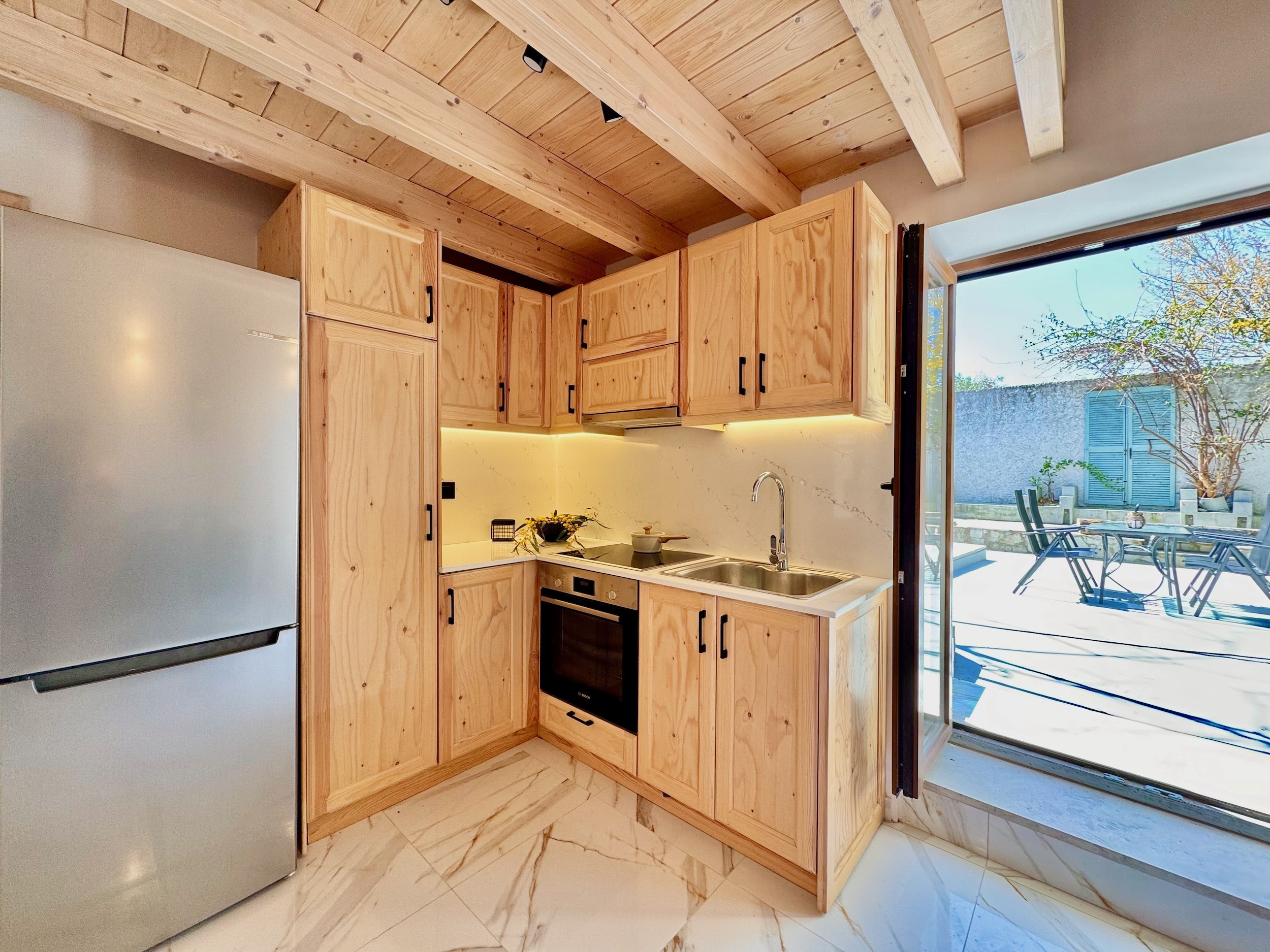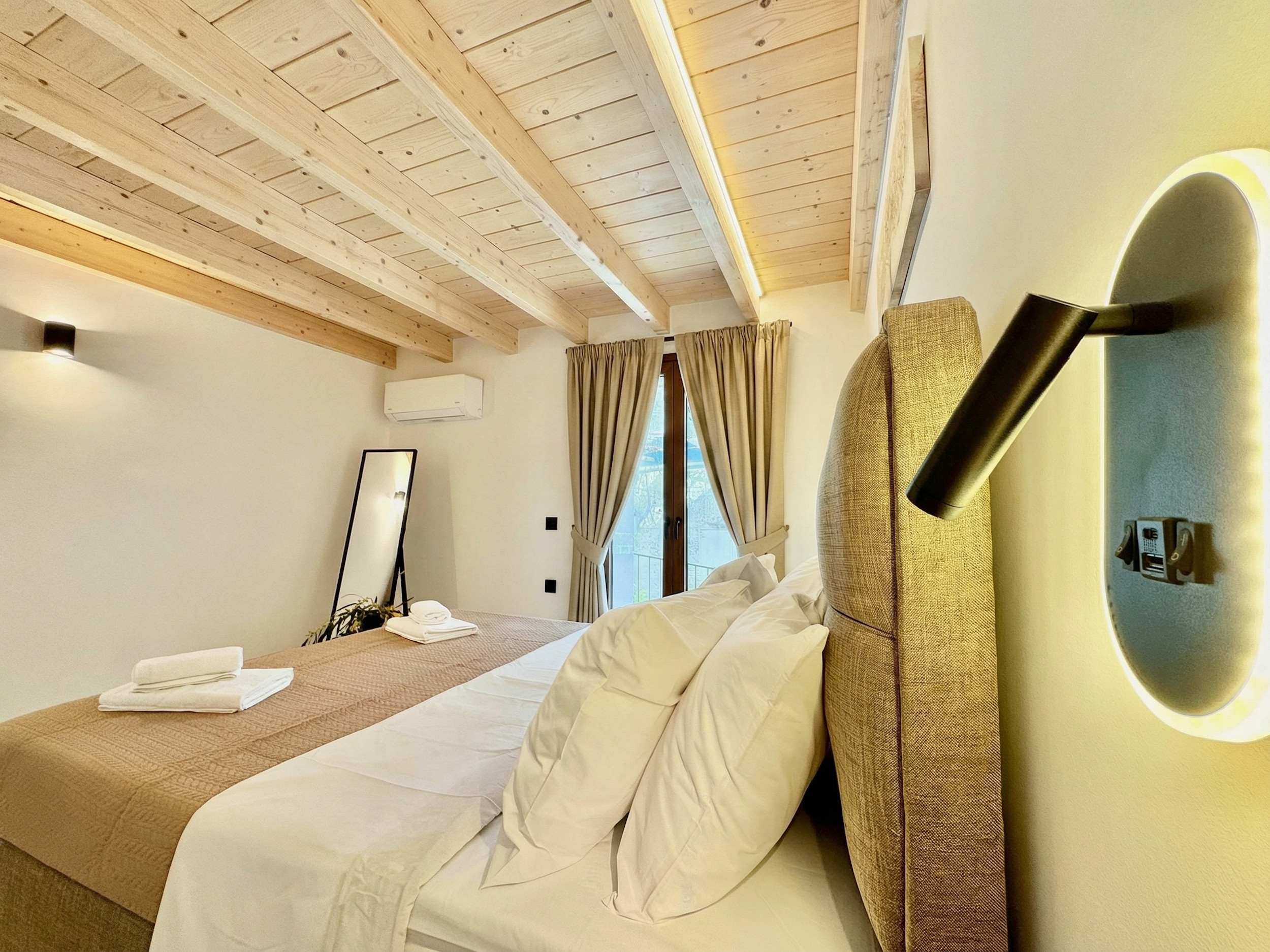 Skouna Suite 1 is the largest of the two Skouna Suites. Comfortable and extremely airy, thanks to its large windows and high beamed ceilings, this maisonette-style property with independent entrance can easily sleep 6 guests. Access is via the main door (trough ramp, no steps required) onto the main living area which is equipped with double sofa bed, smart TV, fully equipped kitchenette and dining table. On the ground floor a large double bedroom and a bathroom with shower and washing machine/dryer are located. Stairs lead up to the mezzanine, open above the living area, which houses a double bed, a useful extra shower room and 2 armchairs that, if required, can be turned into 2 full size single beds. Despite being designed for 6 guests, this clever layout and wide spaces allow to accommodate up to 8 people if needed. Quotes for guests exceeding the number of 6 are available on request. The property is fully air-conditioned (included in the rental price). During the renovation, with lasted over one year, great emphasis has been given to the style, the décor and the modern comforts (including perfect thermal and acoustic insulation), in order to offer a truly superior holiday experience, unparalleled in the area.