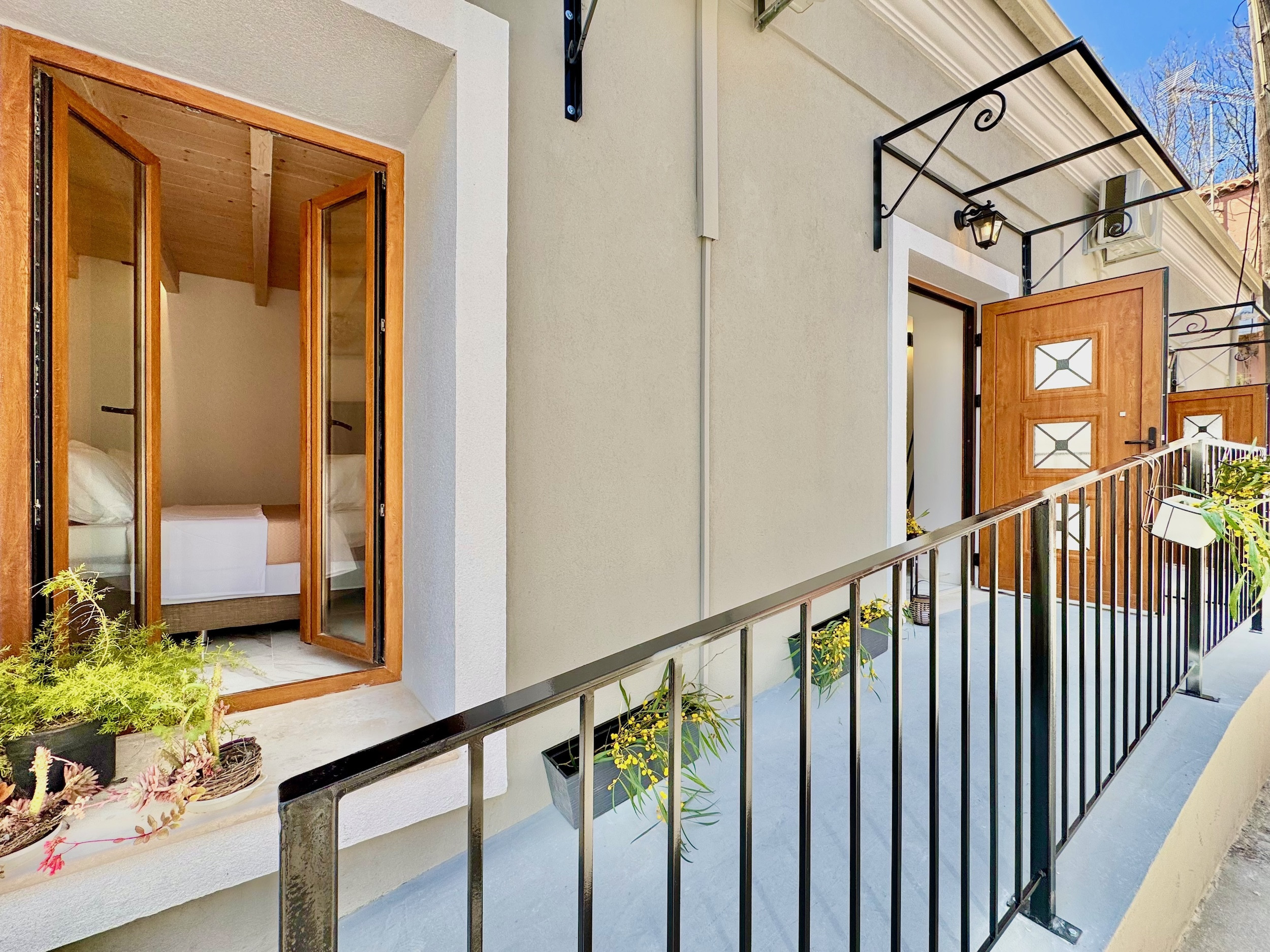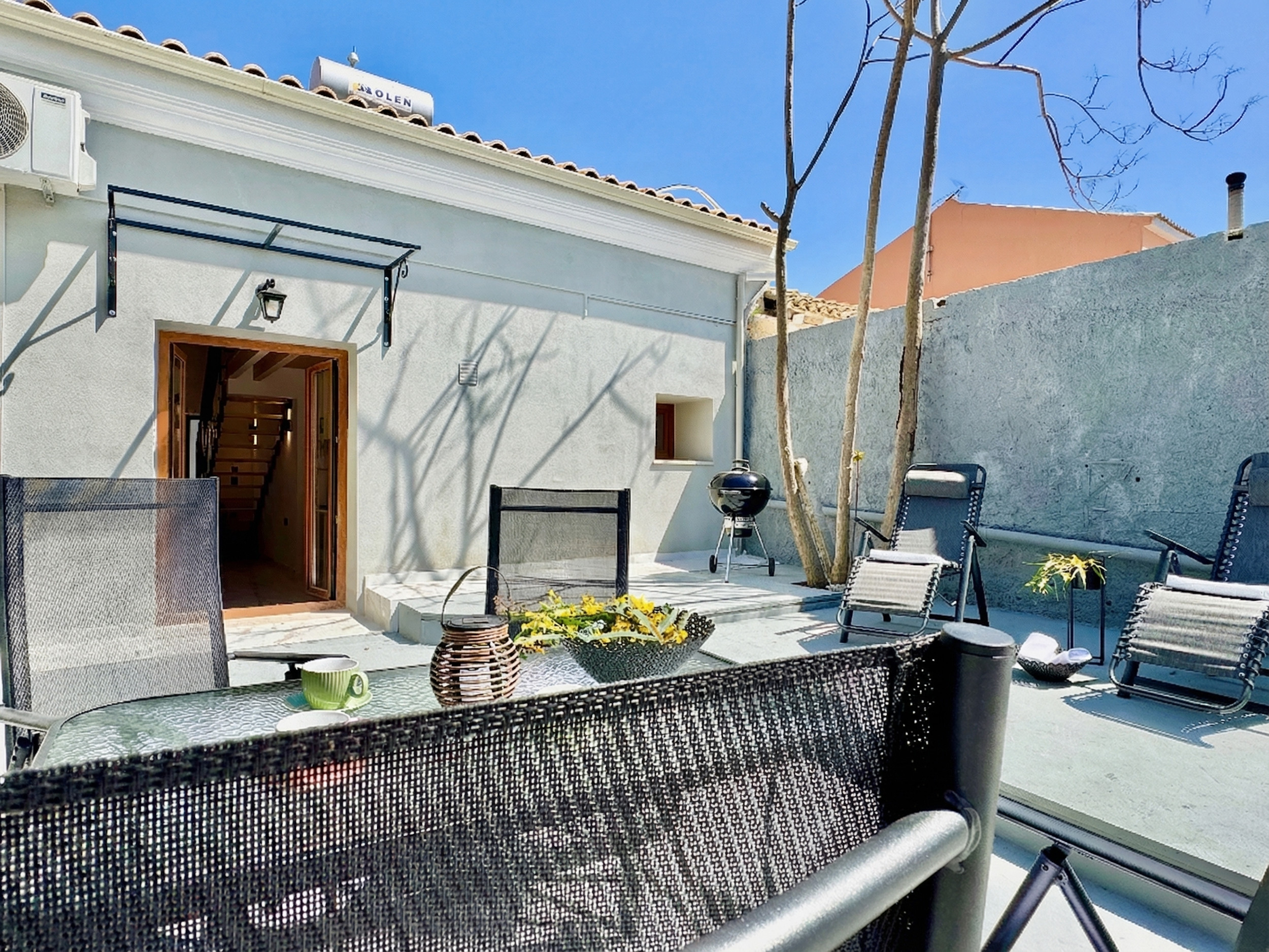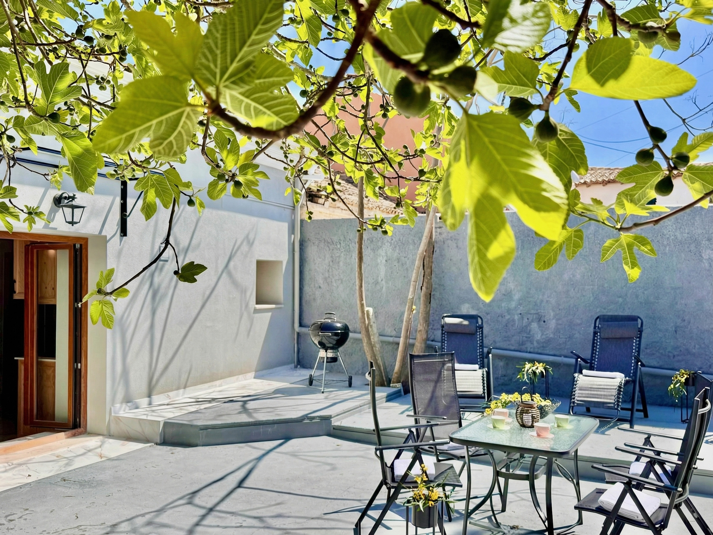Patio doors from the kitchen area lead to the large patio at the back. This huge area, shared only with the next door Skouna Suite 2, houses comfortable sunbeds, dining table, barbecue and chill-out areas with cushions and beautiful local shrubs providing shade and atmosphere. This is a true heaven in the heart of the lively resort of Roda. Although a car is absolutely not necessary considering the very central location of the property, public parking (free of charge) is available in the area.