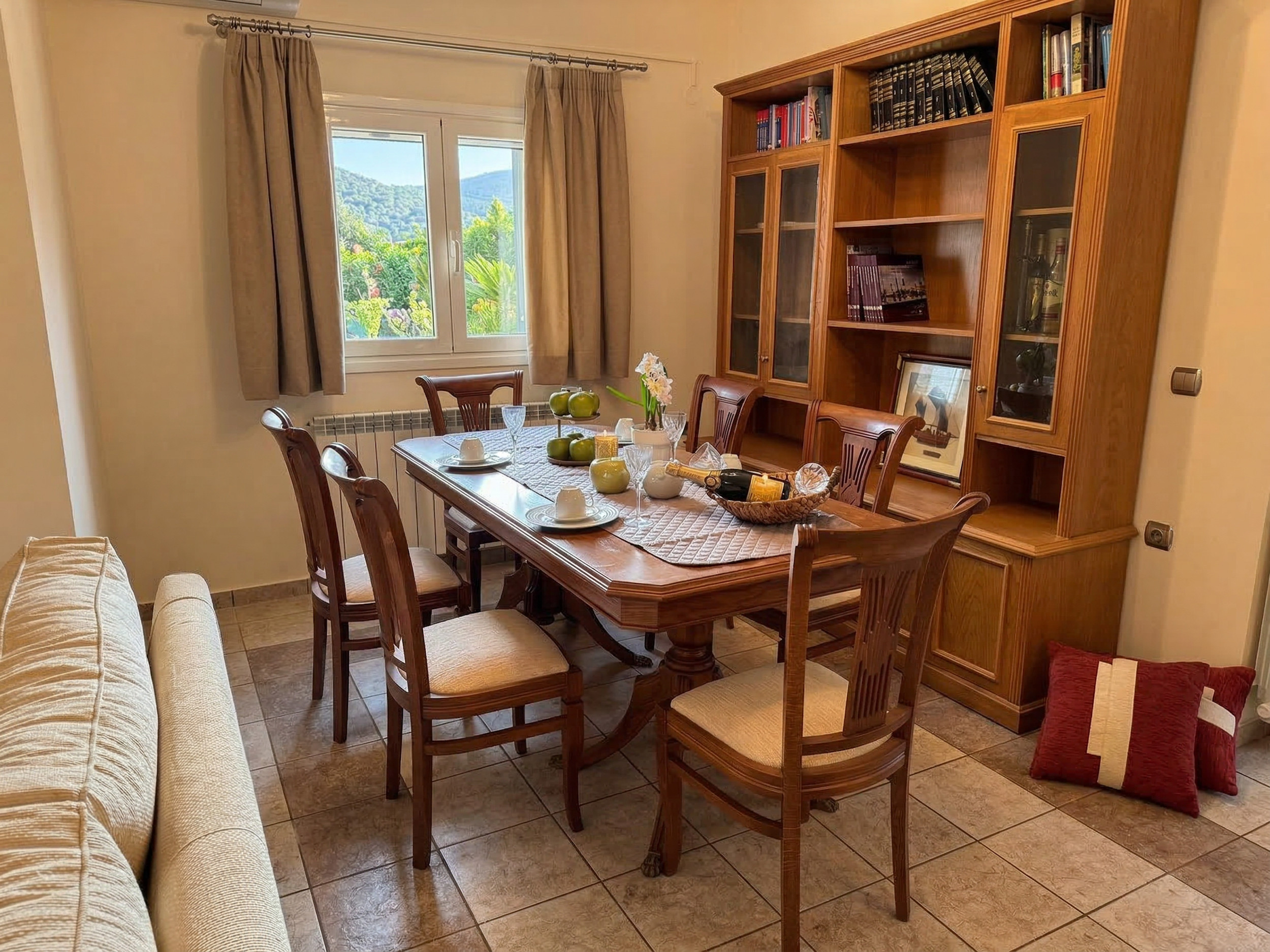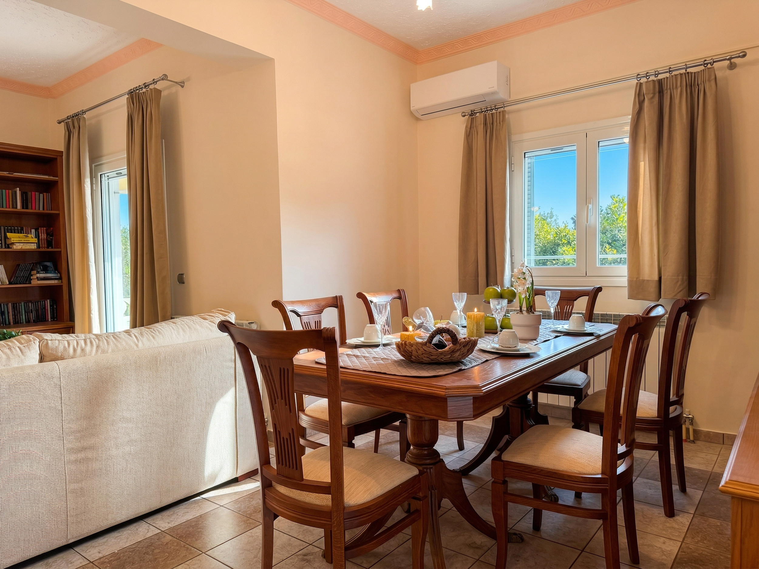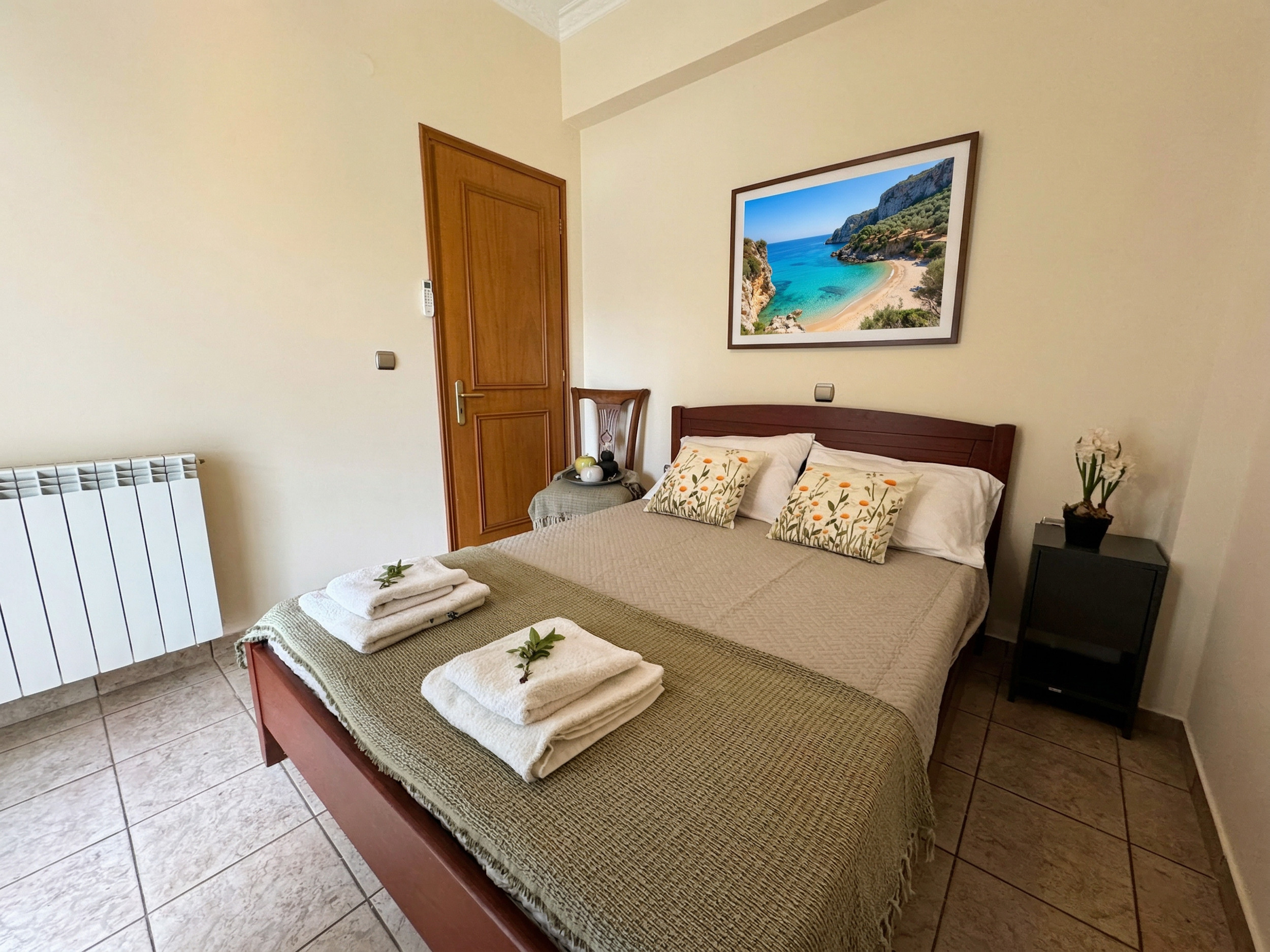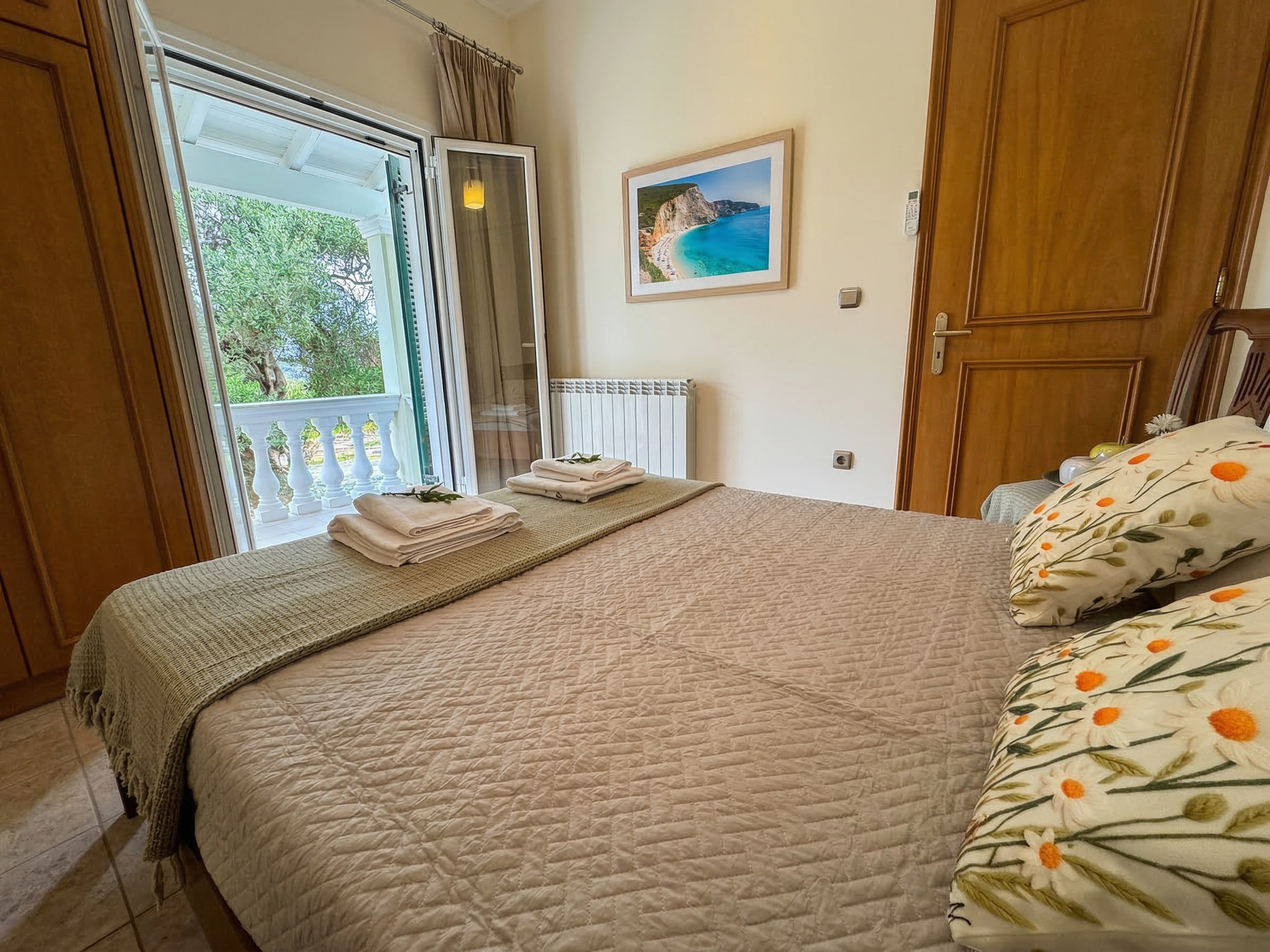 Inside, Villa Calypso is conveniently set all over one floor. The high beamed ceilings provide a sense of space and the large patio doors offer full of natural light. Furnished in traditional corfiot style, with precious wooden furniture and antique elements, nothing has been left to the case to combine the intimate soul of the island with the best seafront location. Entrance via the main door is onto the airy lounge with adjoining kitchen and dining area. The fully equipped kitchen has all the essentials for a full self catering holiday while the comfy sofas are the perfect to relax in the evening (due to its wide indoor spaces, the property is excellent also for off season rentals). There are 3 bedrooms and 3 bathrooms in Villa Calypso: 2 of the bedrooms are doubles (and have ensuite bathrooms with bathtub + shower over) and the 3rd bedroom is a twin located next to its dedicated shower room. For the comfort of the guests, all the bedrooms provide direct access to the patio and gardens. The whole villa, including the 3 bedrooms and the lounge, is air-conditioned (included in the rental rate).