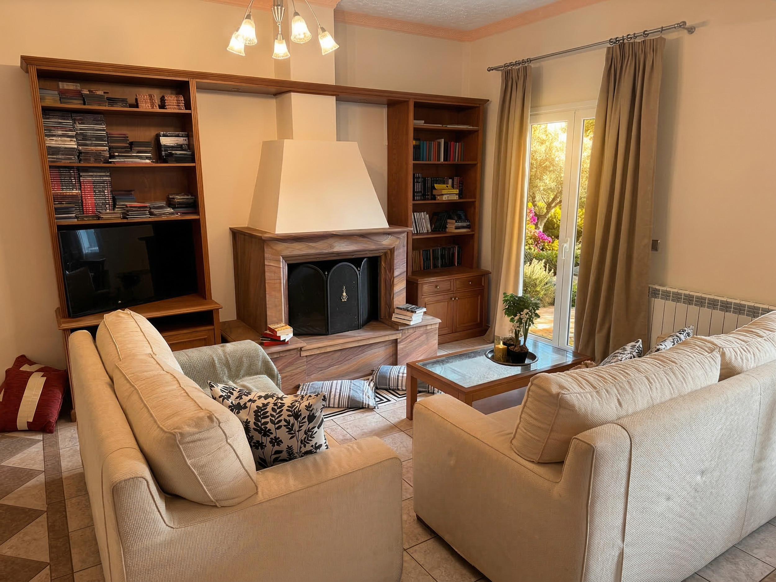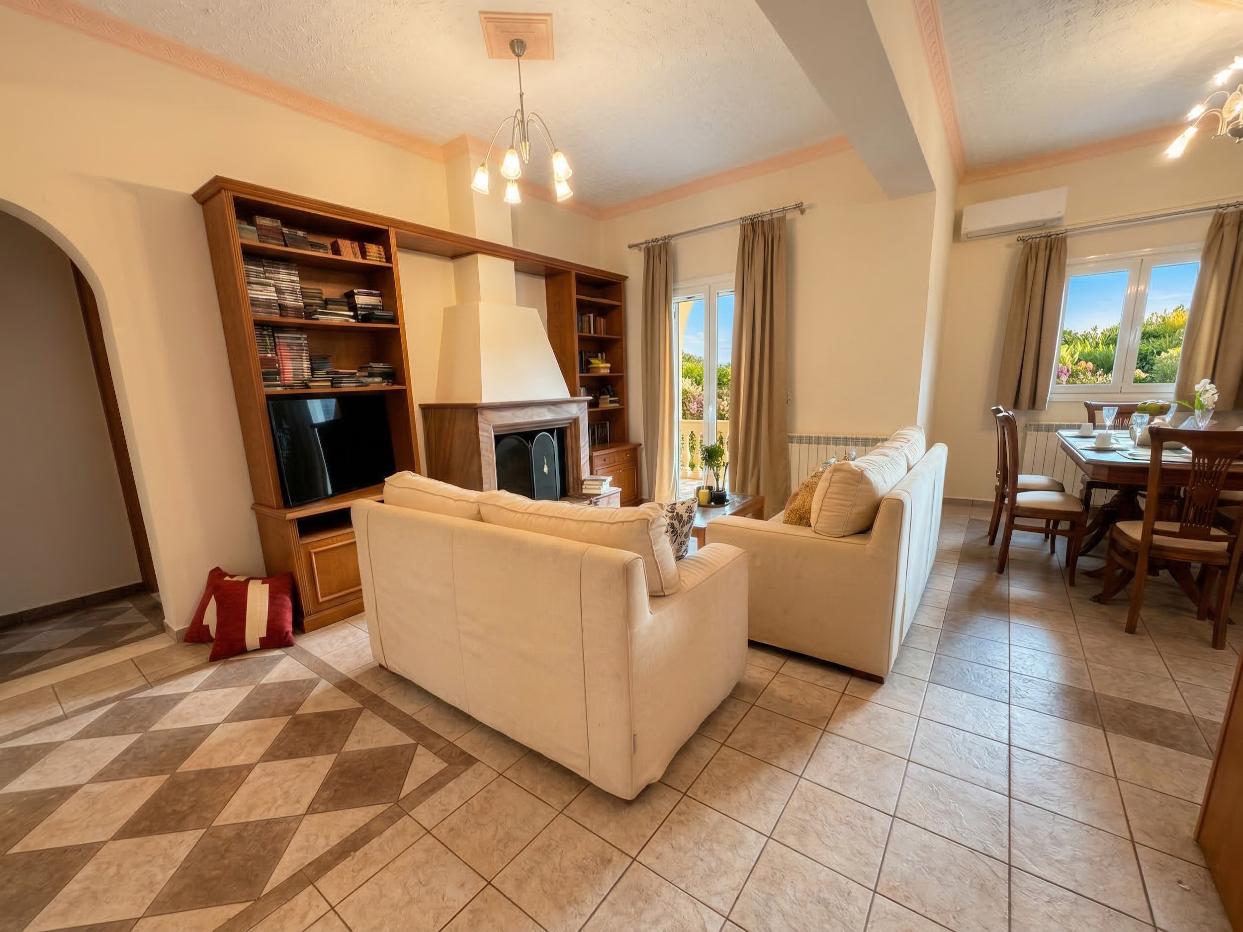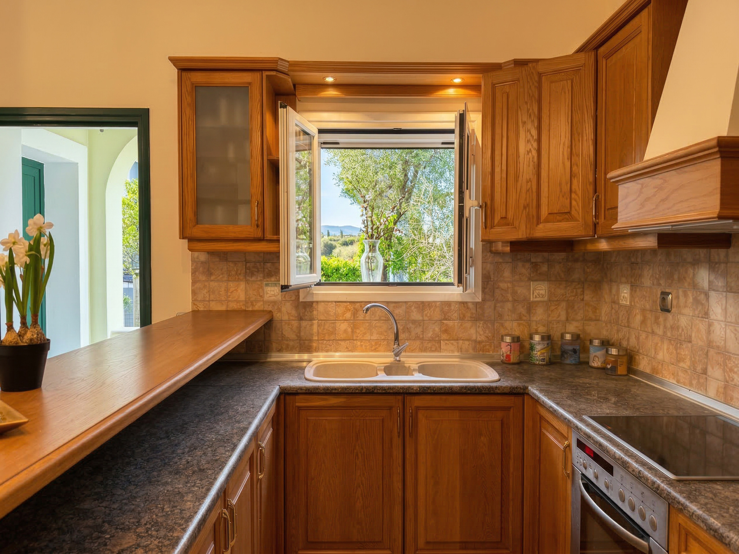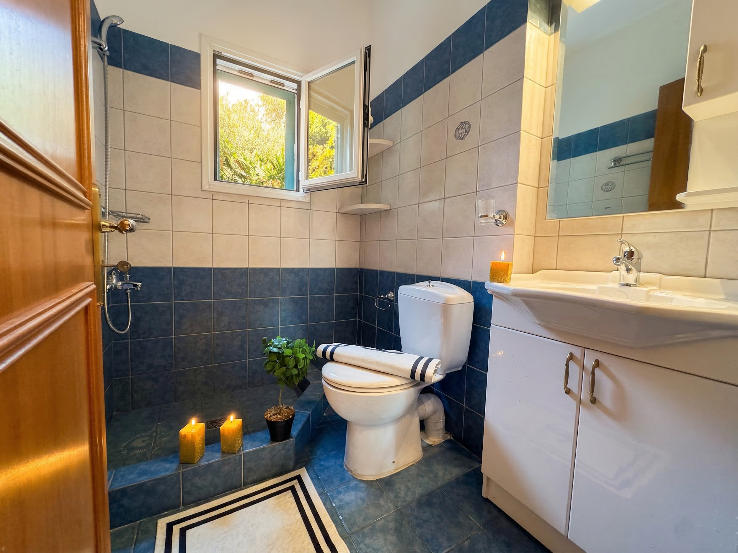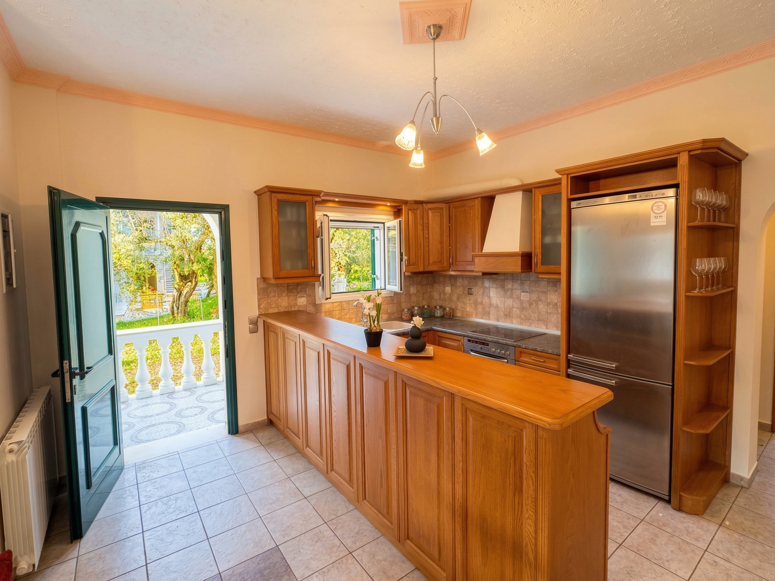 Inside, Villa Calypso is conveniently set all over one floor. The high beamed ceilings provide a sense of space and the large patio doors offer full of natural light. Furnished in traditional corfiot style, with precious wooden furniture and antique elements, nothing has been left to the case to combine the intimate soul of the island with the best seafront location. Entrance via the main door is onto the airy lounge with adjoining kitchen and dining area. The fully equipped kitchen has all the essentials for a full self catering holiday while the comfy sofas are the perfect to relax in the evening (due to its wide indoor spaces, the property is excellent also for off season rentals). There are 3 bedrooms and 3 bathrooms in Villa Calypso: 2 of the bedrooms are doubles (and have ensuite bathrooms with bathtub + shower over) and the 3rd bedroom is a twin located next to its dedicated shower room. For the comfort of the guests, all the bedrooms provide direct access to the patio and gardens. The whole villa, including the 3 bedrooms and the lounge, is air-conditioned (included in the rental rate).