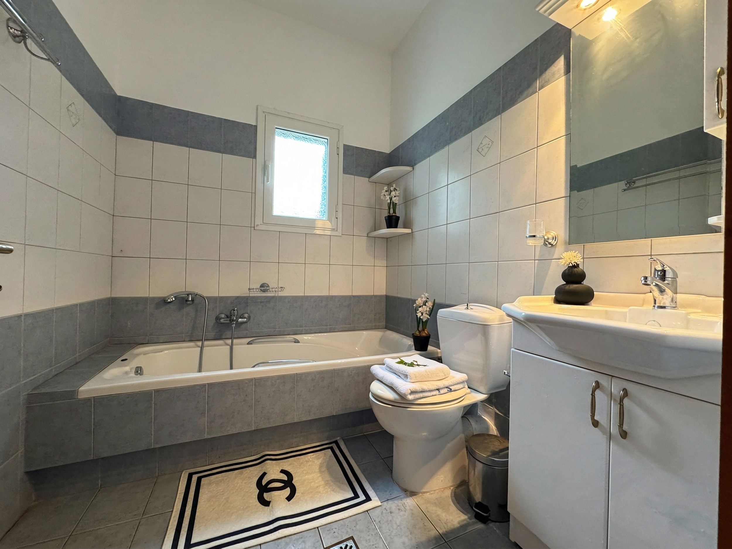 Inside, the villa is incredibly spacious and airy. It has been finished with taste and style to the highest standard using traditional elements such as wood and stone. The main living area is located on the upper floor. There is a huge lounge (sofas, smart tv, wifi internet) with adjoining kitchen, dining area, a double bedroom with balcony overlooking the pool, as well as a family shower room. Above the lounge there is a beautiful mezzanine level: a perfect playroom for both adults and children! Large furnished terraces accessed from the lounge open towards the sea providing sensational views over the beach nearby, the Ionian Sea, and the sunset. The lower floor, accessed via an imposing wooden staircase, has 3 further bedrooms as well as a well equipped laundry area. The master bedroom has double bed and its own en-suite shower room. The other bedrooms are respectively a twin and a double and share a large family bathroom with bathtub + shower over. For the comfort of our guests, the bedrooms are air-conditioned (included in the rental price).