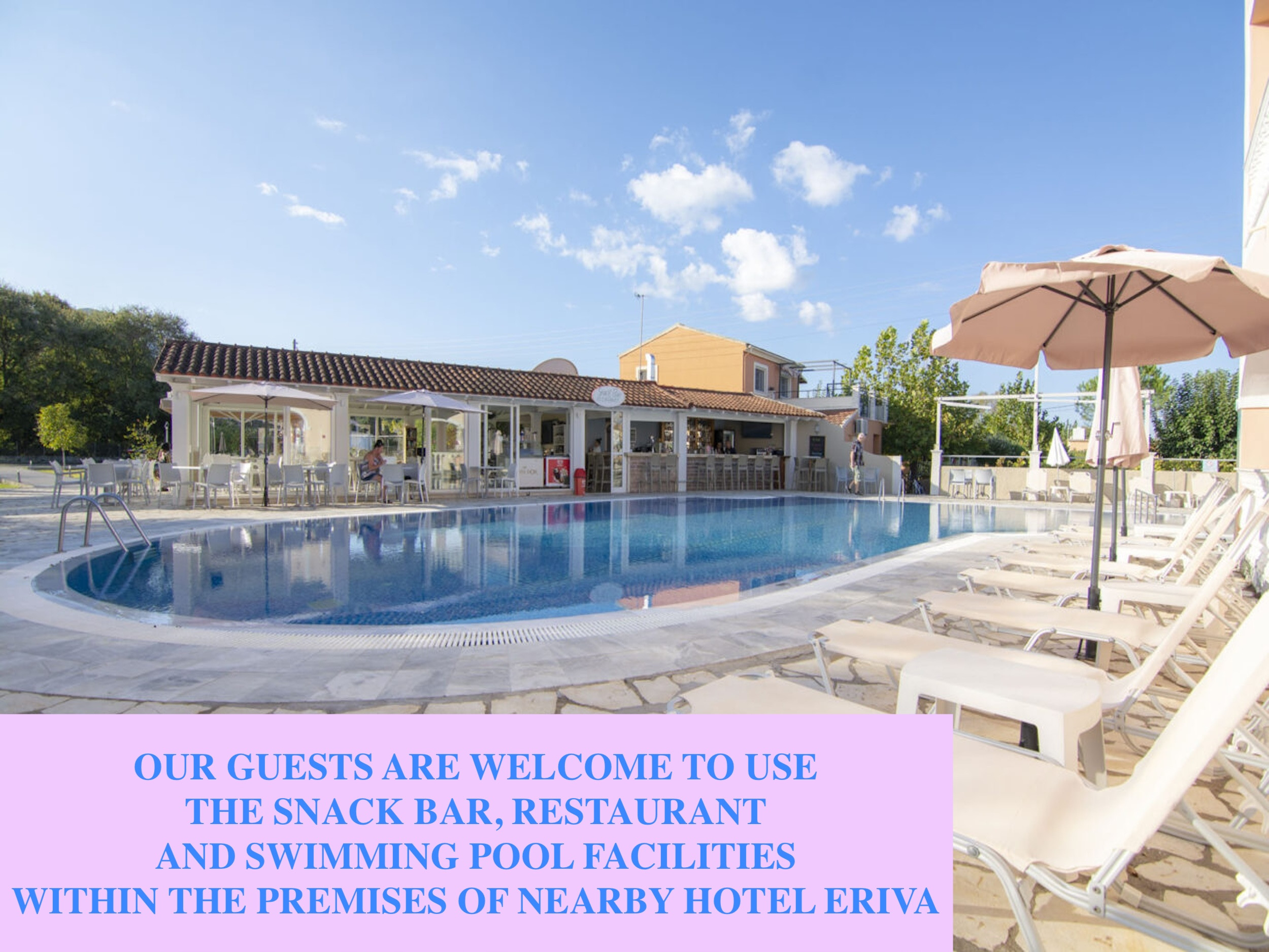 Outside, the villa is surrounded by extensive private gardens with lawn, furnished with sunbeds to endless relaxation under the shining Greek Sun. for the lovers of al-fresco dining, barbecue and outdoor dining table are also provided. Private parking is available within the premises. An extra bonus for our guests is the chance to enjoy the facilities of our partner resort “Pool Bar Eriva”, which is located just a few min walk away and open from May until October. There the guests can enjoy drinks at the bar, taste a delicious snack, attend to a traditional Greek Night event or splash by the refreshing swimming pool: an opportunity not to be missed!