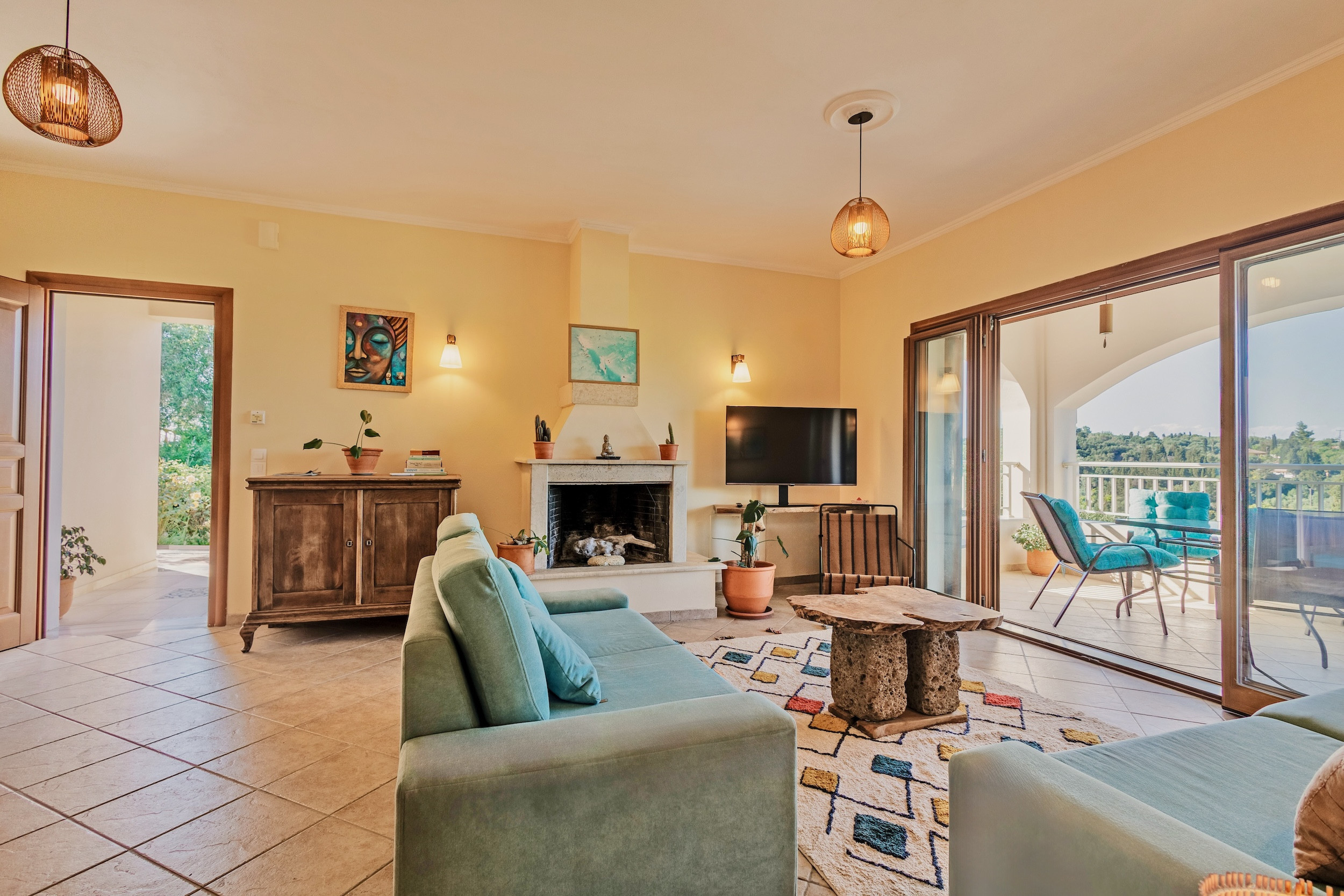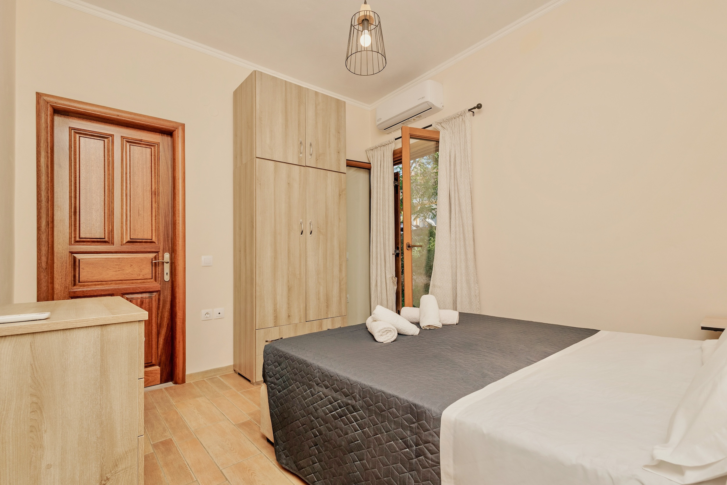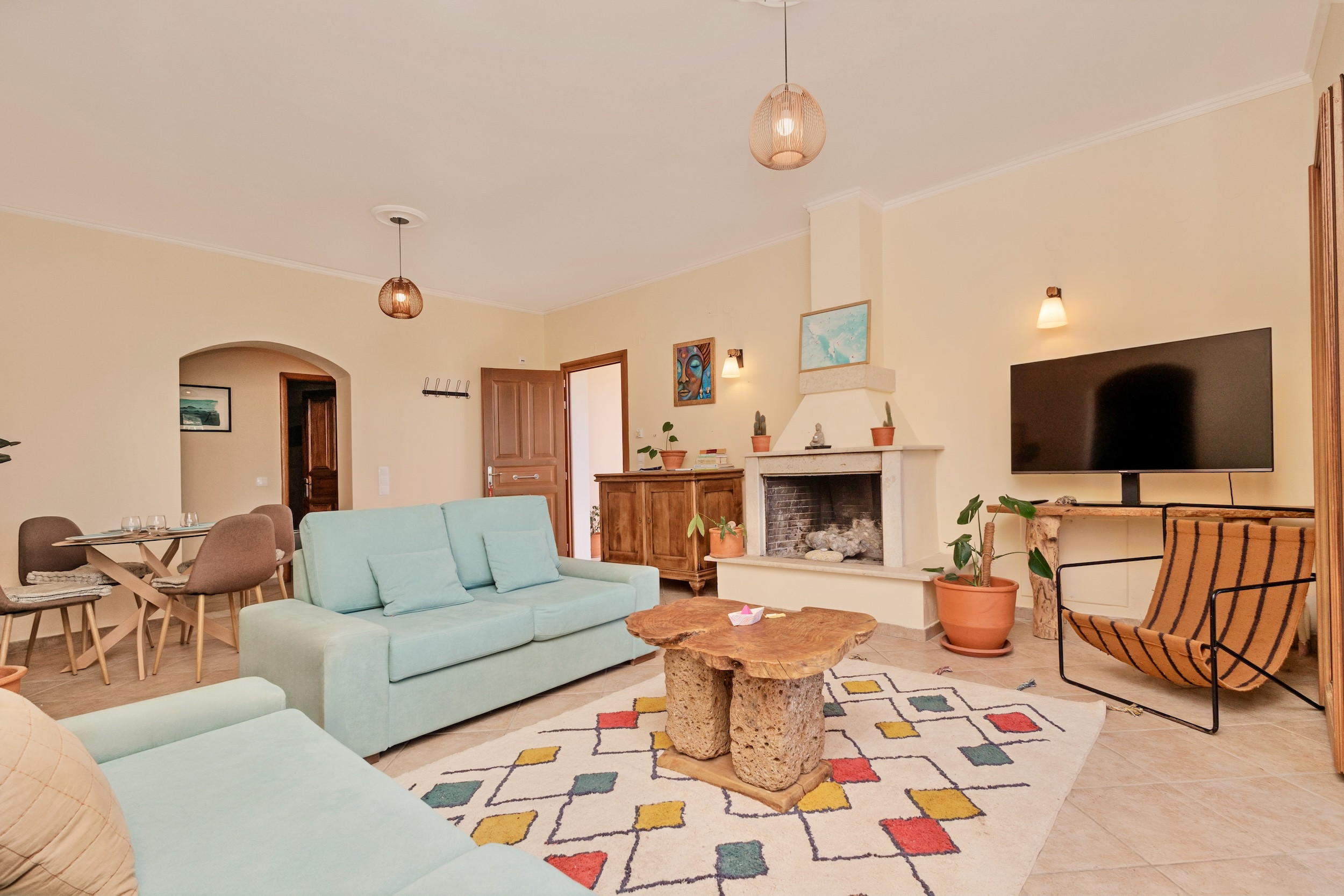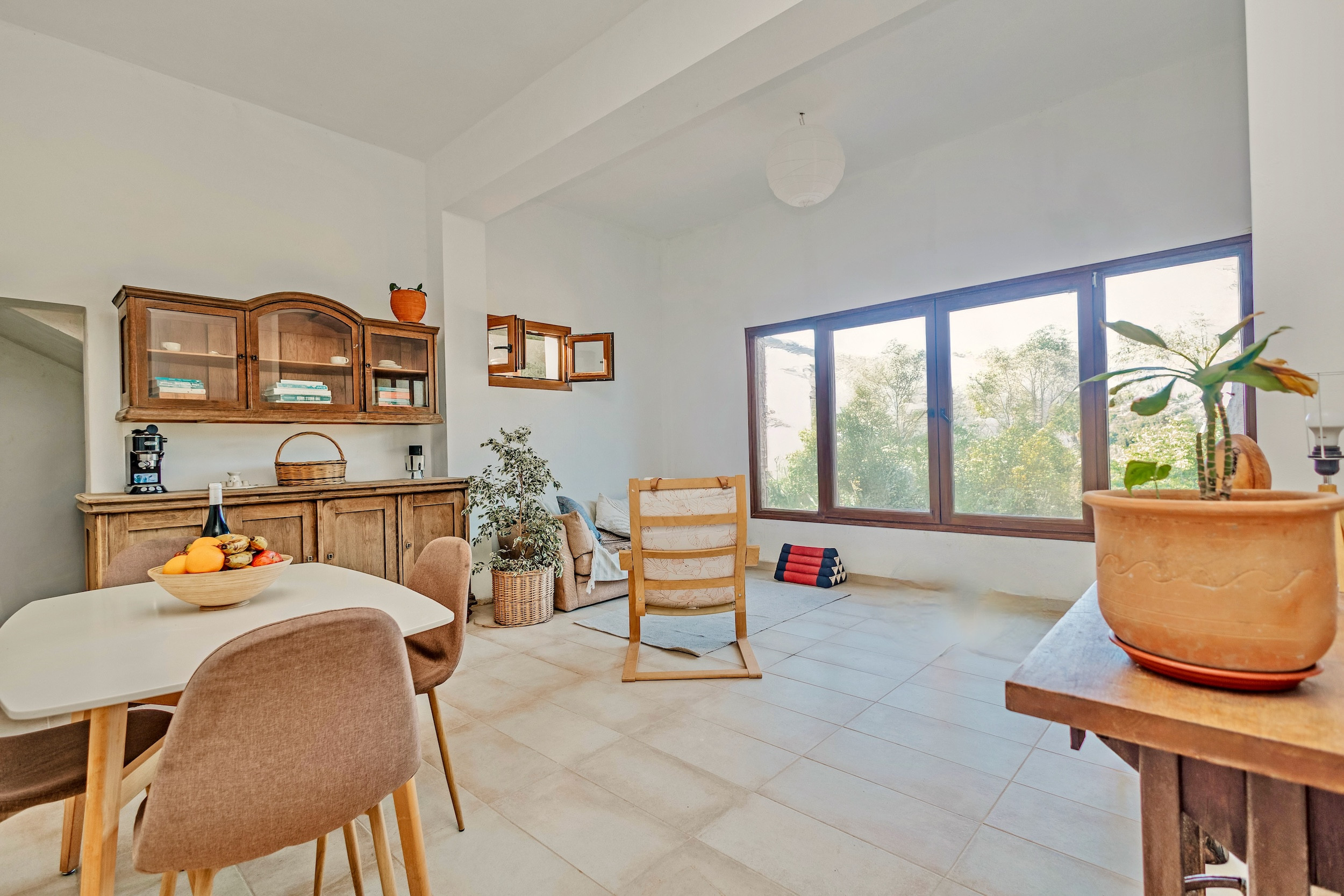 Inside, the property is set over 2 floors, not connected from the inside, rented together as a whole detached villa with private pool. The lower floor comprises a large, self contained studio with double bed, lounge area with extra single sofa bed (9th guest), and a shower room. Large doors open straight to the landscaped outdoor areas. The upper floor comprises the main accommodation. There is a spacious kitchen, fully equipped, a beautifully furnished lounge with dining area (including smart TV), panoramic terraces and 3 bedrooms with 2 bathrooms. The bedrooms are respectively 2 doubles and one twin. One of the double bedrooms has its own e-suite bathroom while the other 2 bedrooms share the second shower room. For the comfort of the guests, the whole property is air-conditioned. The interiors are airy, cozy, welcoming and cheerful, the perfect combination to fully enjoy a Mediterranean holiday.