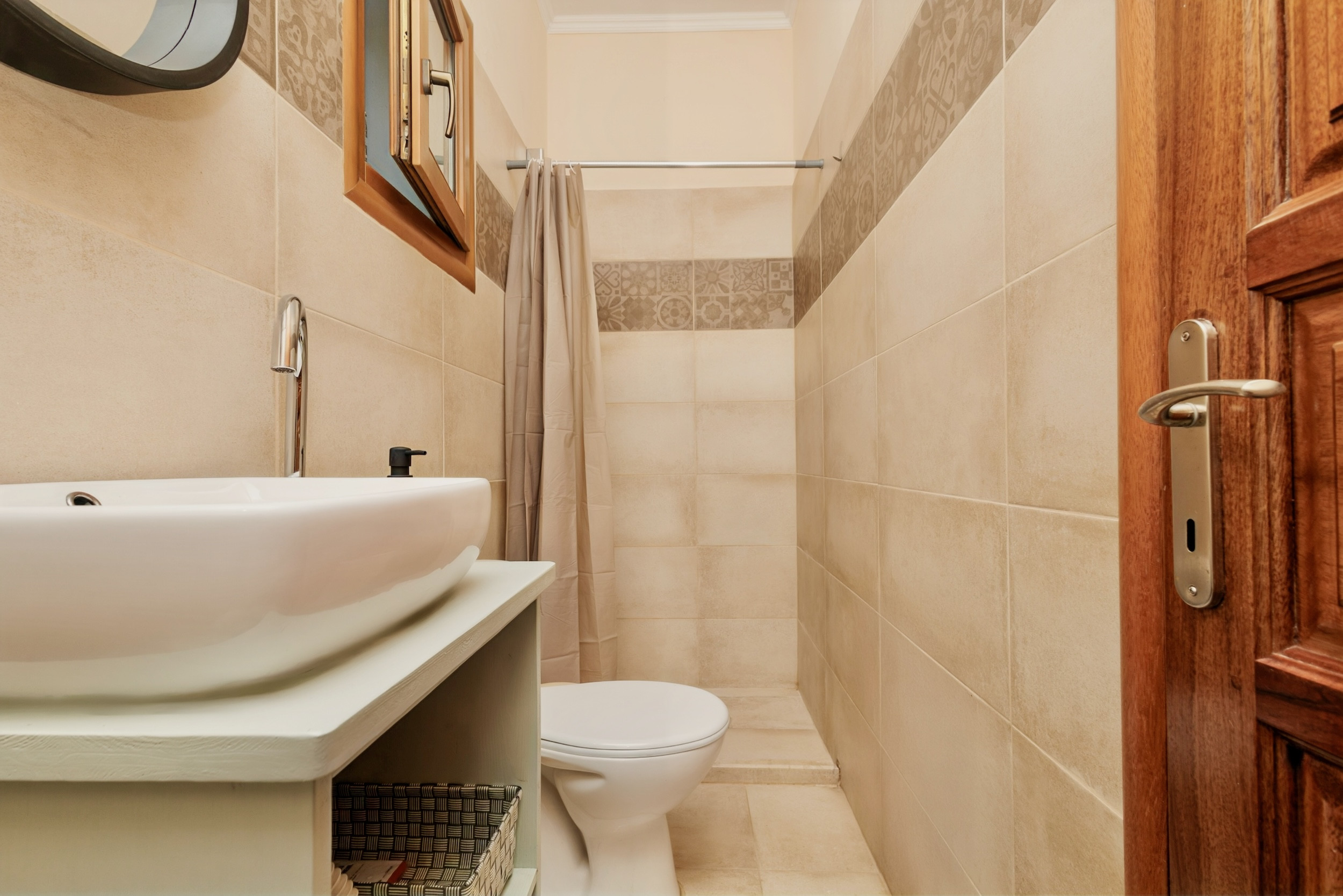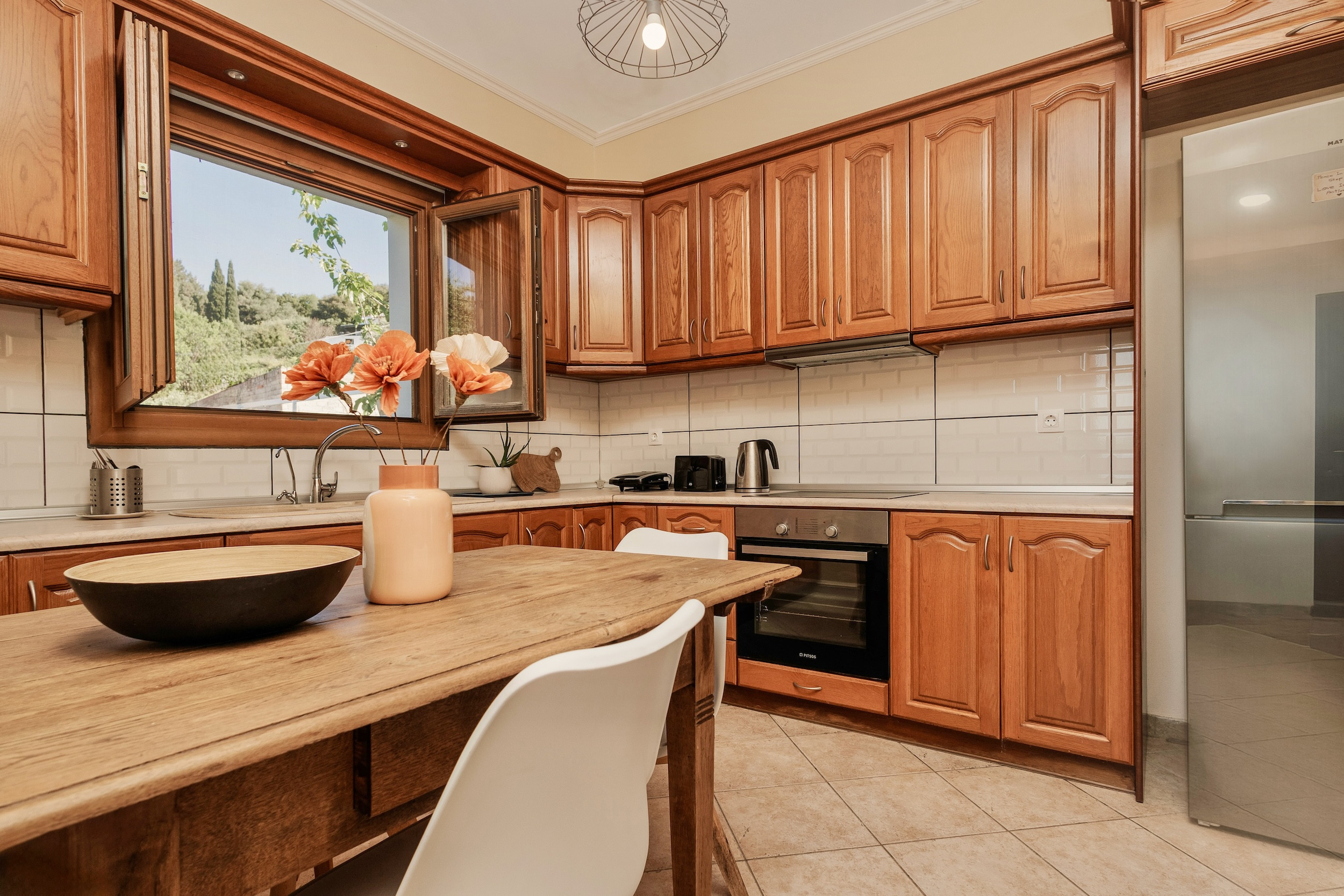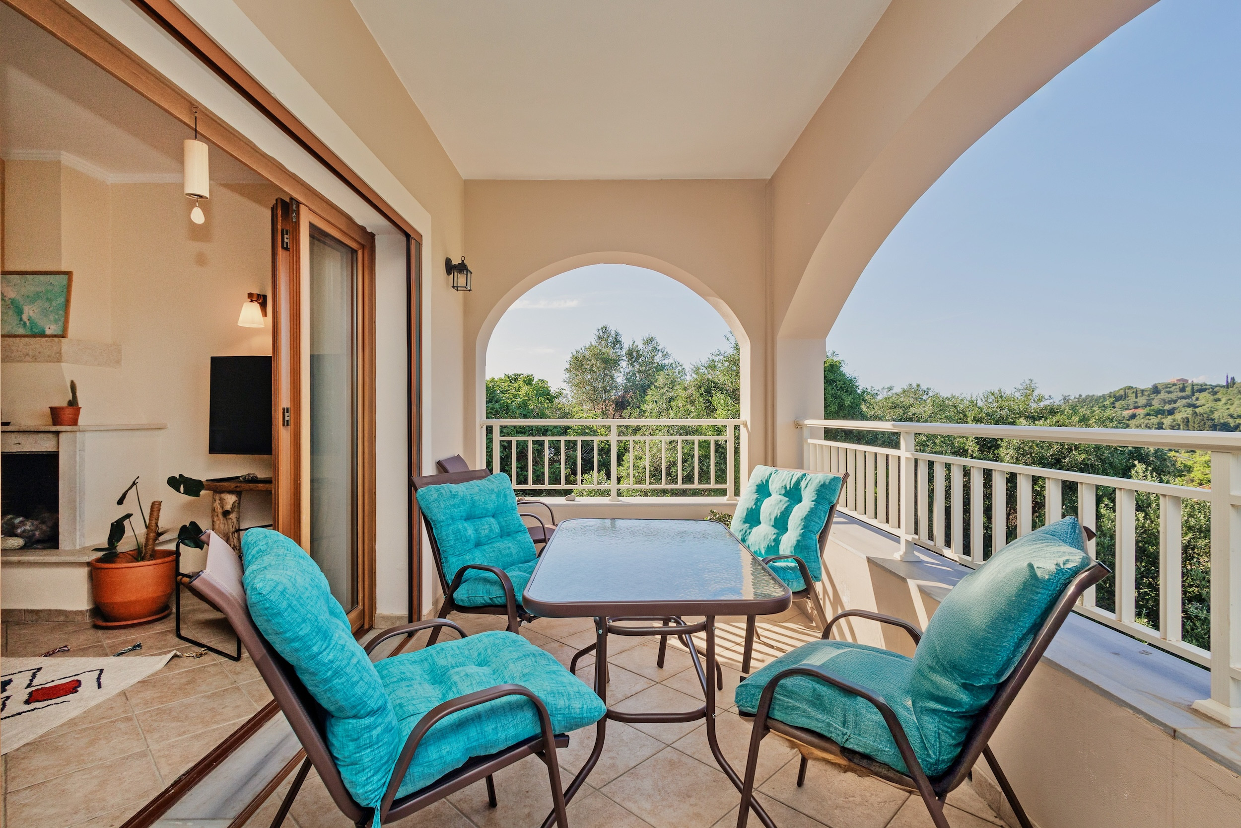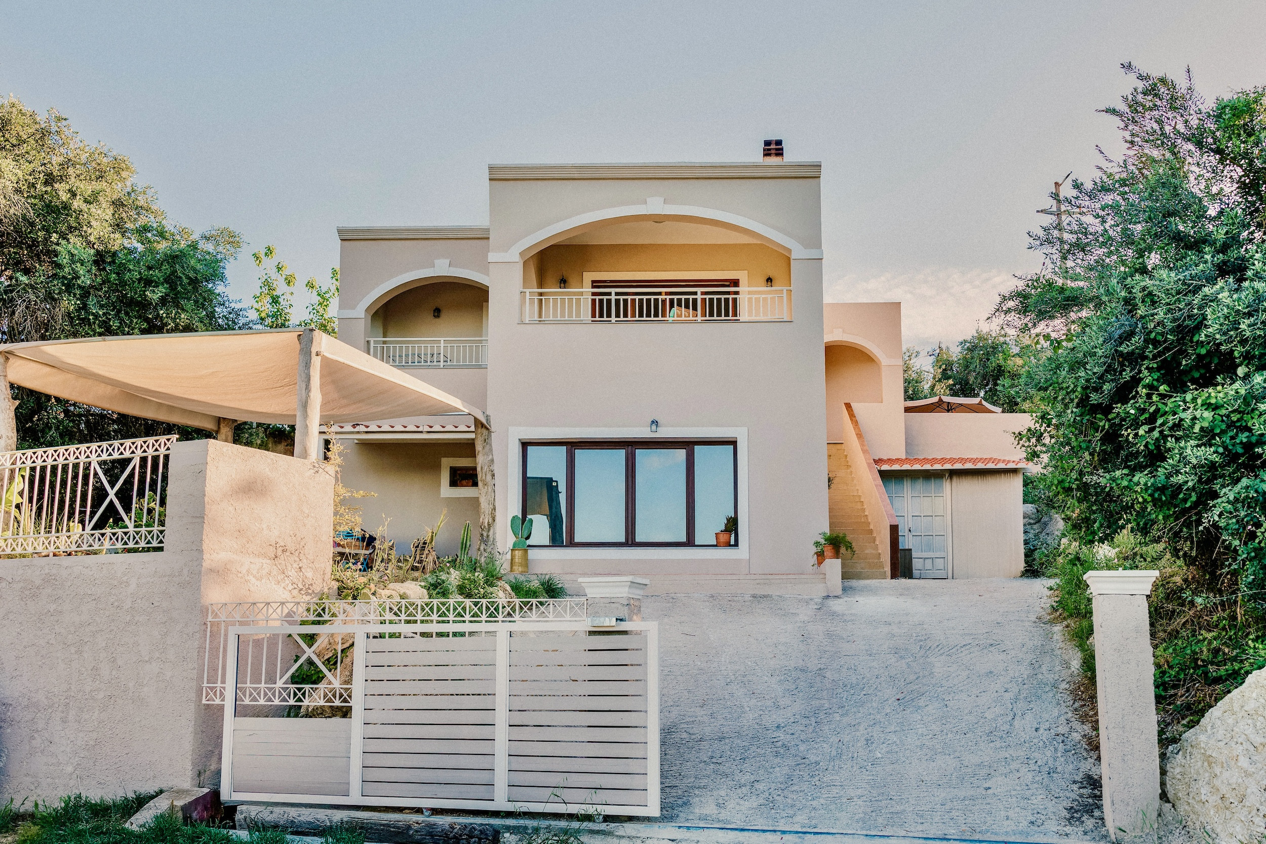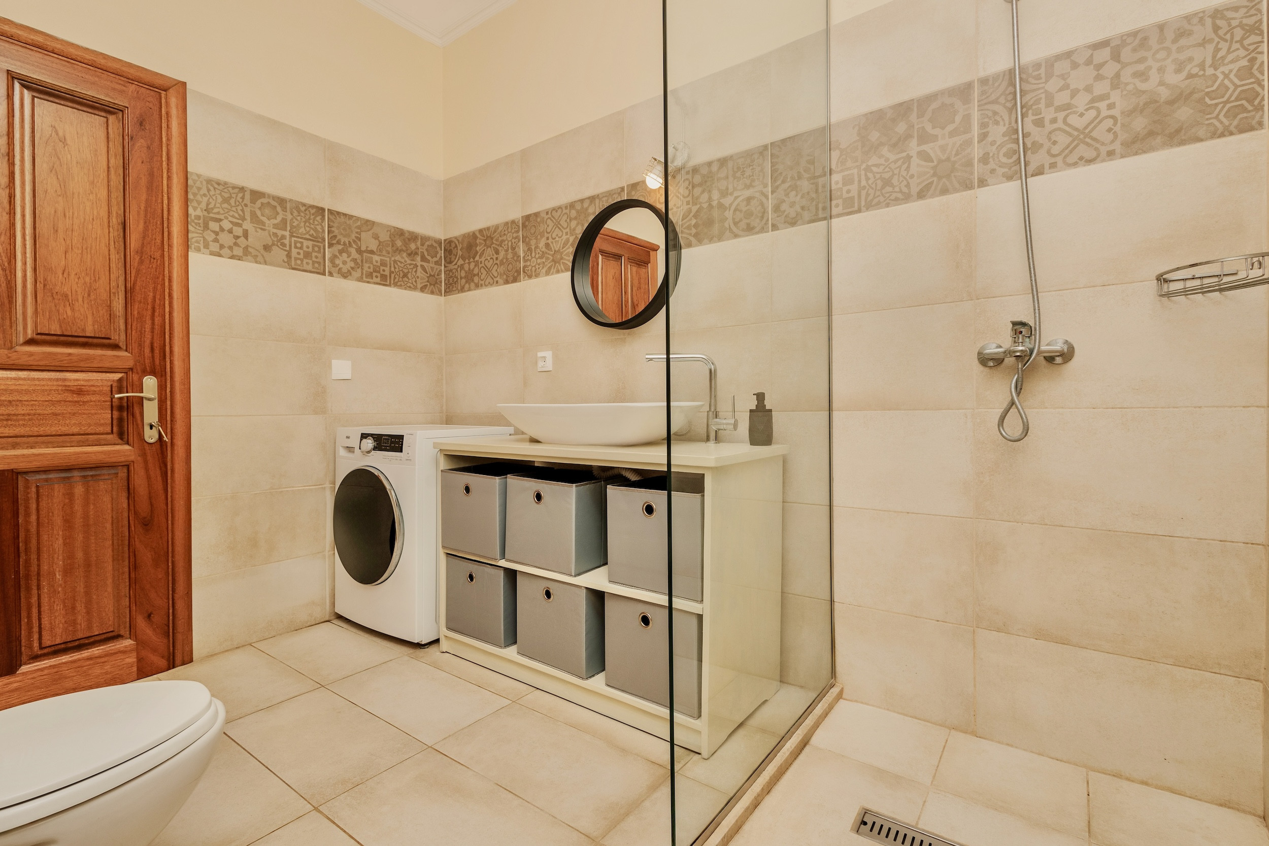 Inside, the property is set over 2 floors, not connected from the inside, rented together as a whole detached villa with private pool. The lower floor comprises a large, self contained studio with double bed, lounge area with extra single sofa bed (9th guest), and a shower room. Large doors open straight to the landscaped outdoor areas. The upper floor comprises the main accommodation. There is a spacious kitchen, fully equipped, a beautifully furnished lounge with dining area (including smart TV), panoramic terraces and 3 bedrooms with 2 bathrooms. The bedrooms are respectively 2 doubles and one twin. One of the double bedrooms has its own e-suite bathroom while the other 2 bedrooms share the second shower room. For the comfort of the guests, the whole property is air-conditioned. The interiors are airy, cozy, welcoming and cheerful, the perfect combination to fully enjoy a Mediterranean holiday.