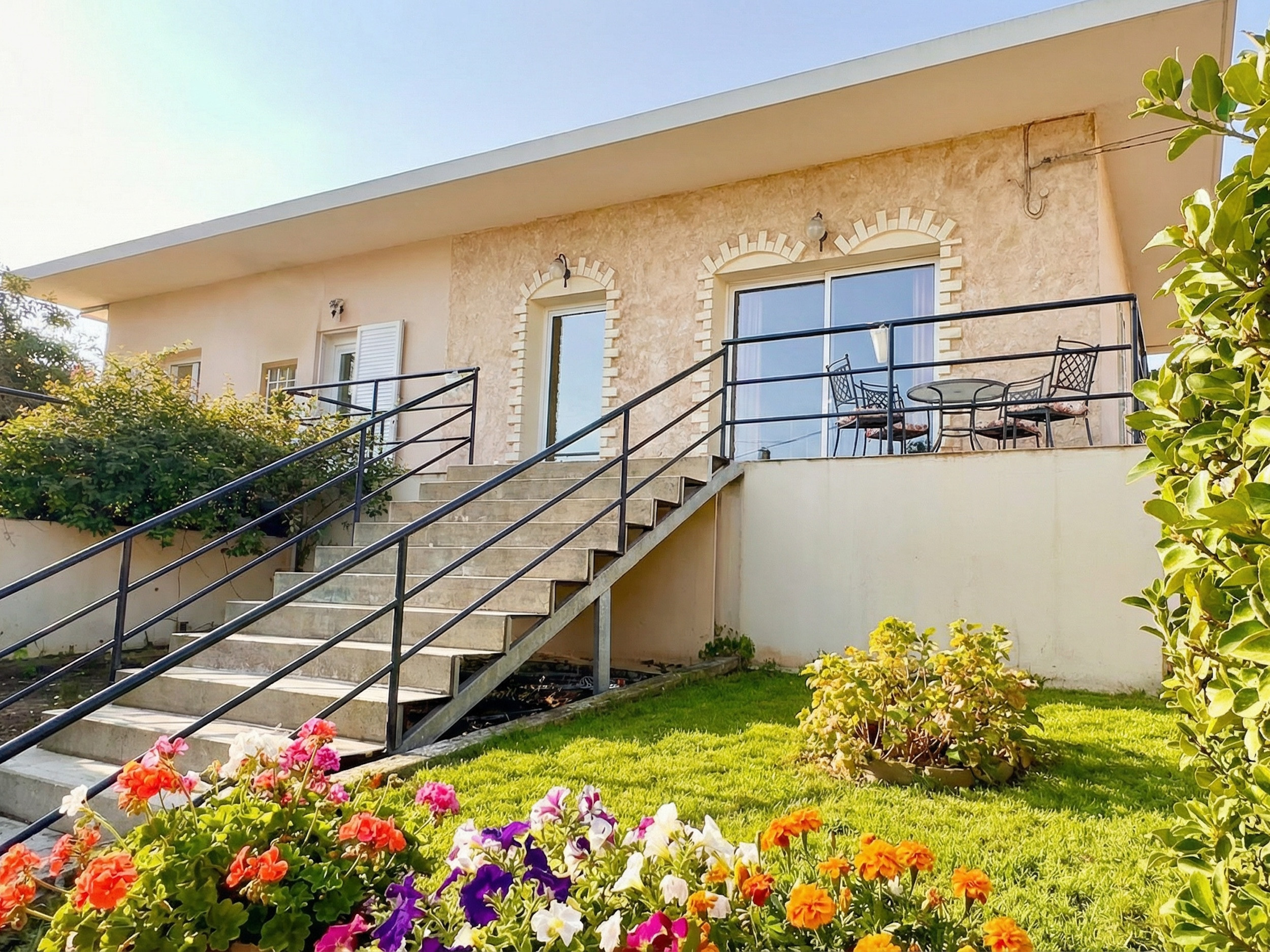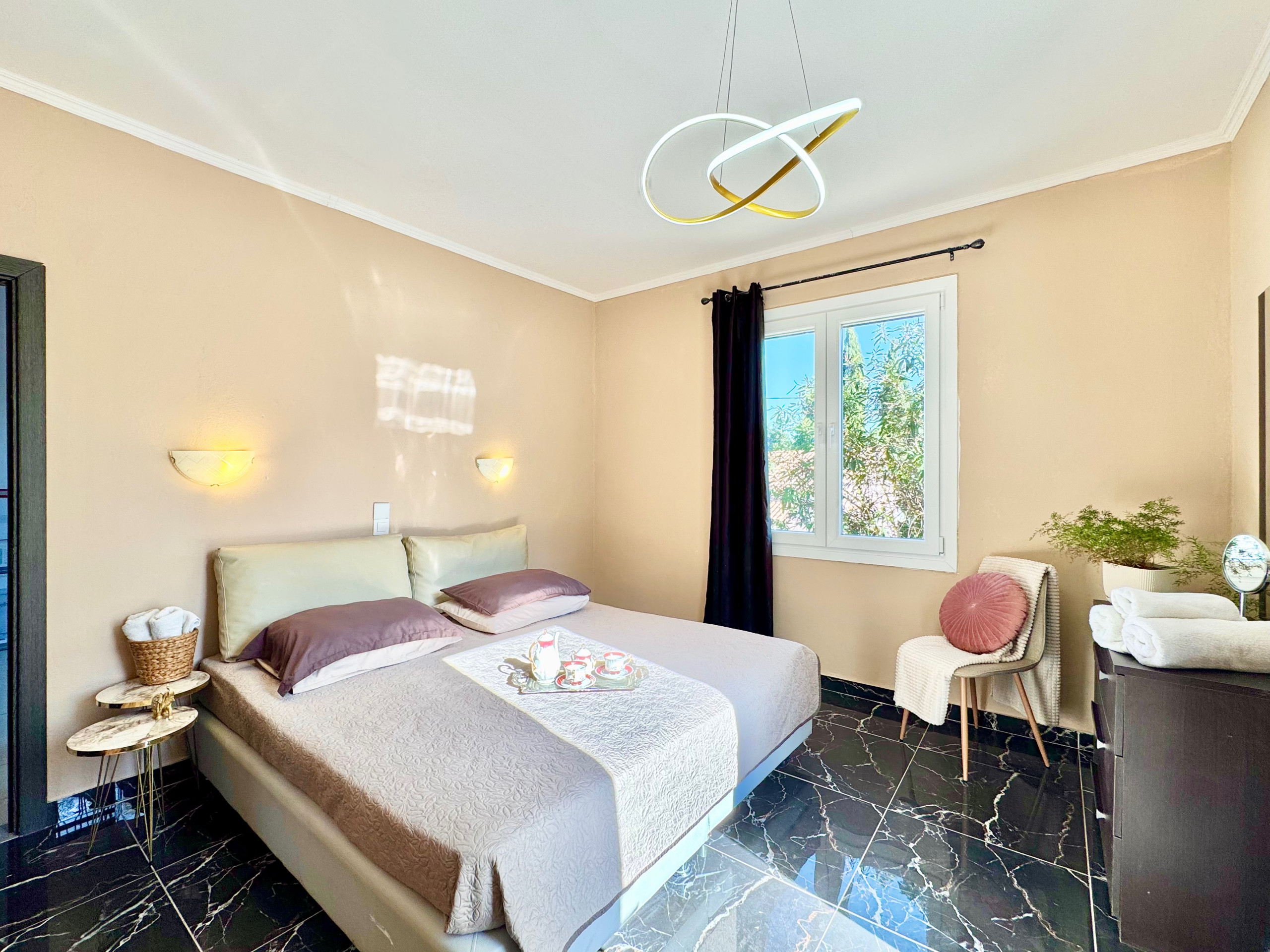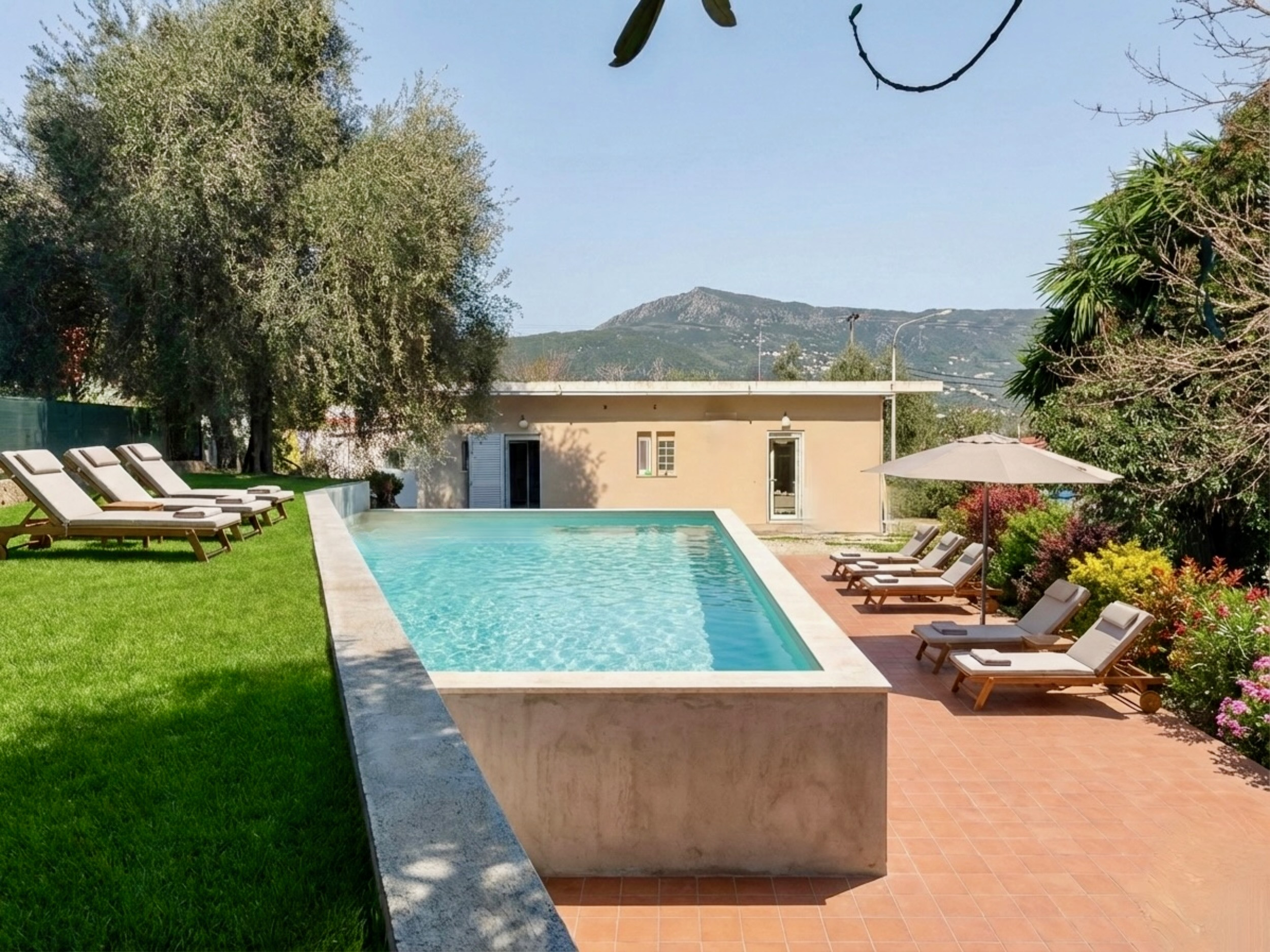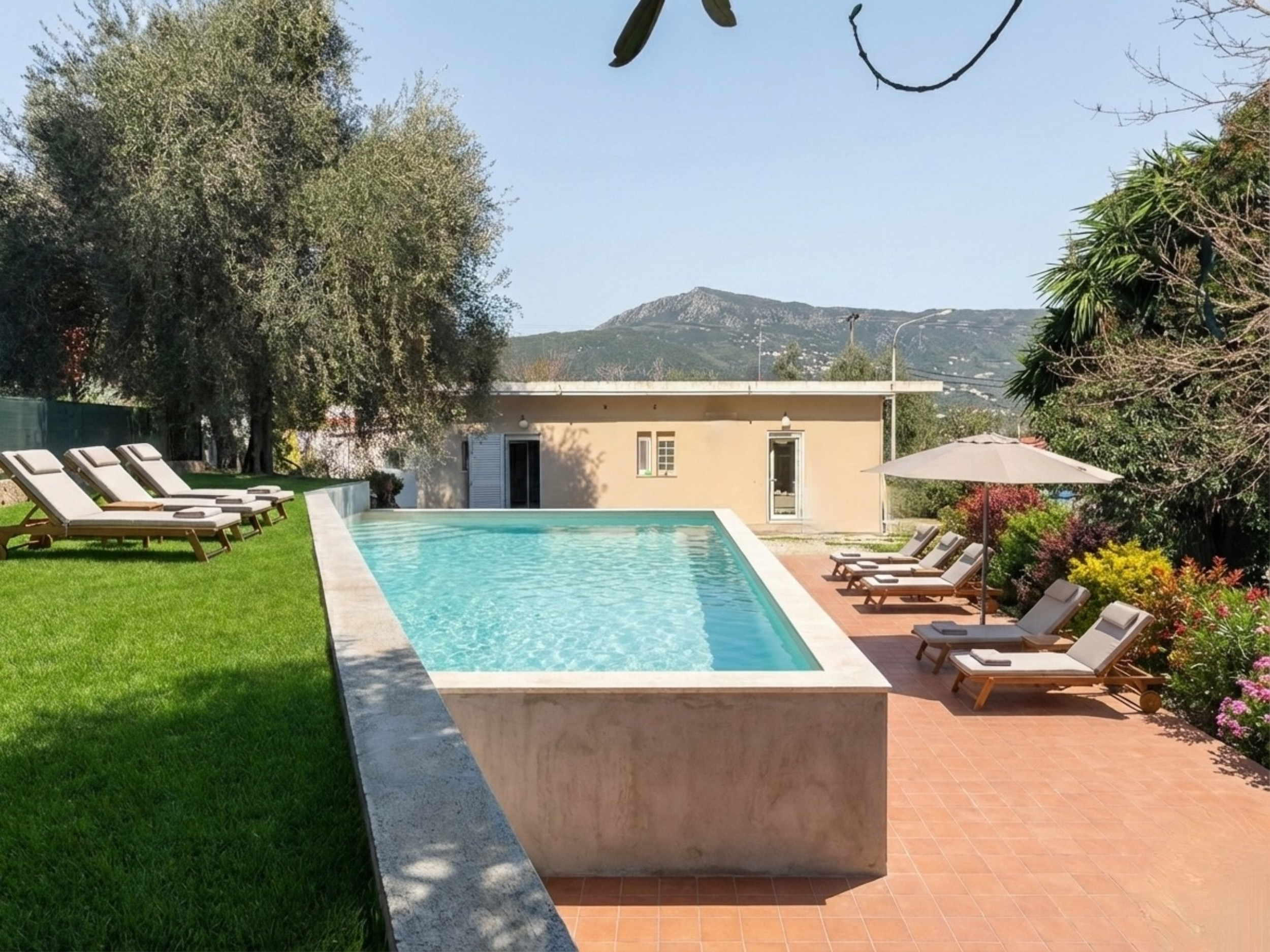 Inside, Villa Verve is set over one floor and has been modernly, fully renovated to offer a superior holiday experience. The airy lounge area, with smart TV and comfy sofas, has an adjoining fully equipped kitchen and dining area for 8/10 opening straight to the large front patio. There are 5 bedrooms in total (one of which is self contained in a lovely suite with its own separate entrance). The main accommodation comprises bedrooms, 4 bedrooms, 3 doubles and one with twin beds. The master bedroom suite has its own shower room (wet room), while the other 2 double bedrooms share a bathroom with shower (one of the double bedrooms also features an attractive bathtub within the room). The twin bedroom has its own shower room (please note that this bedroom, due to the layout of the house, does not have a window while it is air conditioned and equipped with aeration system). The villa also offers a suite with its own entrance which is perfect for a couple looking for extra privacy. It features a double bed, a seating area, an extra kitchenette and a bathroom with shower. Of course the property is rented as a whole, to accommodate up to 10 guests, and not separately. During the renovation, particular care has been given to the details and the decor, turning Villa Verve into one of the most attractive and well located holiday homes of the area, providing unbeatable value for money. For extra comfort, the property is fully air-conditioned, both in the bedrooms and lounge area (included in the rental price).