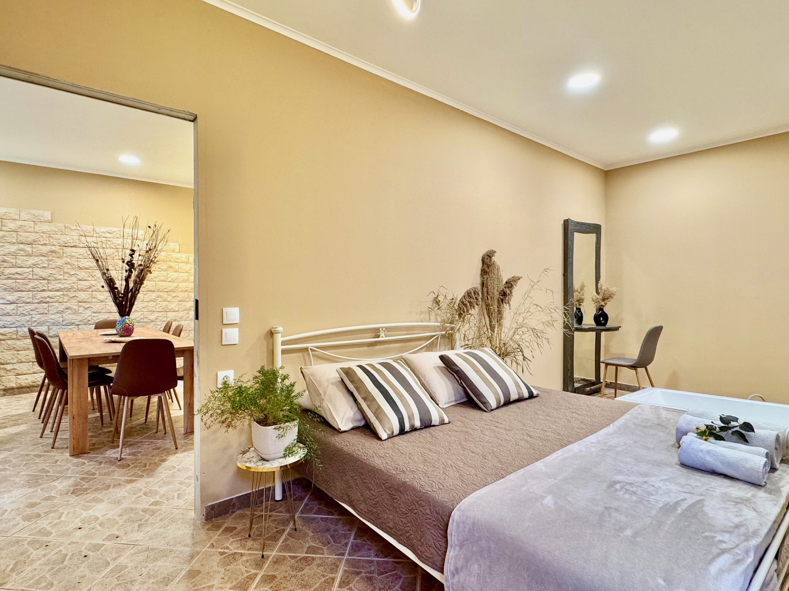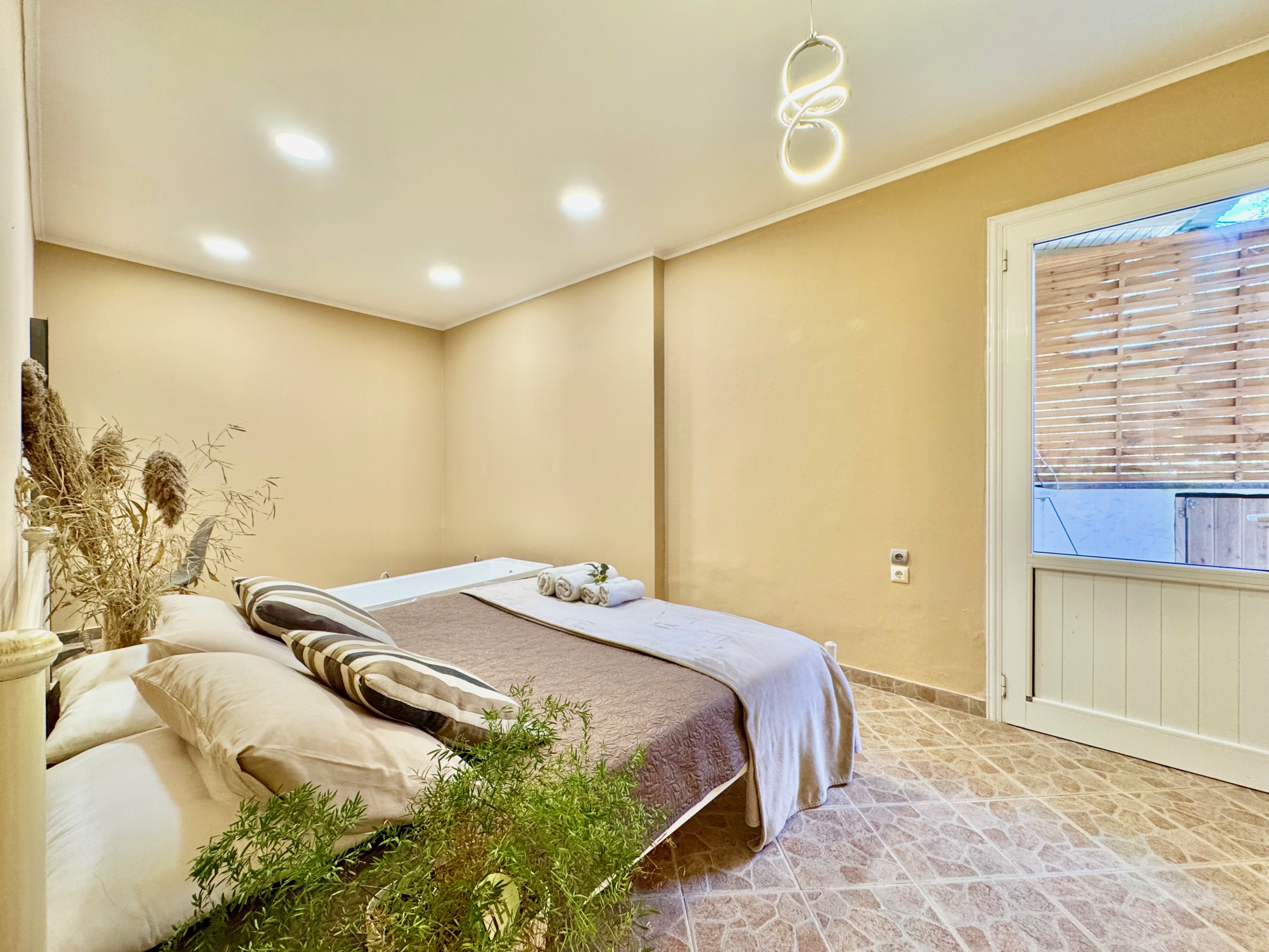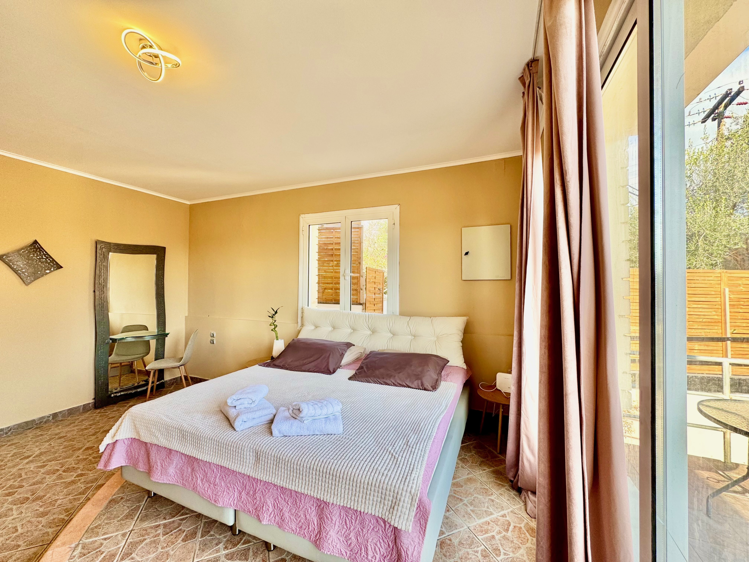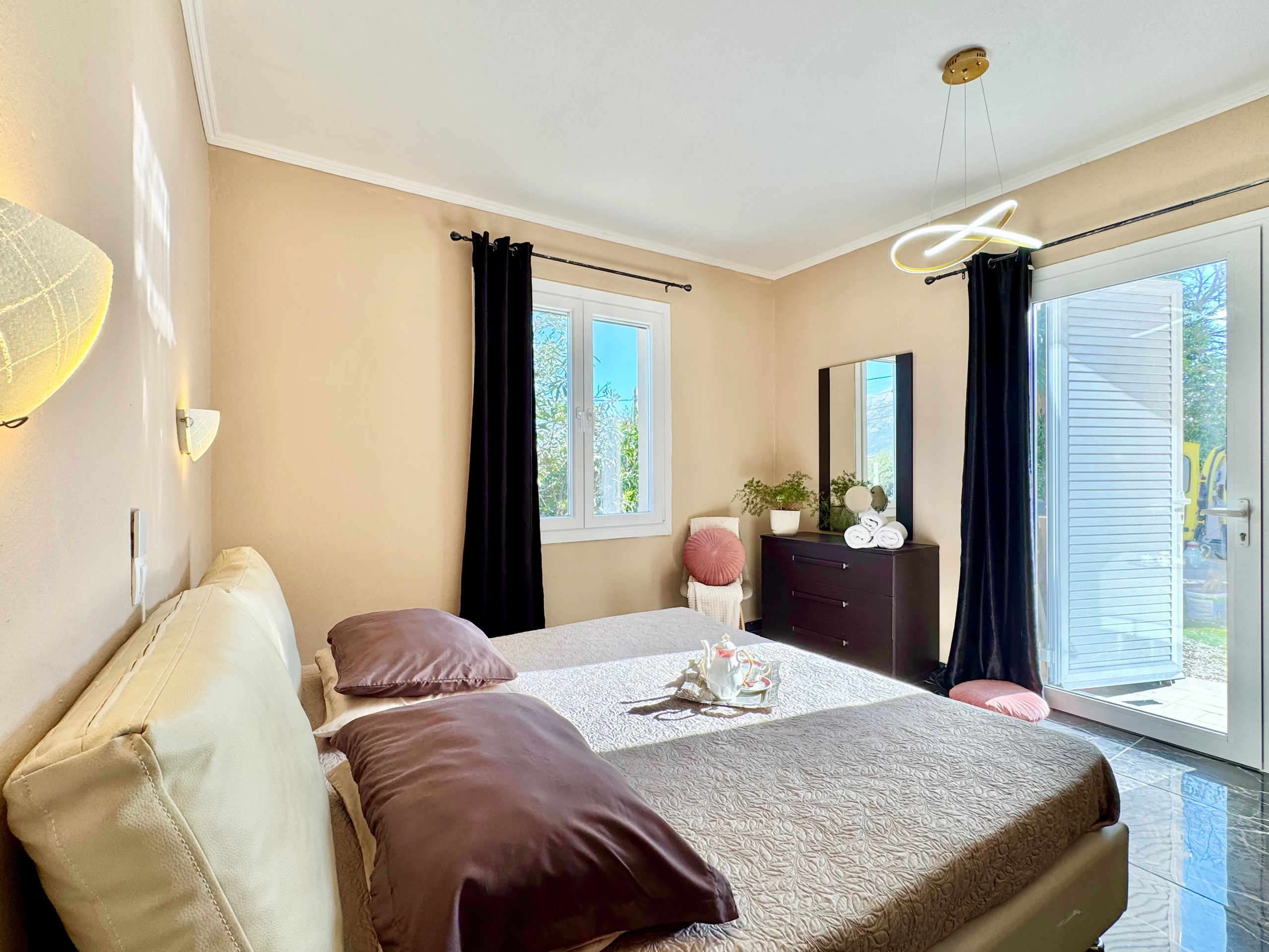 Inside, Villa Verve is set over one floor and has been modernly, fully renovated to offer a superior holiday experience. The airy lounge area, with smart TV and comfy sofas, has an adjoining fully equipped kitchen and dining area for 8/10 opening straight to the large front patio. There are 5 bedrooms in total (one of which is self contained in a lovely suite with its own separate entrance). The main accommodation comprises bedrooms, 4 bedrooms, 3 doubles and one with twin beds. The master bedroom suite has its own shower room (wet room), while the other 2 double bedrooms share a bathroom with shower (one of the double bedrooms also features an attractive bathtub within the room). The twin bedroom has its own shower room (please note that this bedroom, due to the layout of the house, does not have a window while it is air conditioned and equipped with aeration system). The villa also offers a suite with its own entrance which is perfect for a couple looking for extra privacy. It features a double bed, a seating area, an extra kitchenette and a bathroom with shower. Of course the property is rented as a whole, to accommodate up to 10 guests, and not separately. During the renovation, particular care has been given to the details and the decor, turning Villa Verve into one of the most attractive and well located holiday homes of the area, providing unbeatable value for money. For extra comfort, the property is fully air-conditioned, both in the bedrooms and lounge area (included in the rental price).