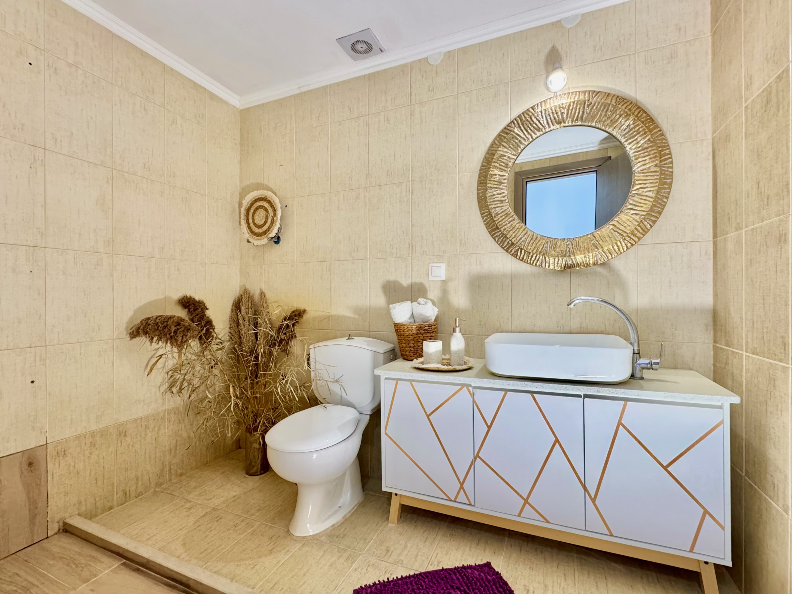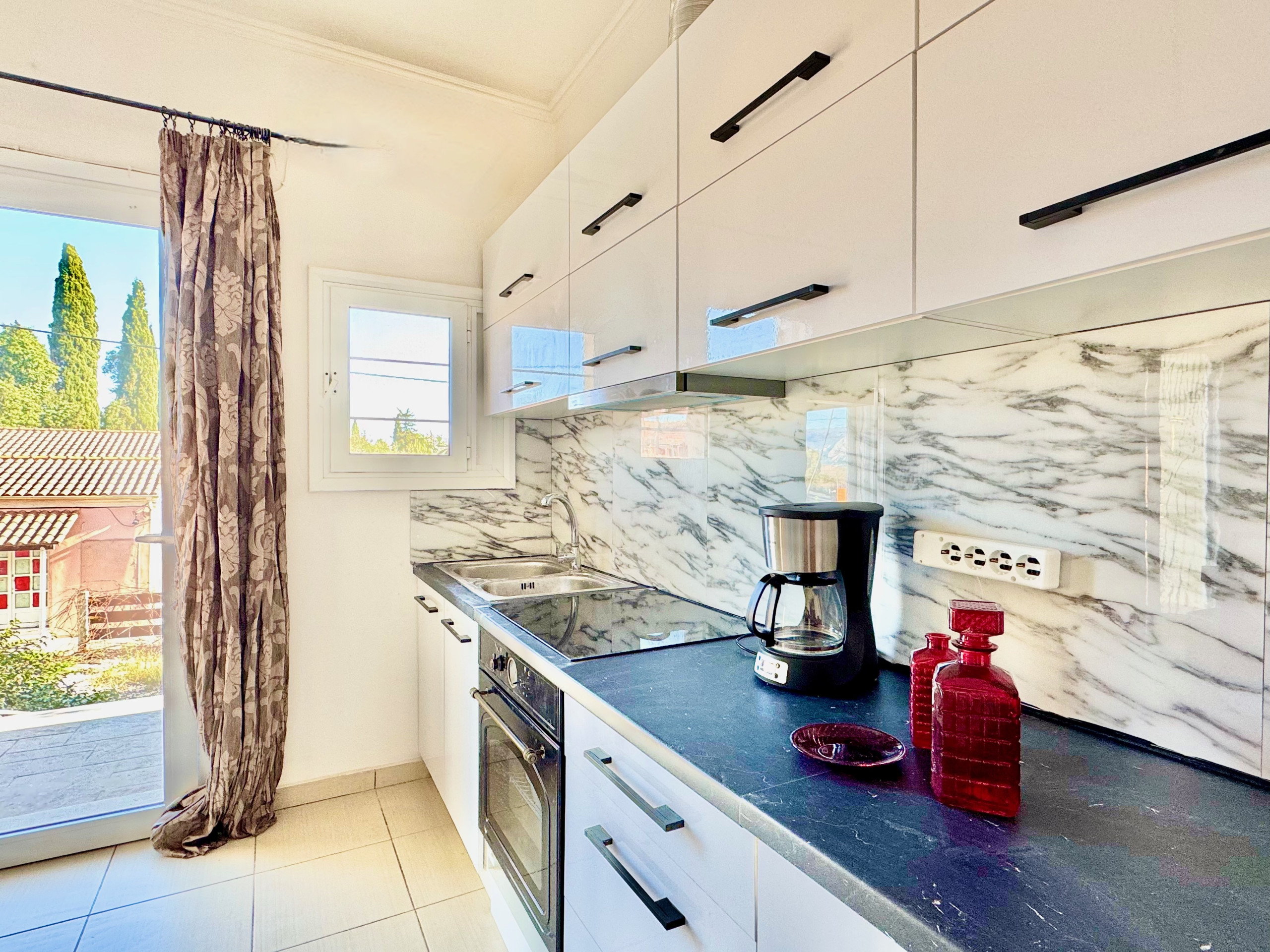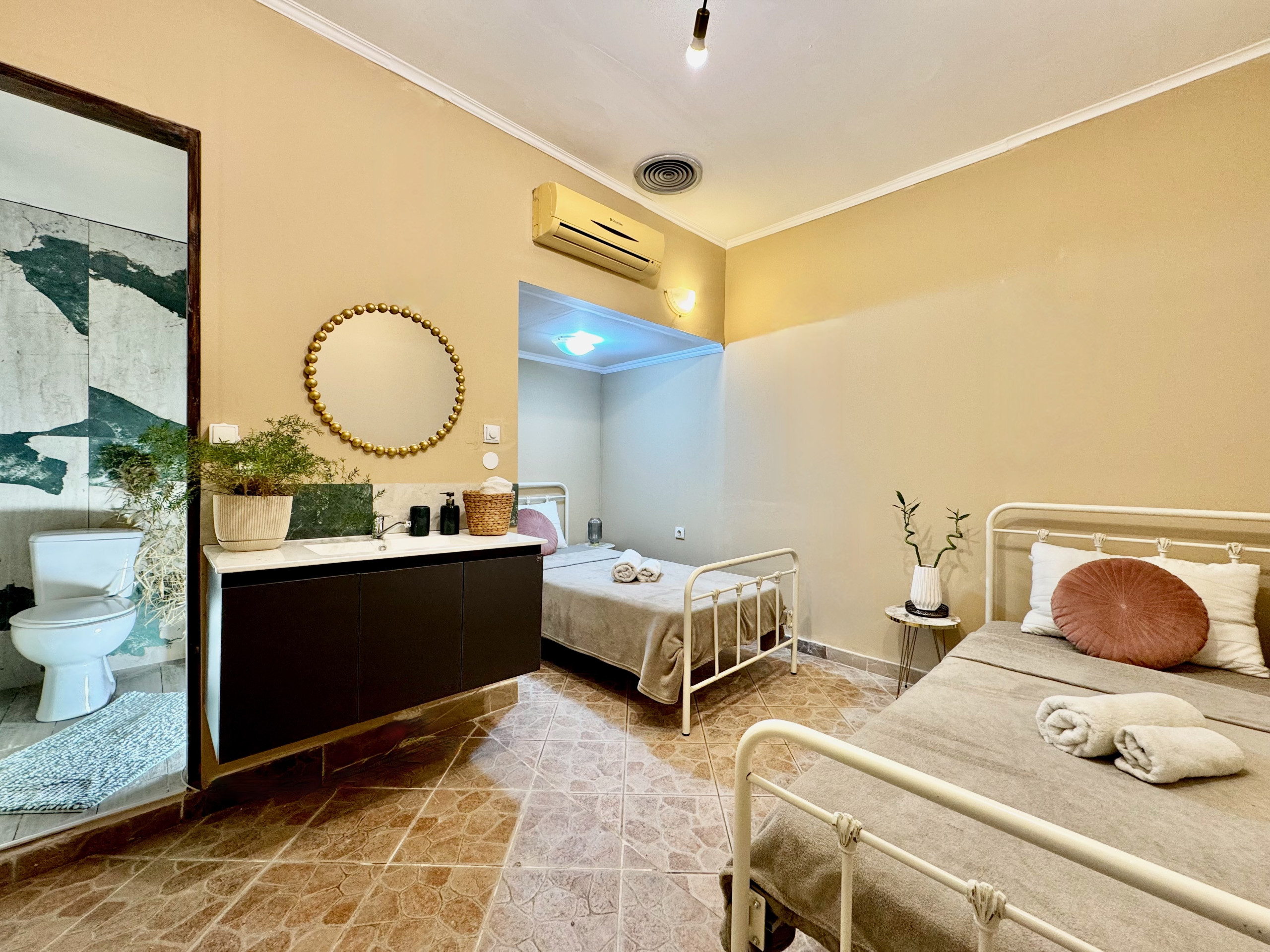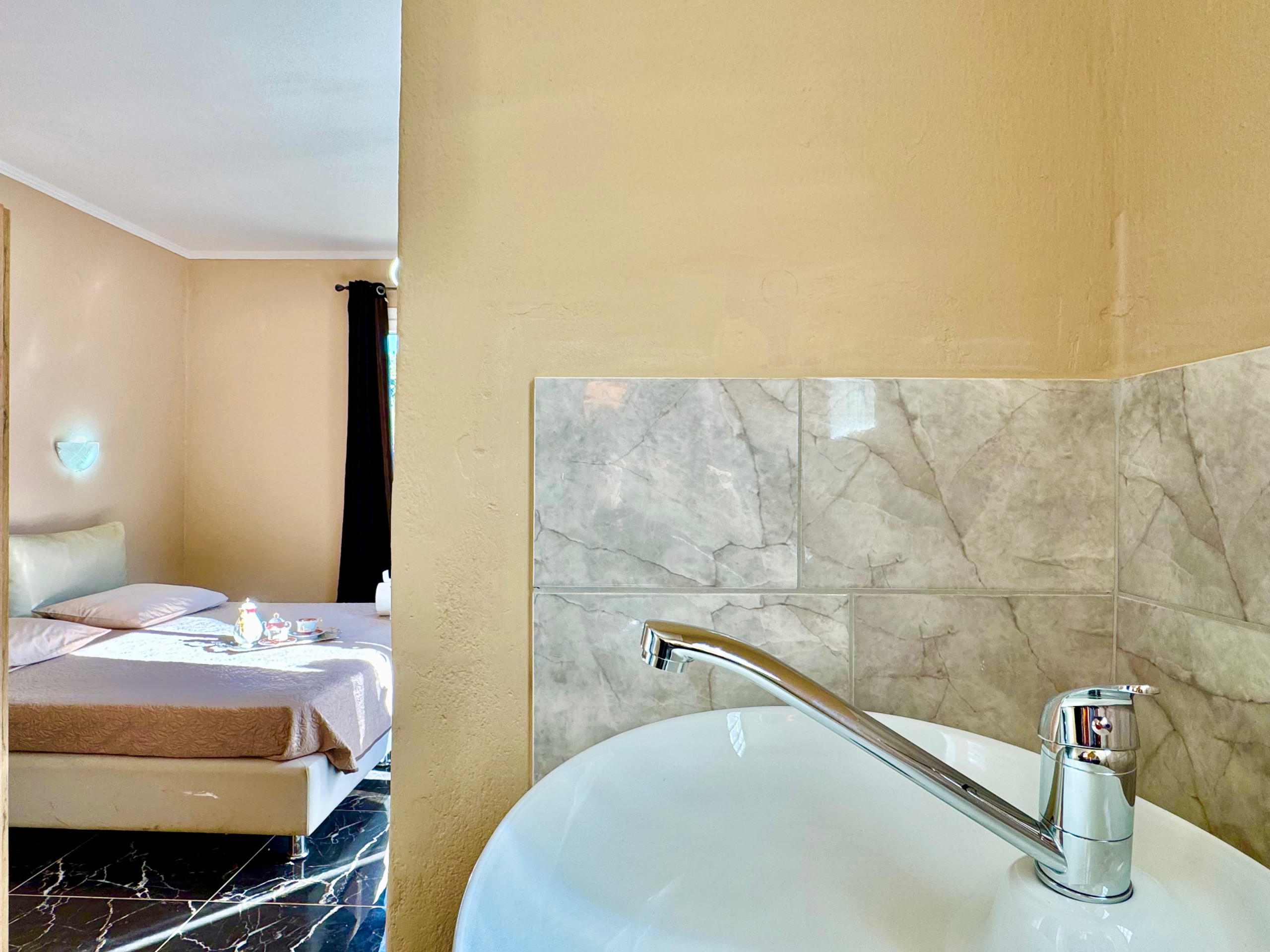 Inside, Villa Verve is set over one floor and has been modernly, fully renovated to offer a superior holiday experience. The airy lounge area, with smart TV and comfy sofas, has an adjoining fully equipped kitchen and dining area for 8/10 opening straight to the large front patio. There are 5 bedrooms in total (one of which is self contained in a lovely suite with its own separate entrance). The main accommodation comprises bedrooms, 4 bedrooms, 3 doubles and one with twin beds. The master bedroom suite has its own shower room (wet room), while the other 2 double bedrooms share a bathroom with shower (one of the double bedrooms also features an attractive bathtub within the room). The twin bedroom has its own shower room (please note that this bedroom, due to the layout of the house, does not have a window while it is air conditioned and equipped with aeration system). The villa also offers a suite with its own entrance which is perfect for a couple looking for extra privacy. It features a double bed, a seating area, an extra kitchenette and a bathroom with shower. Of course the property is rented as a whole, to accommodate up to 10 guests, and not separately. During the renovation, particular care has been given to the details and the decor, turning Villa Verve into one of the most attractive and well located holiday homes of the area, providing unbeatable value for money. For extra comfort, the property is fully air-conditioned, both in the bedrooms and lounge area (included in the rental price).