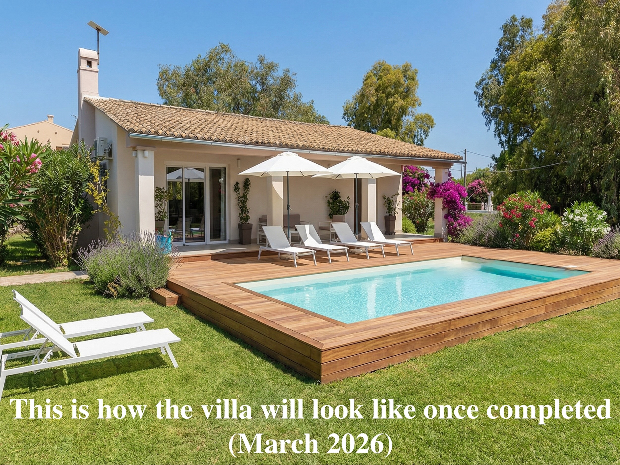 Inside, the villa is modern and finished with care and style. Totally rebuilt in 2025, it offers fully air-conditioned interiors (individually controlled, both in bedrooms and in the lounge) and contemporary decor. There are 2 spacious double bedrooms (with TV), a well equipped kitchen with adjoining dining area as well ad seating area with a comfortable double sofa bed and large flat screen smart tv, family bathroom with shower. Extensive furnished terraces surround the villa for extra excitement all summer long.This is the unbeatable value of Villa Sunlight: being a private villa in a quiet and relaxing spot, yet in the very heart of Sidari and steps away from anything you can imagine. An opportunity not to be missed!