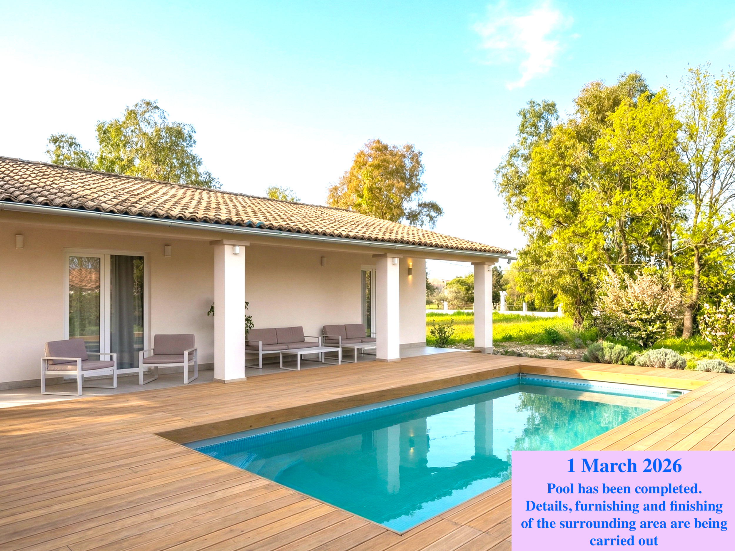 Outside, Villa Cocoon offers to its guests extensive private grounds with lawn, shrubs, flowers. A beautiful private pool with shades and sunbeds is available for the exclusive use of the guests. It measures 8m x 4m and depth is 1.5m. It is the perfect place to relax and unwind surrounded by the green countryside. Yet, with so many sandy beaches in the surroundings, the choice will be hard! A brick-built barbecue with oven and outdoor dining area are also available for the guests to enjoy delicious al-fresco meals. Free private parking within the grounds.