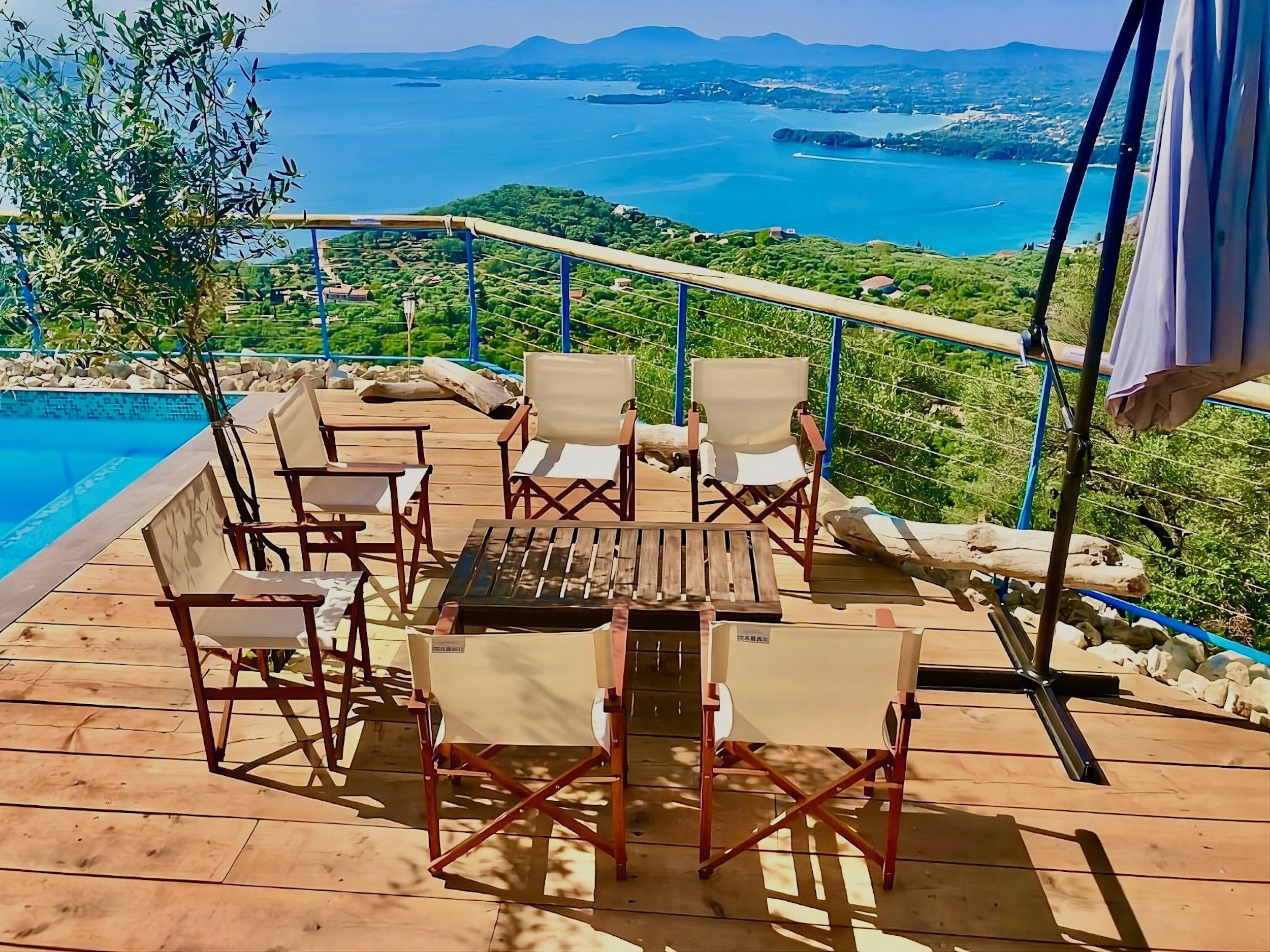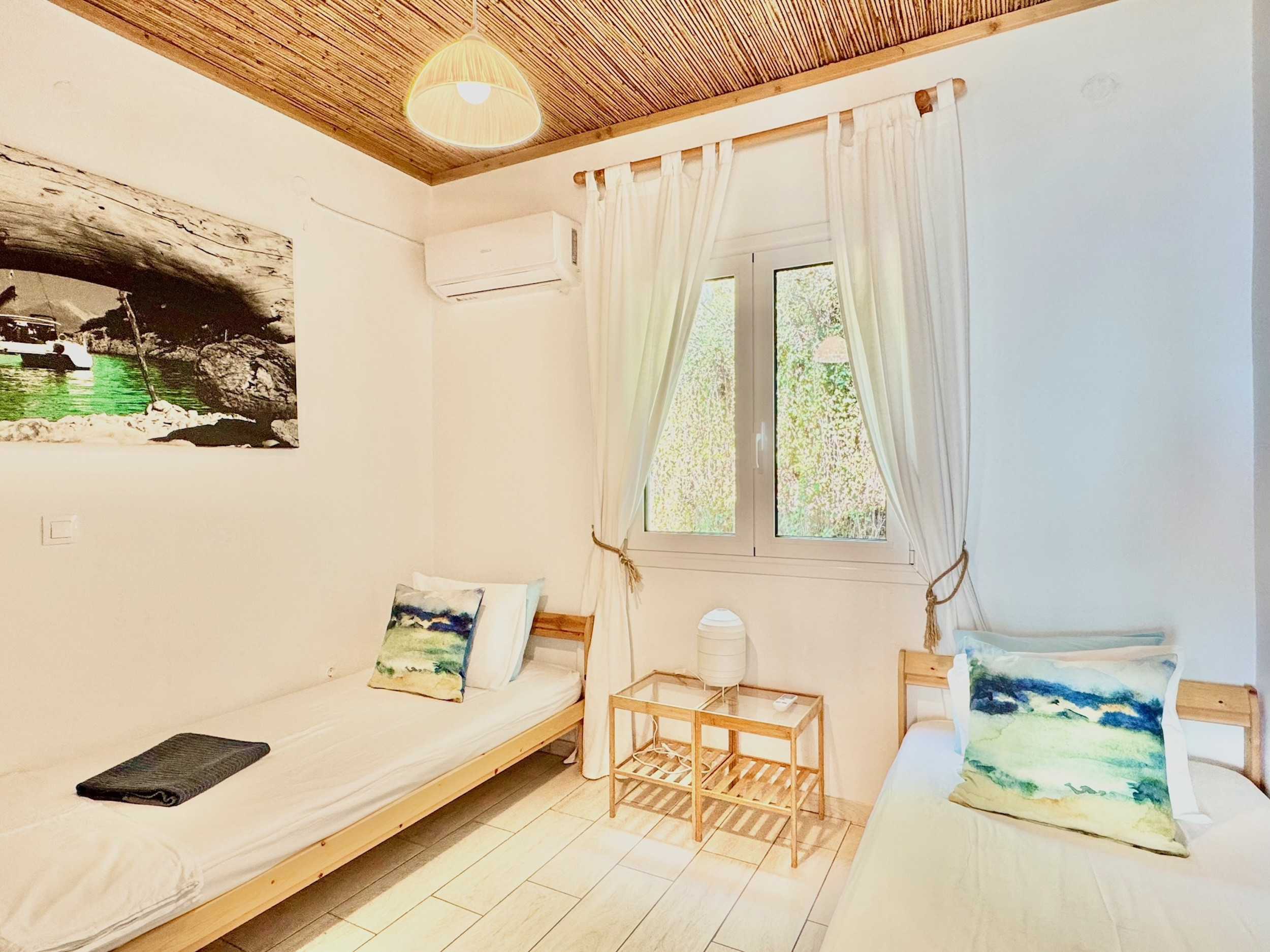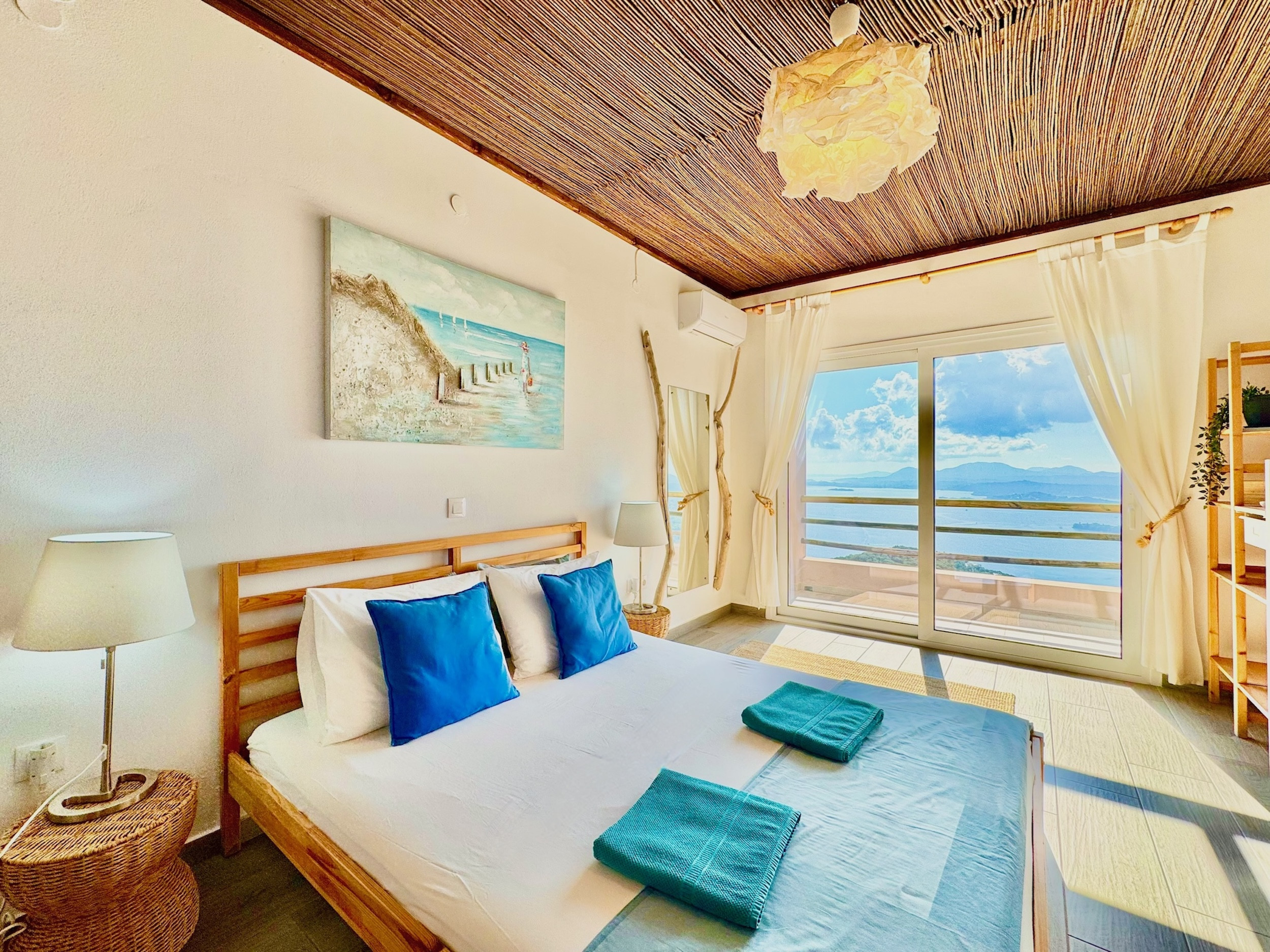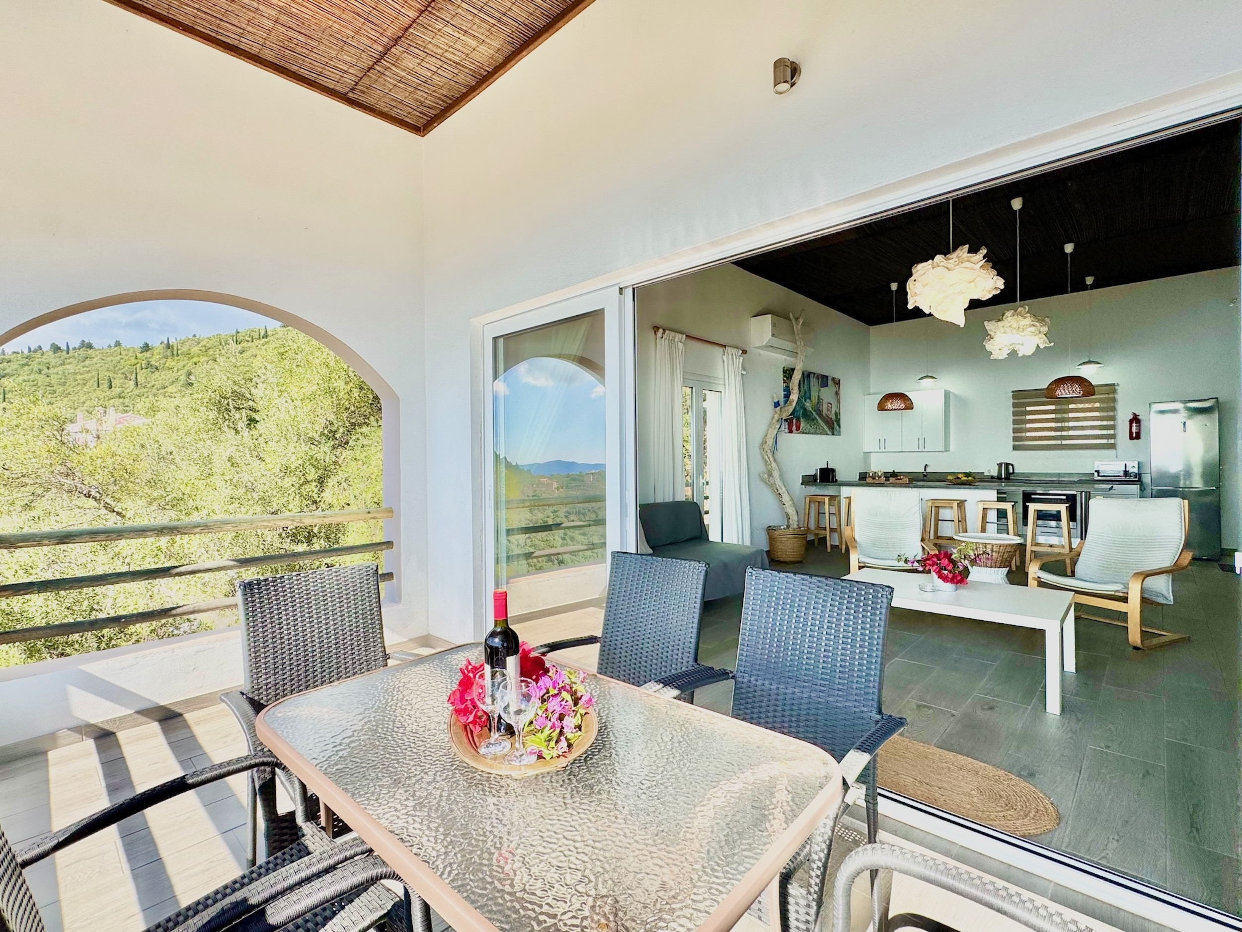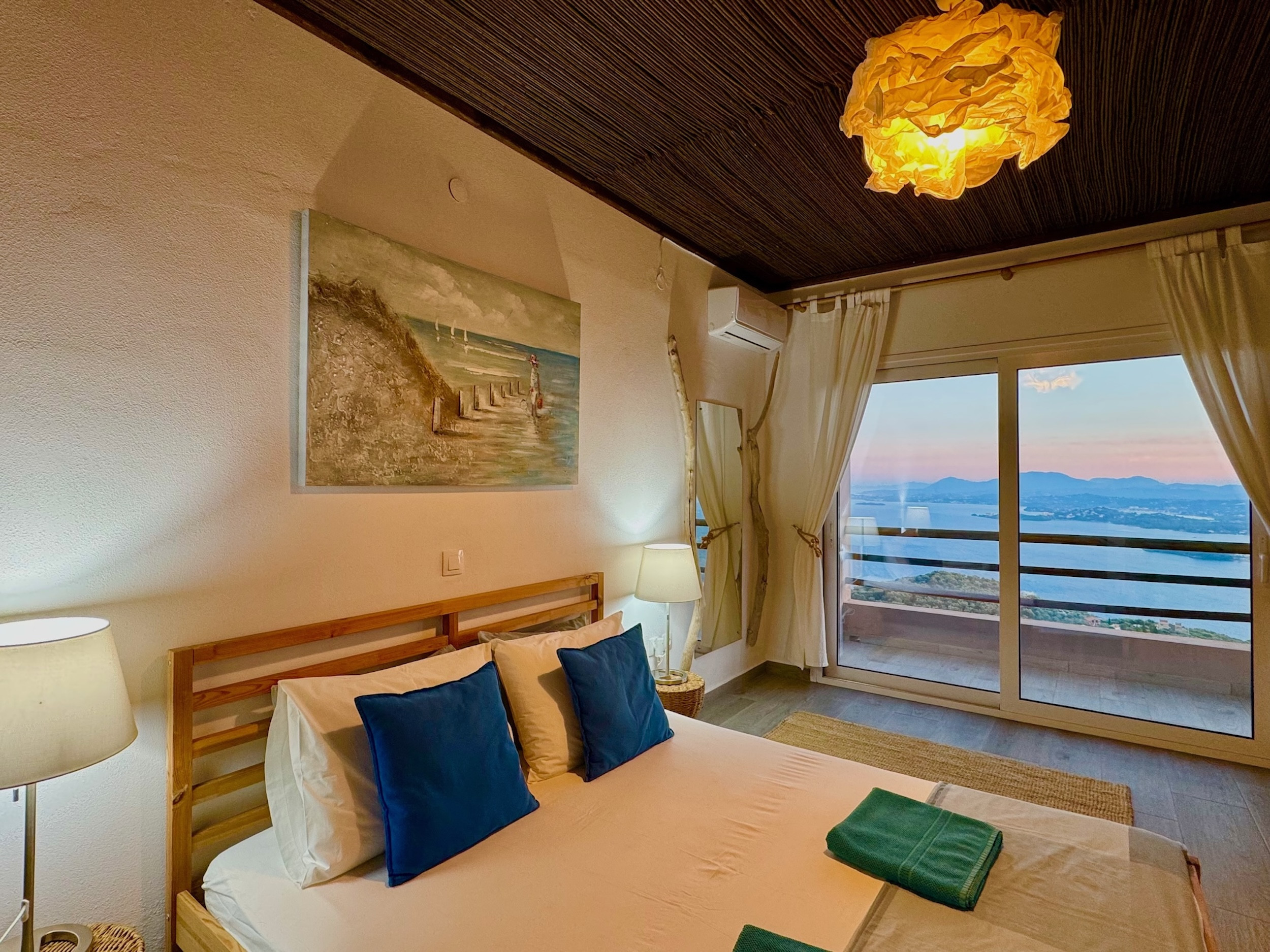Inside, the property has been cleverly designed to accommodate up to 13 guests in 6 bedrooms, yet providing privacy when required or at night: it is in fact composed by 2 self contained units with 3 bedrooms and 2 bathrooms each, rented together as a whole, independent villa with private pool. The units cannot be rented individually. Each of the 2 identical units enjoys a sensational open-plan lounge with adjoining fully equipped kitchen and dining area, comfortable sofas, smart TV and patio doors leading out to the panoramic terrace, a delight both during day and night. An hallway leads then to the 3 bedrooms (2 doubles with panoramic terrace, 1 twin) and the 2 bathrooms (one with bathtub and one with shower) for a total of 6 bedrooms and 4 bathrooms. An extra guest can be accommodated on a folding z-bed provided free of charge (mostly suitable for a child). For the comfort of our guests, the whole property is air-conditioned, both in the bedrooms and lounge areas. Starlink fast internet is provided. The property has been beautifully furnished in traditional Greek colors and is full of light: the perfect connection between the green of the corfiot hills and the blue of the sea.