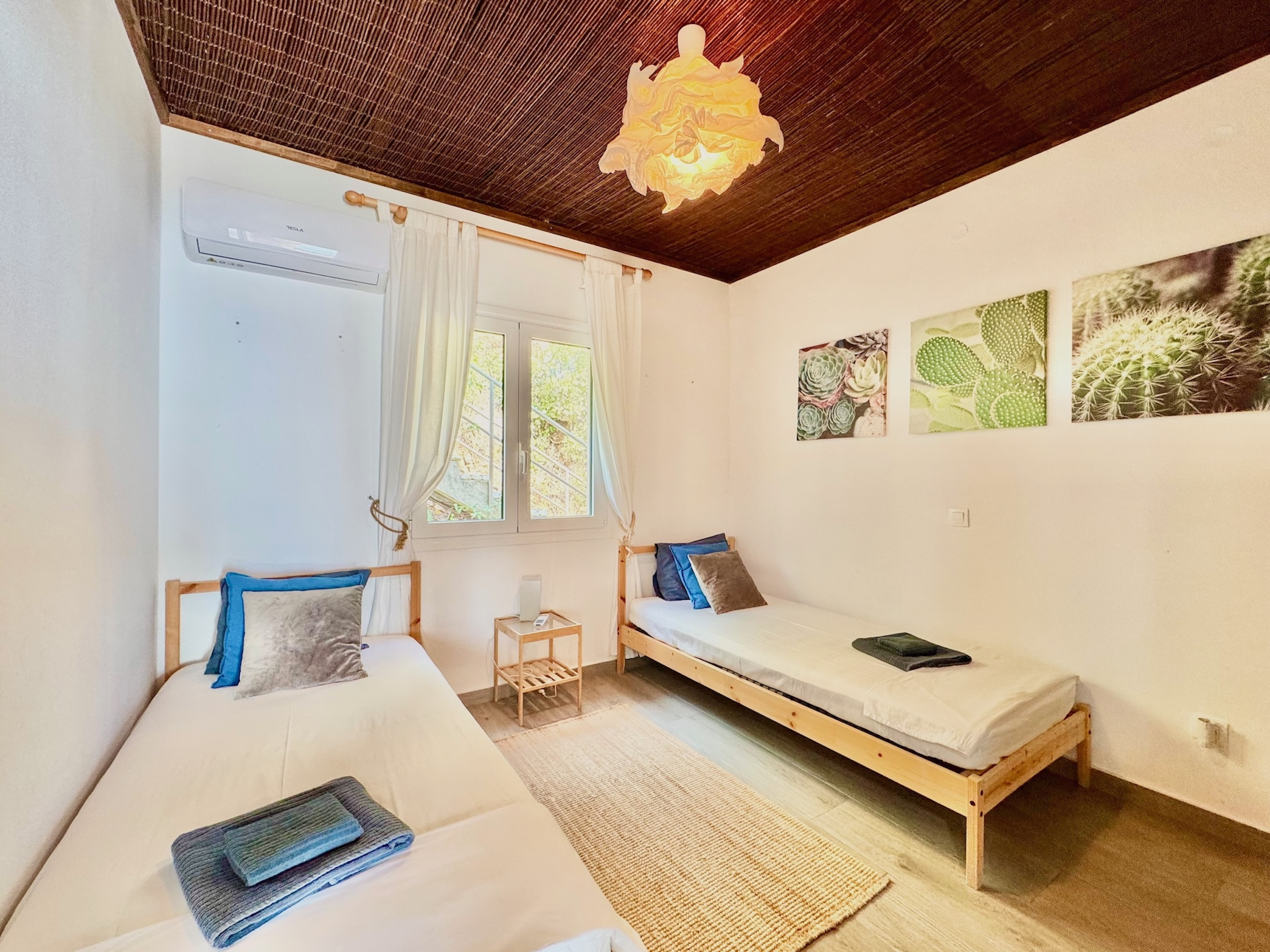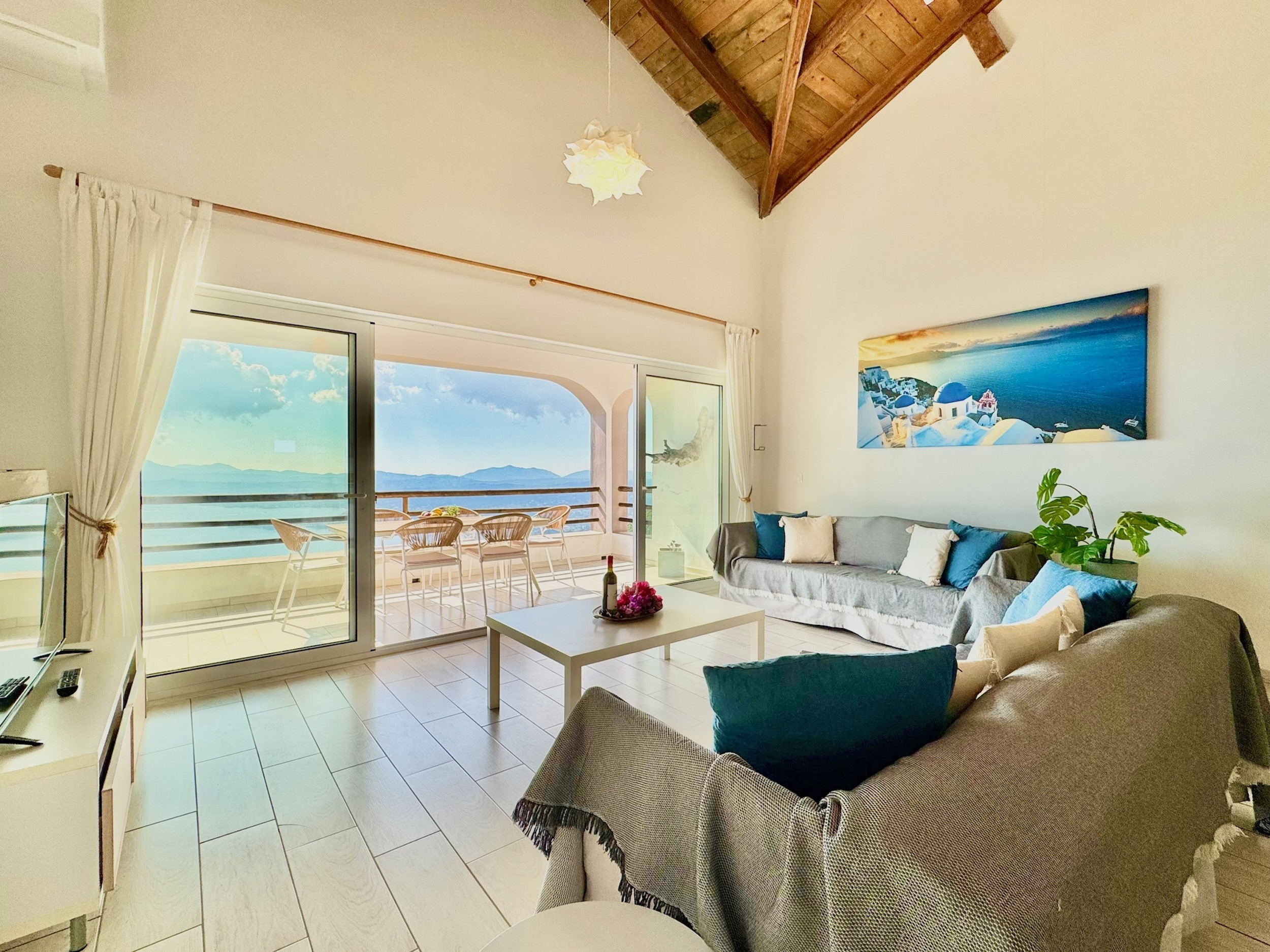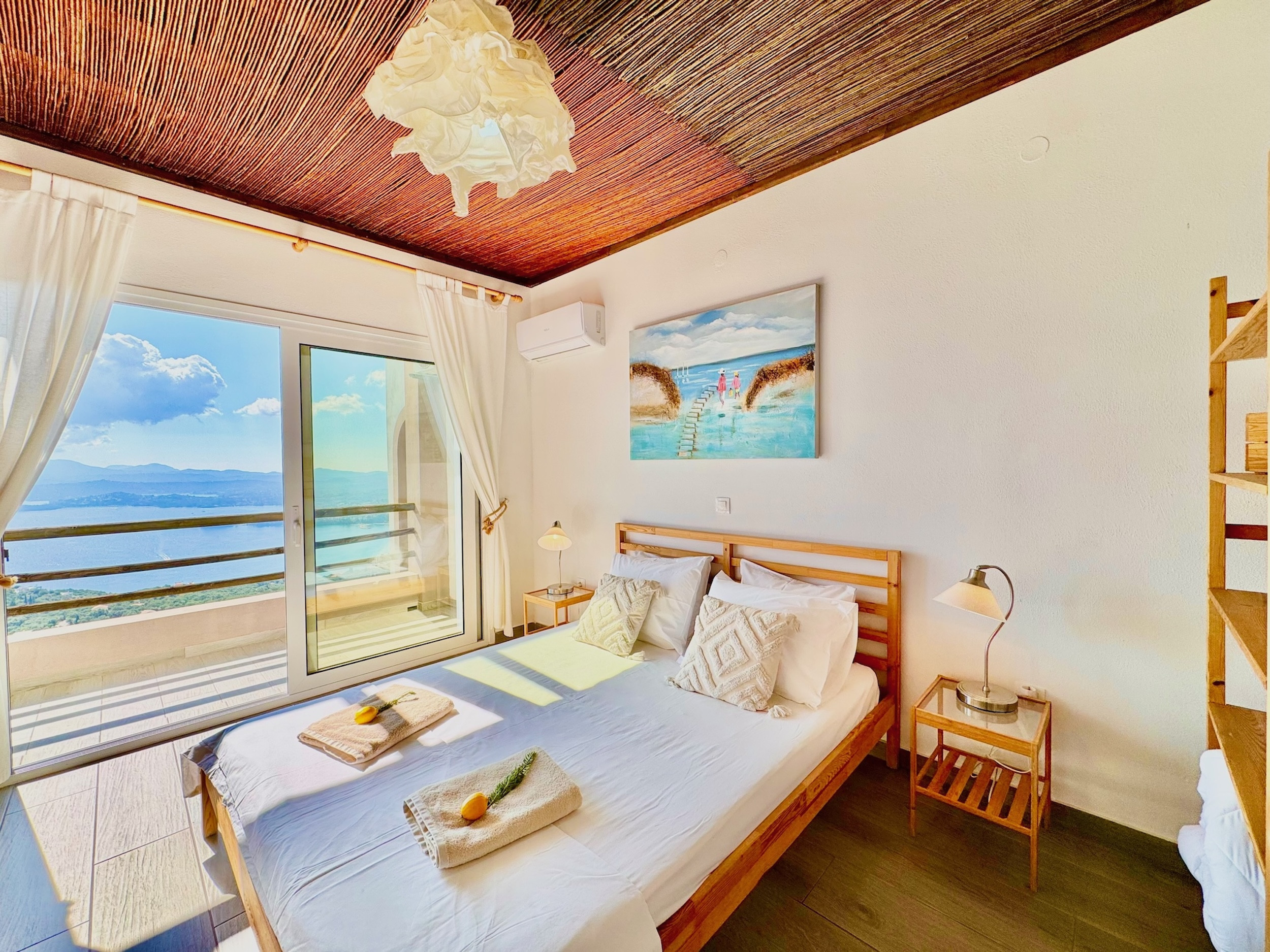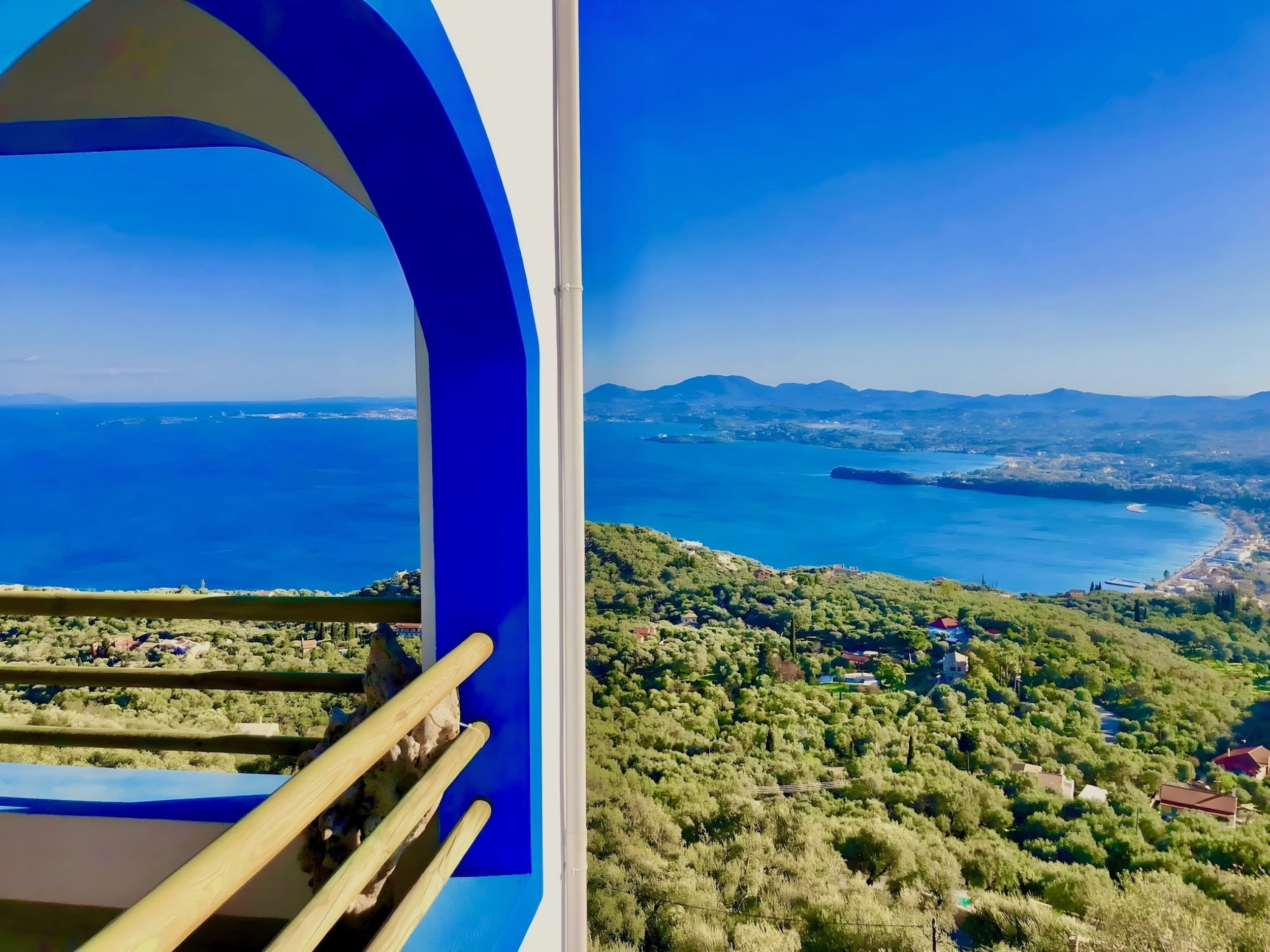 Inside, the property has been cleverly designed to accommodate up to 13 guests in 6 bedrooms, yet providing privacy when required or at night: it is in fact composed by 2 self contained units with 3 bedrooms and 2 bathrooms each, rented together as a whole, independent villa with private pool. The units cannot be rented individually. Each of the 2 identical units enjoys a sensational open-plan lounge with adjoining fully equipped kitchen and dining area, comfortable sofas, smart TV and patio doors leading out to the panoramic terrace, a delight both during day and night. An hallway leads then to the 3 bedrooms (2 doubles with panoramic terrace, 1 twin) and the 2 bathrooms (one with bathtub and one with shower) for a total of 6 bedrooms and 4 bathrooms. An extra guest can be accommodated on a folding z-bed provided free of charge (mostly suitable for a child). For the comfort of our guests, the whole property is air-conditioned, both in the bedrooms and lounge areas. Starlink fast internet is provided. The property has been beautifully furnished in traditional Greek colors and is full of light: the perfect connection between the green of the corfiot hills and the blue of the sea.