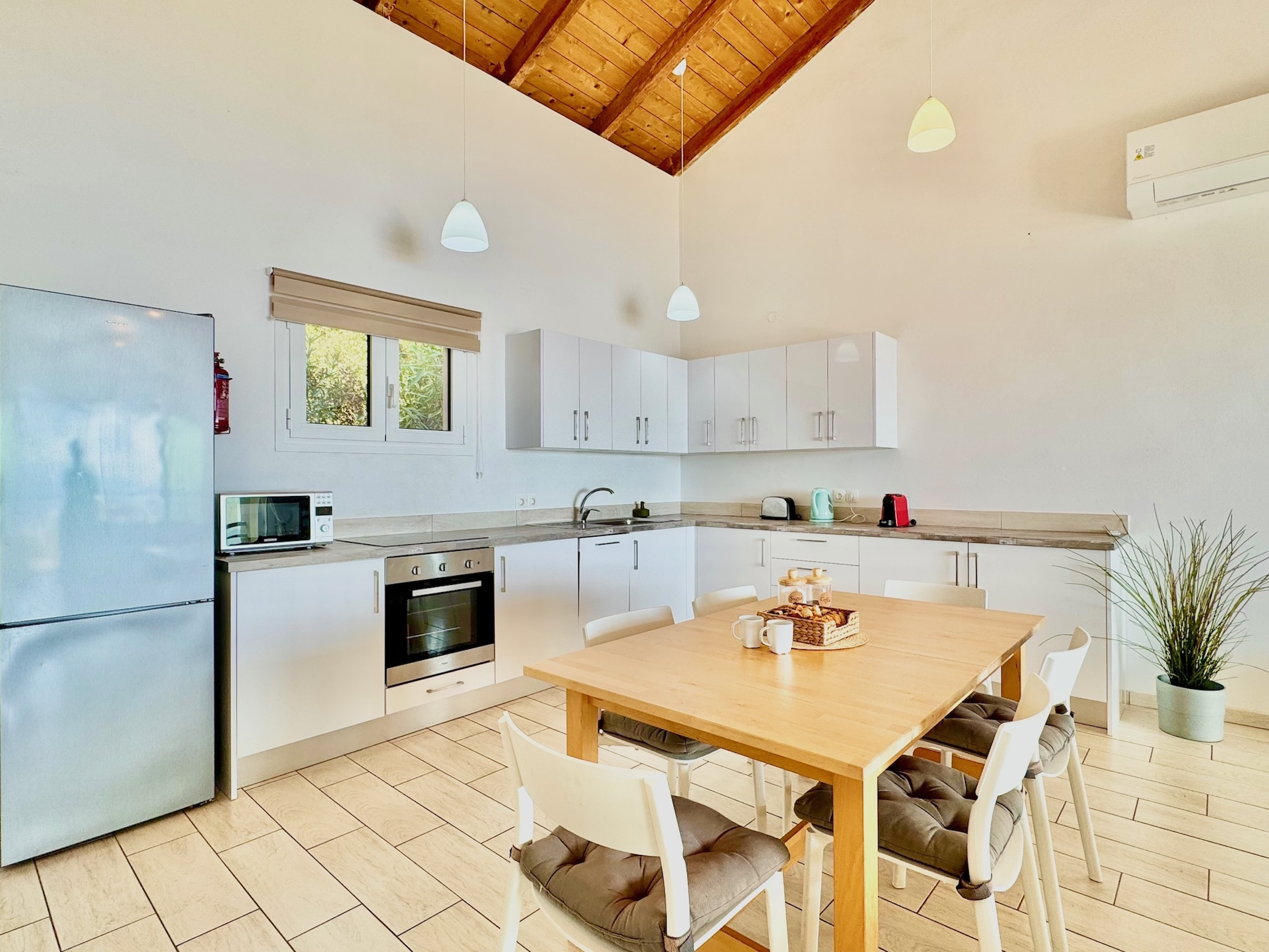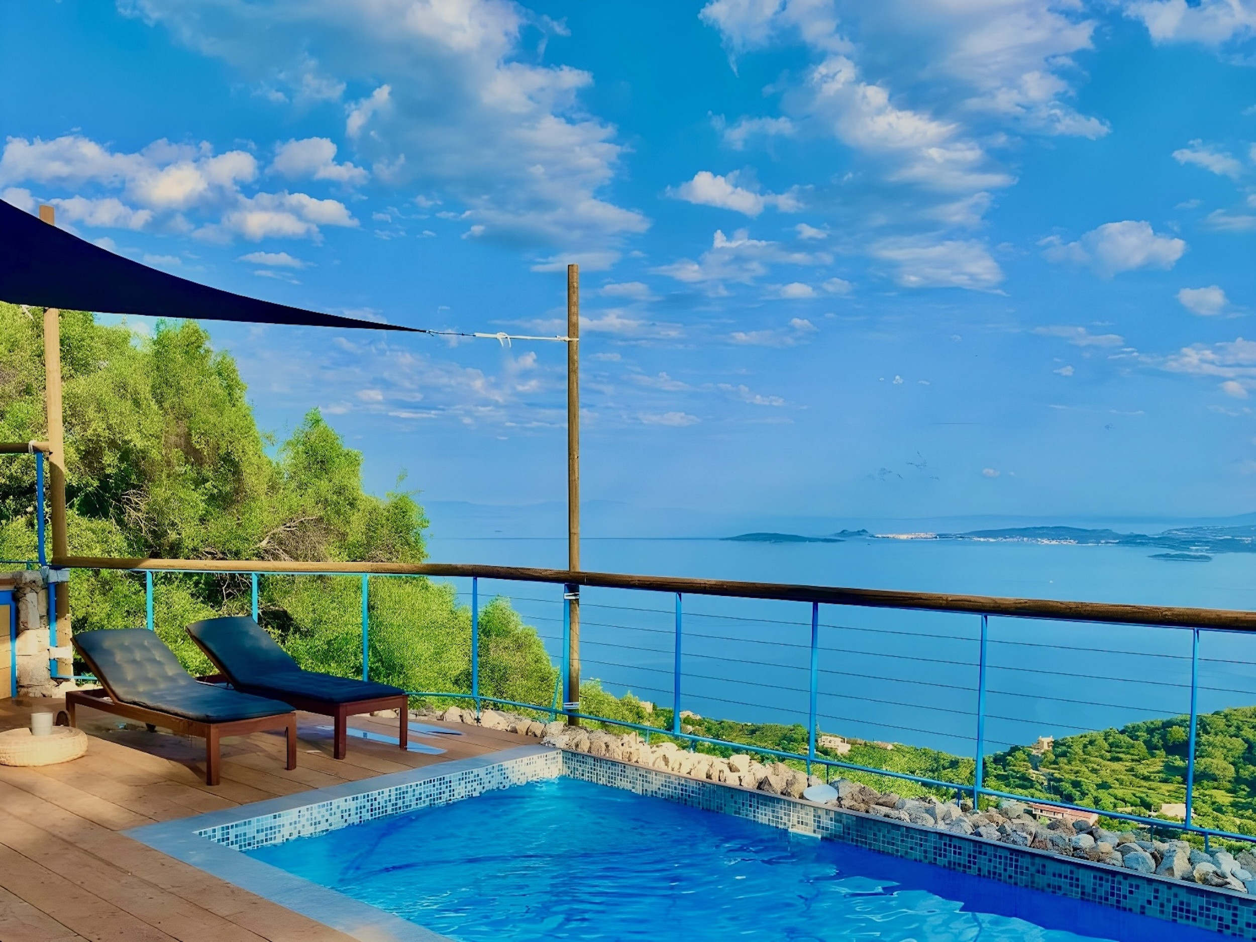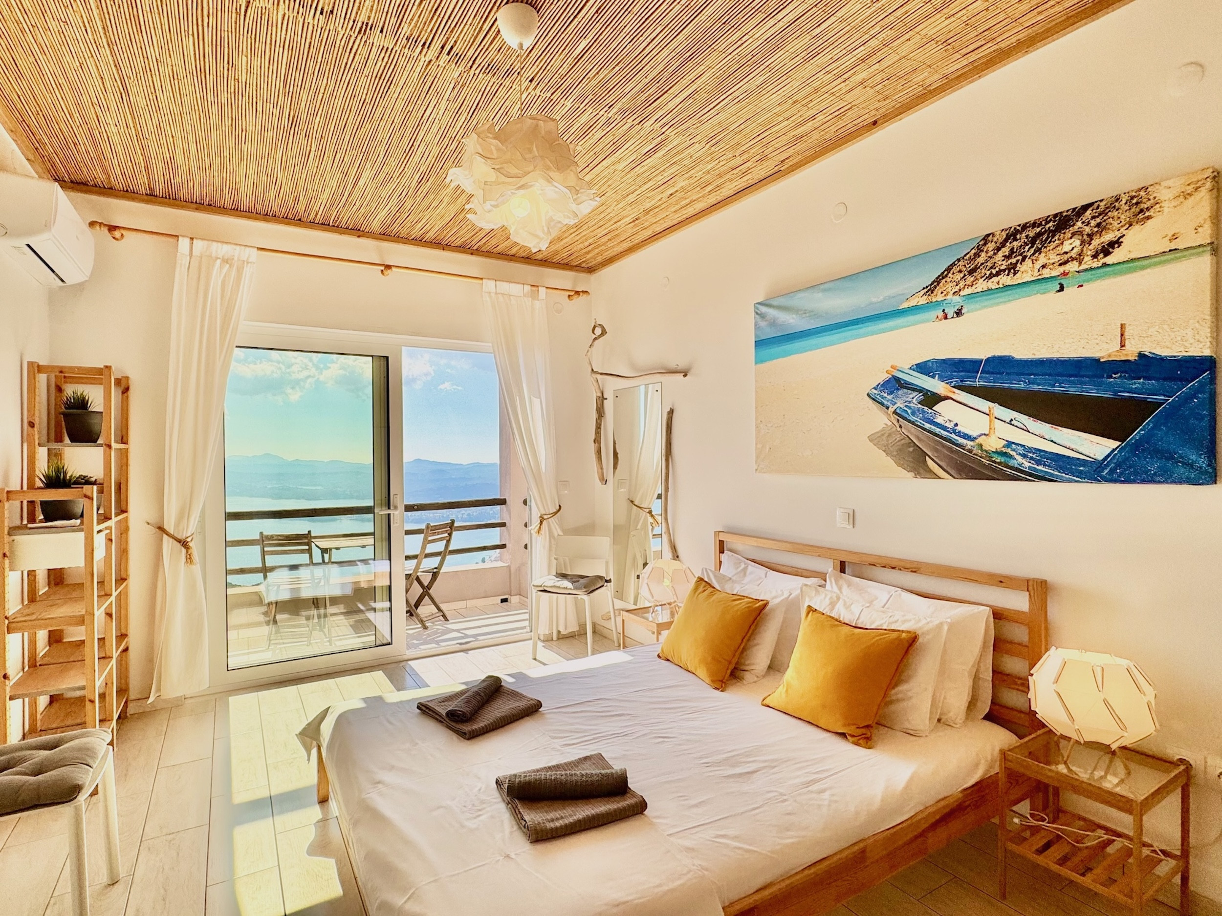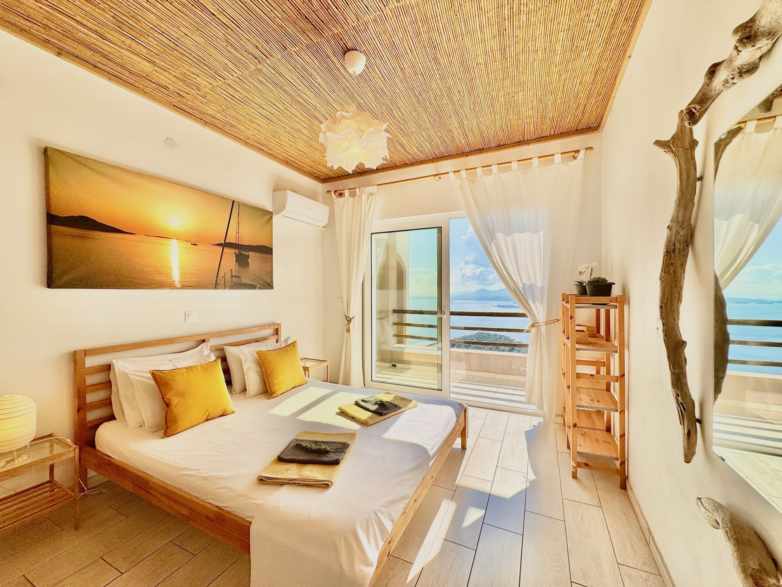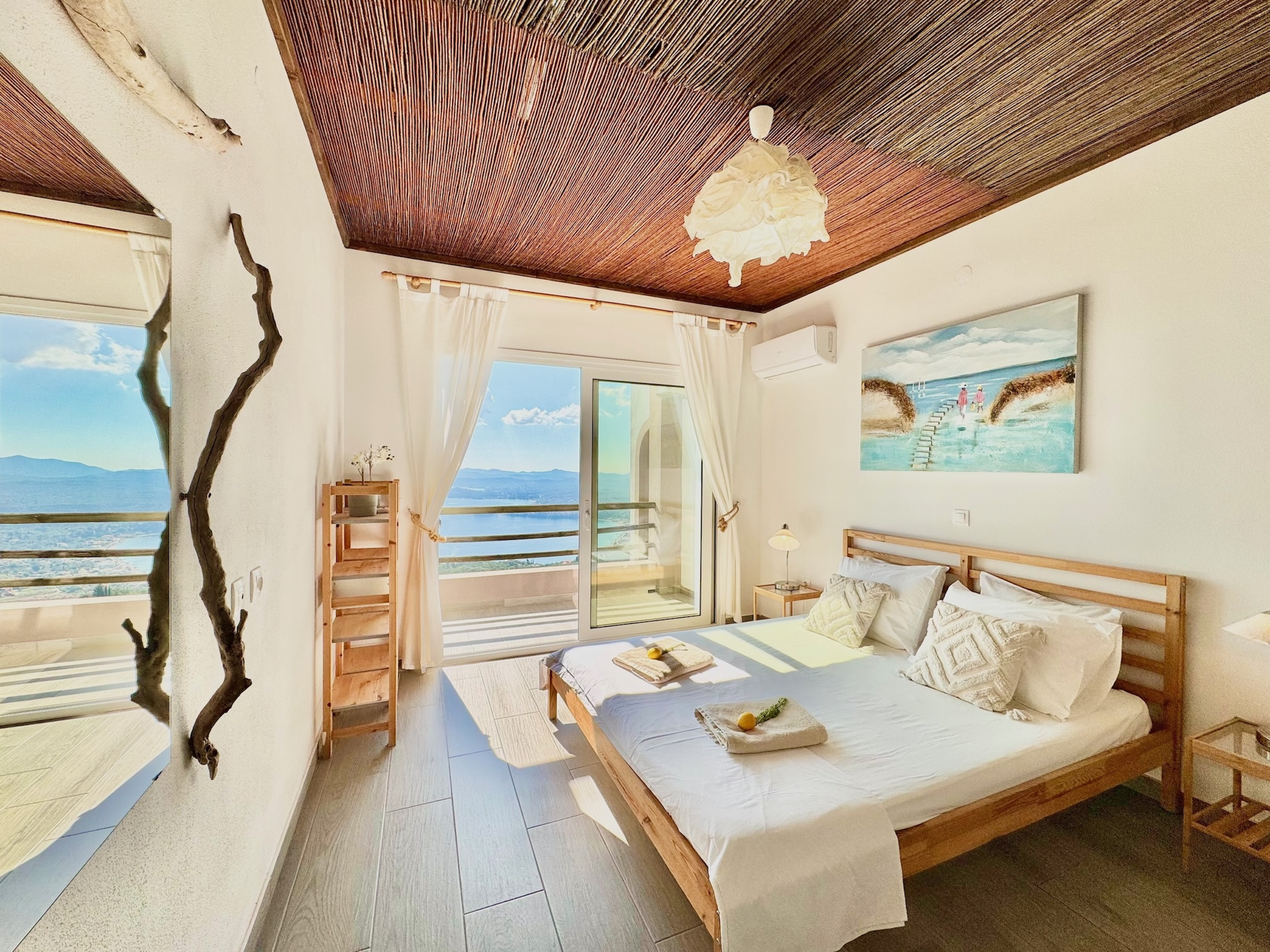 Inside, the property has been cleverly designed to accommodate up to 13 guests in 6 bedrooms, yet providing privacy when required or at night: it is in fact composed by 2 self contained units with 3 bedrooms and 2 bathrooms each, rented together as a whole, independent villa with private pool. The units cannot be rented individually. Each of the 2 identical units enjoys a sensational open-plan lounge with adjoining fully equipped kitchen and dining area, comfortable sofas, smart TV and patio doors leading out to the panoramic terrace, a delight both during day and night. An hallway leads then to the 3 bedrooms (2 doubles with panoramic terrace, 1 twin) and the 2 bathrooms (one with bathtub and one with shower) for a total of 6 bedrooms and 4 bathrooms. An extra guest can be accommodated on a folding z-bed provided free of charge (mostly suitable for a child). For the comfort of our guests, the whole property is air-conditioned, both in the bedrooms and lounge areas. Starlink fast internet is provided. The property has been beautifully furnished in traditional Greek colors and is full of light: the perfect connection between the green of the corfiot hills and the blue of the sea.