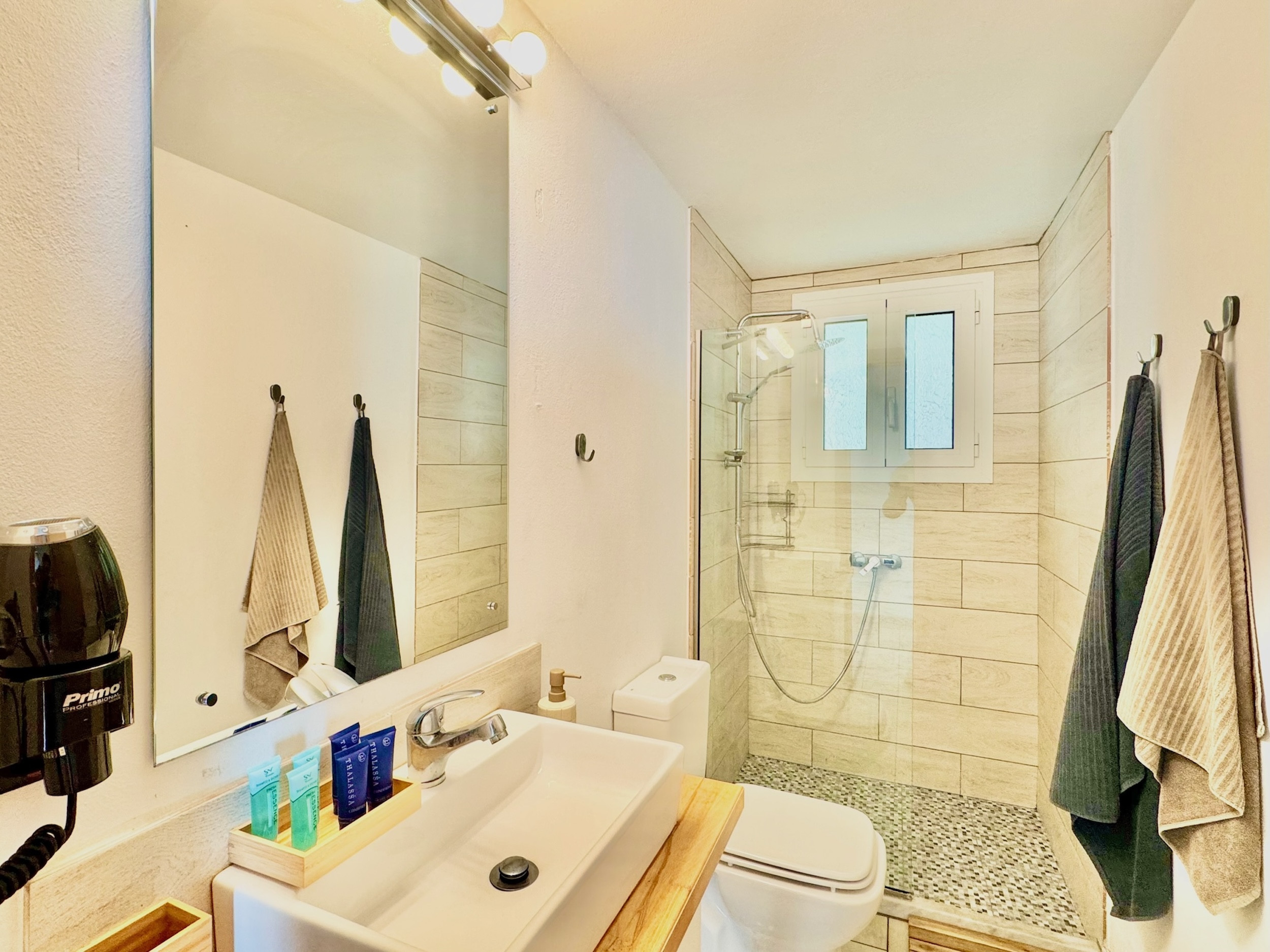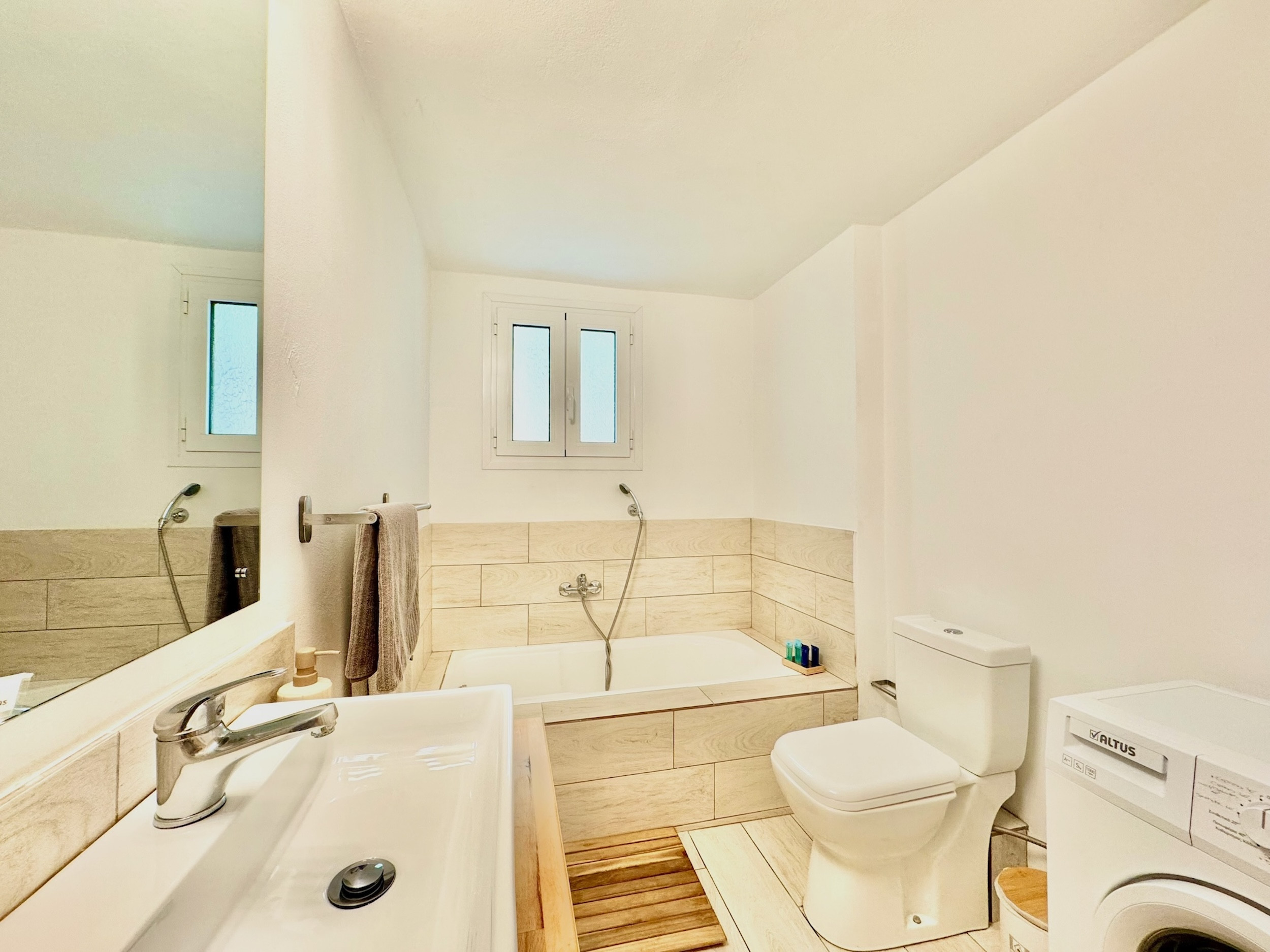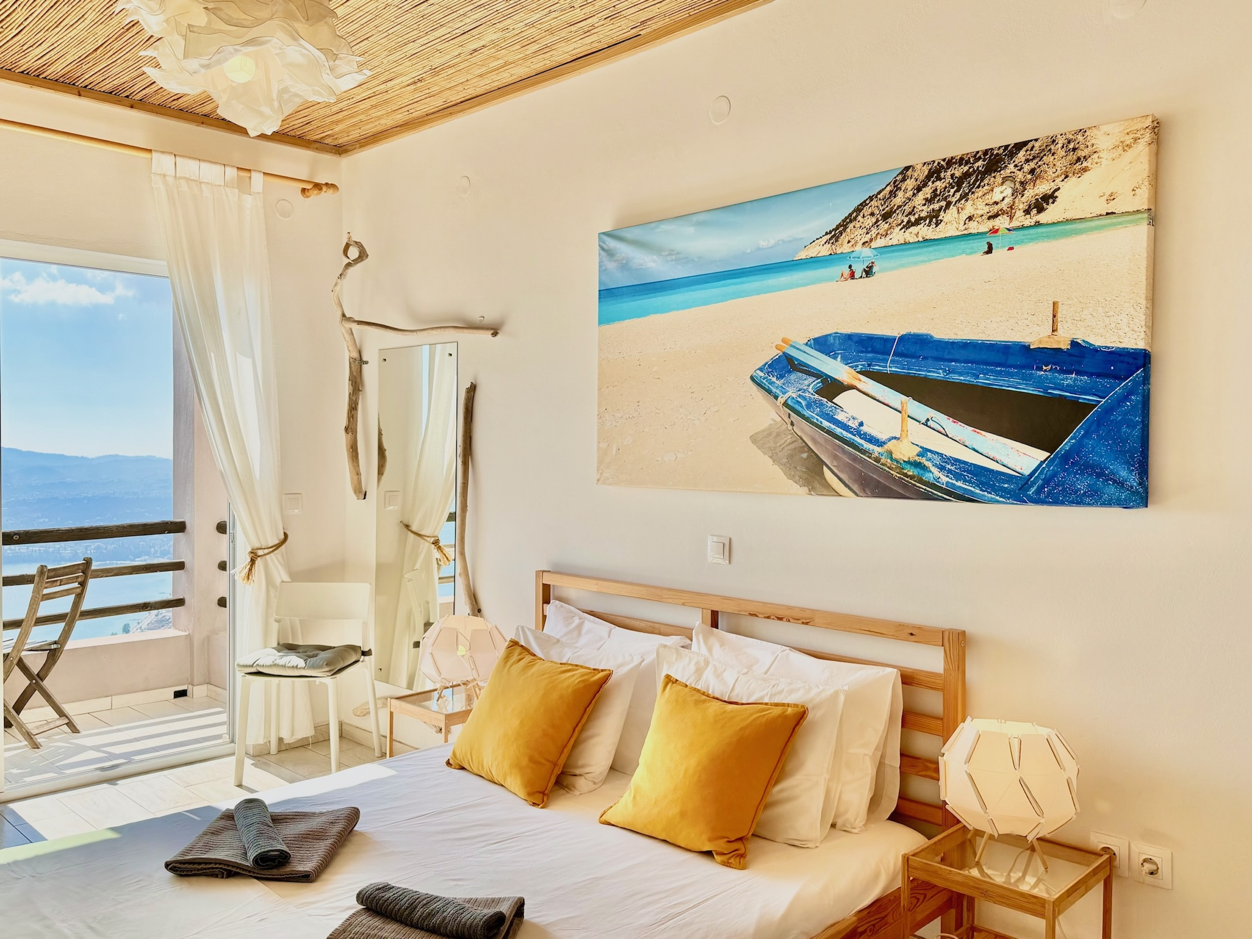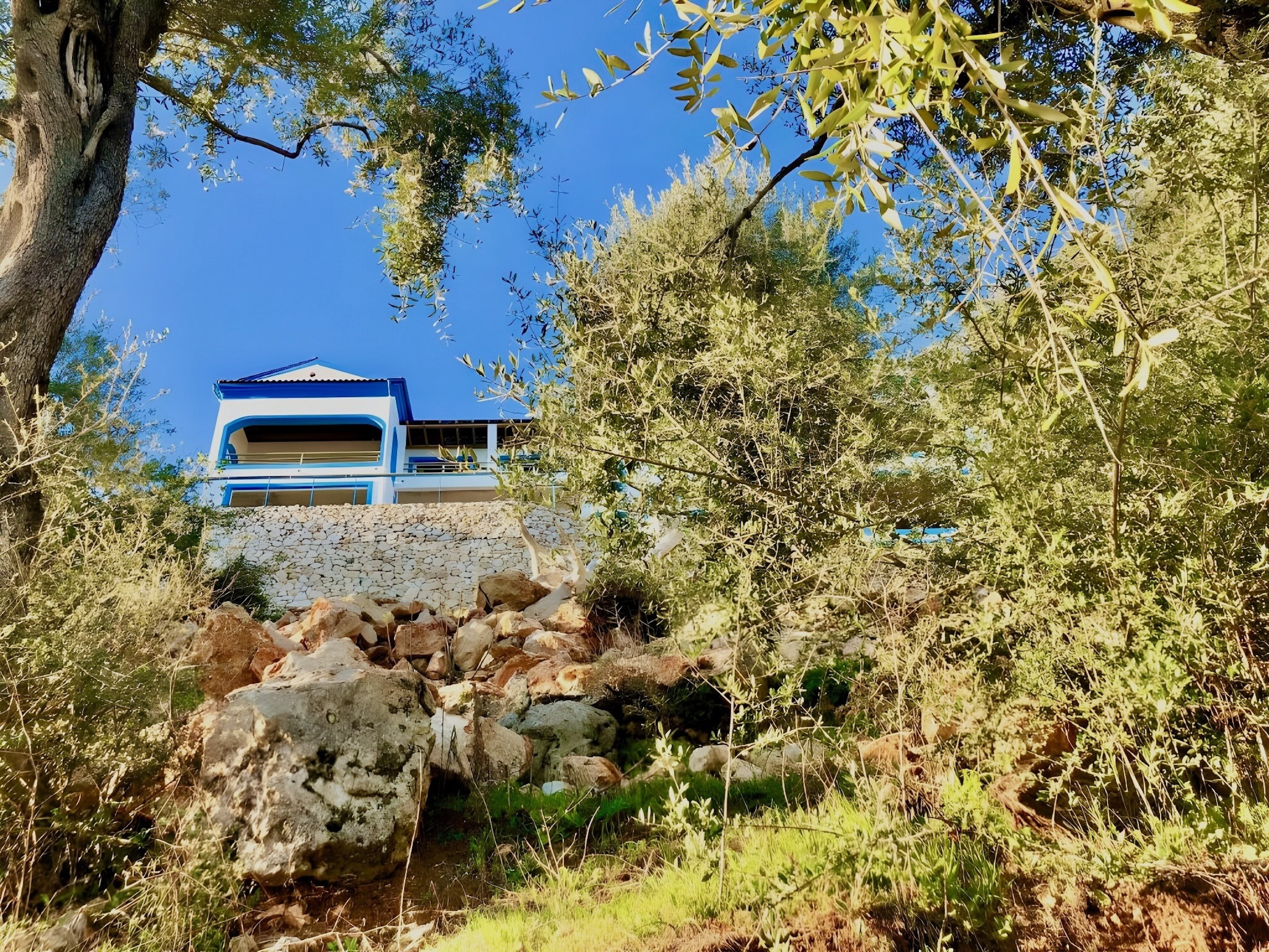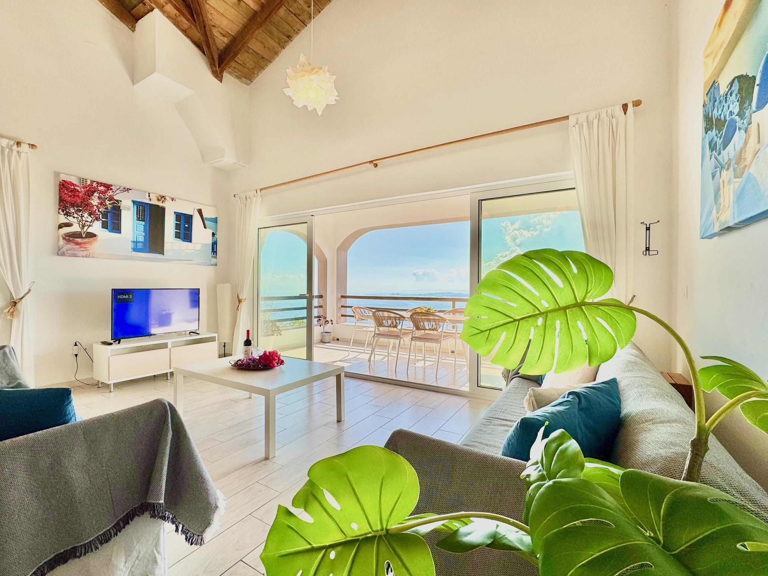 Inside, the property has been cleverly designed to accommodate up to 13 guests in 6 bedrooms, yet providing privacy when required or at night: it is in fact composed by 2 self contained units with 3 bedrooms and 2 bathrooms each, rented together as a whole, independent villa with private pool. The units cannot be rented individually. Each of the 2 identical units enjoys a sensational open-plan lounge with adjoining fully equipped kitchen and dining area, comfortable sofas, smart TV and patio doors leading out to the panoramic terrace, a delight both during day and night. An hallway leads then to the 3 bedrooms (2 doubles with panoramic terrace, 1 twin) and the 2 bathrooms (one with bathtub and one with shower) for a total of 6 bedrooms and 4 bathrooms. An extra guest can be accommodated on a folding z-bed provided free of charge (mostly suitable for a child). For the comfort of our guests, the whole property is air-conditioned, both in the bedrooms and lounge areas. Starlink fast internet is provided. The property has been beautifully furnished in traditional Greek colors and is full of light: the perfect connection between the green of the corfiot hills and the blue of the sea.