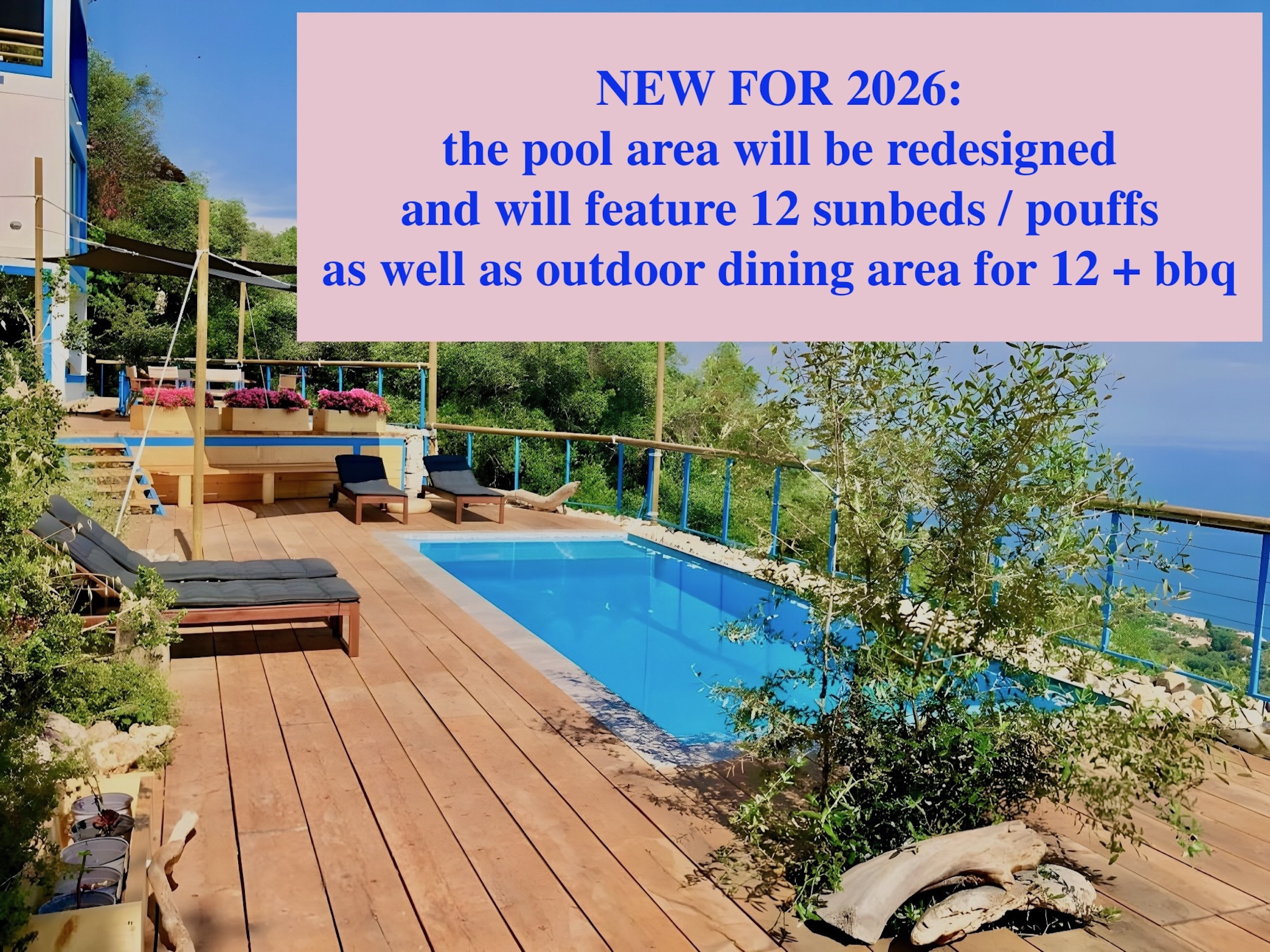 GREEK STAY TAX (climate resilience tax): euro 15 per villa per night not included in the rental rate and payable locally.