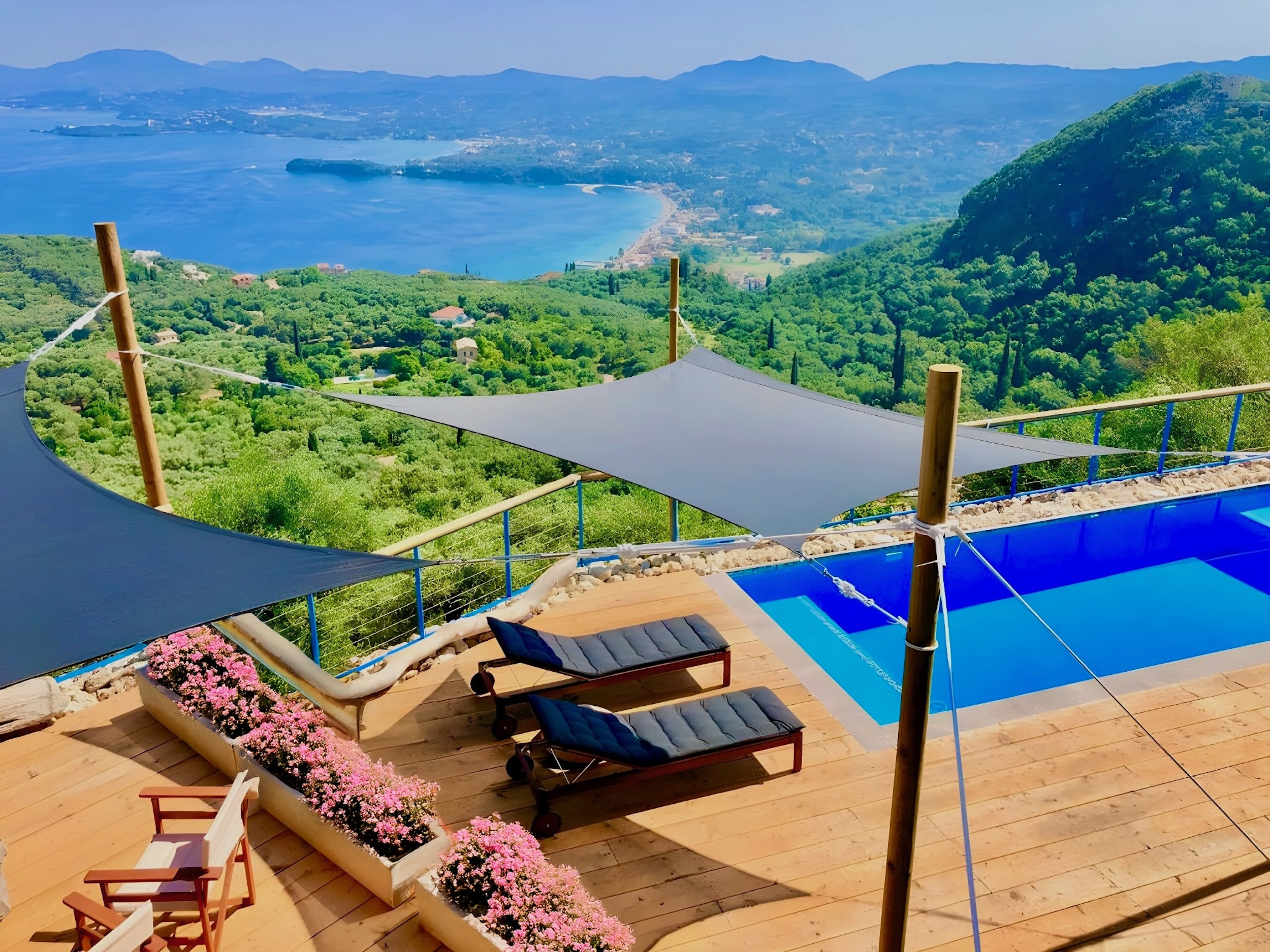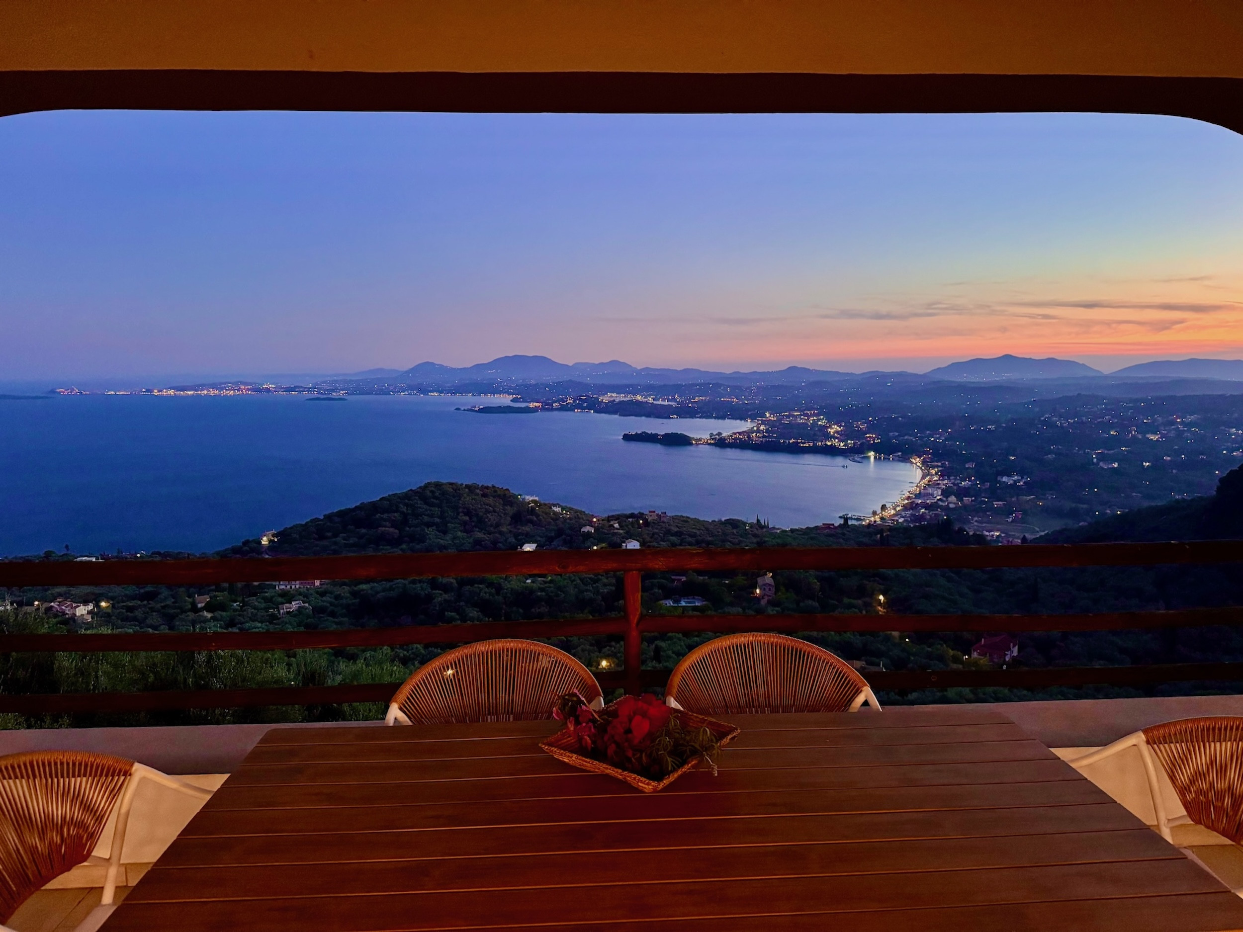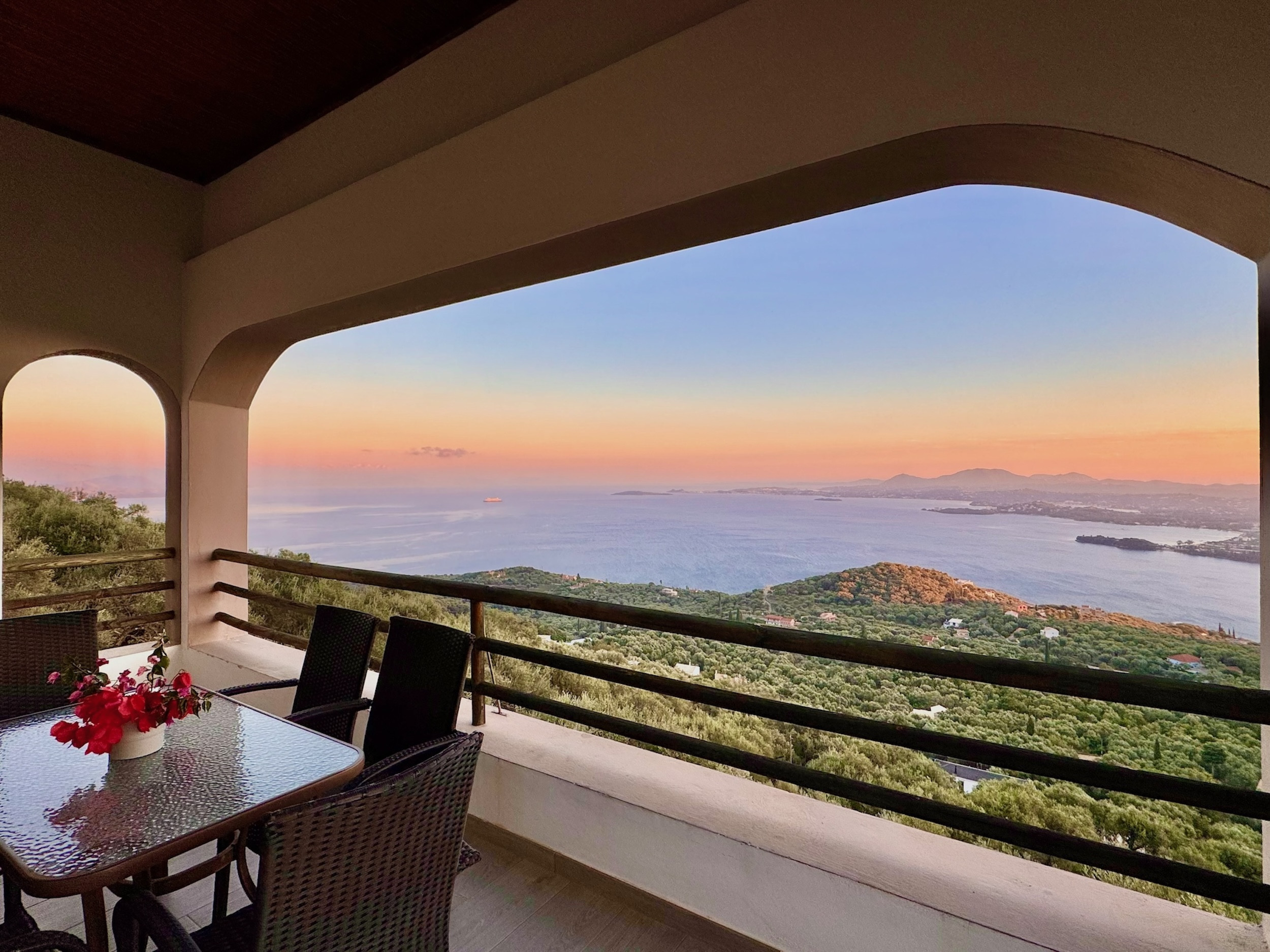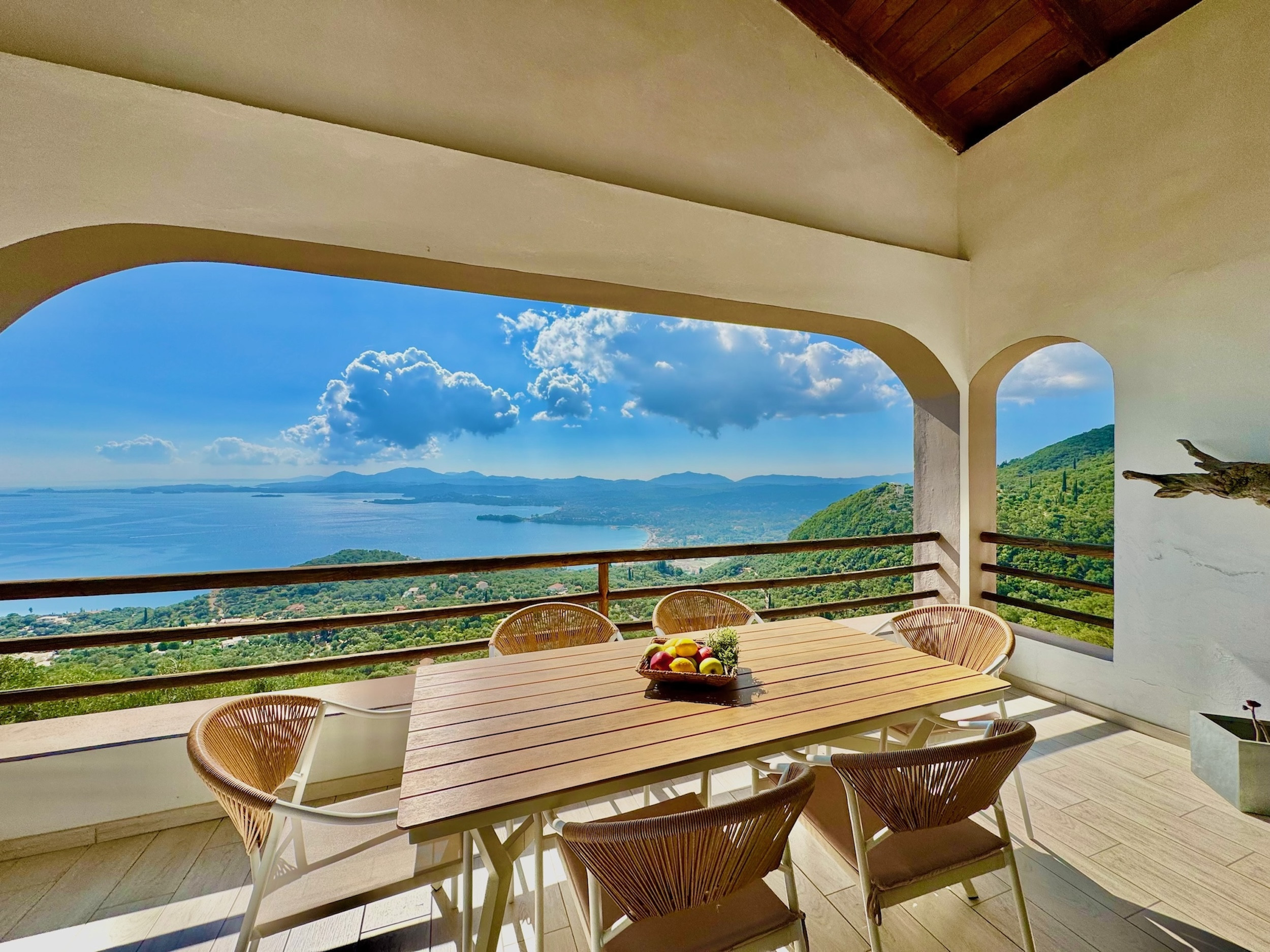 Steps lead down from the accommodation area to the newly redesigned pool terrace, providing once again the most sensational views over the sea. This is an unique spot to enjoy the shining Greek sun and enjoying the views of the boats passing by. The upgraded pool area features comfortable sunbeds and poufs, as well as barbecue and a dining table for 12, where all the guests can dine together al fresco. The lovely, sparkling private pool measures 7m x 3,5m and also features shallow ends to chill out and relax: a true delight all summer long. Spending long, lazy hours admiring the glorious views while sunbathing, will be the experience of a lifetime. And while the lights of Corfu Town in the distance light up at dusk: simply wow! Private parking is also available within the premises.