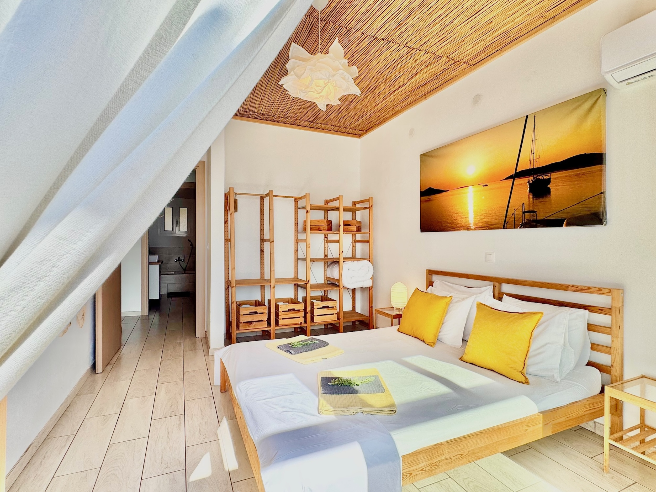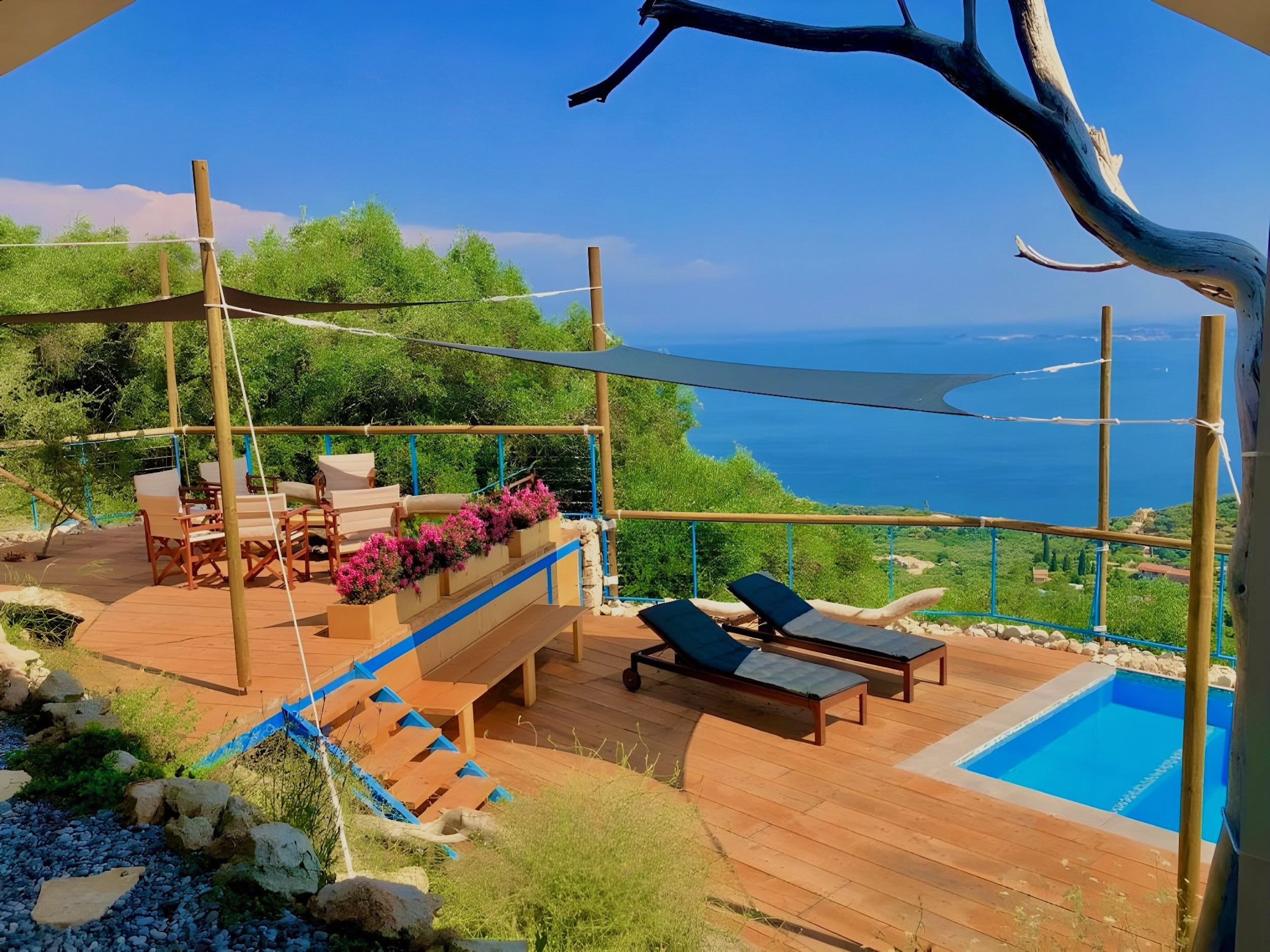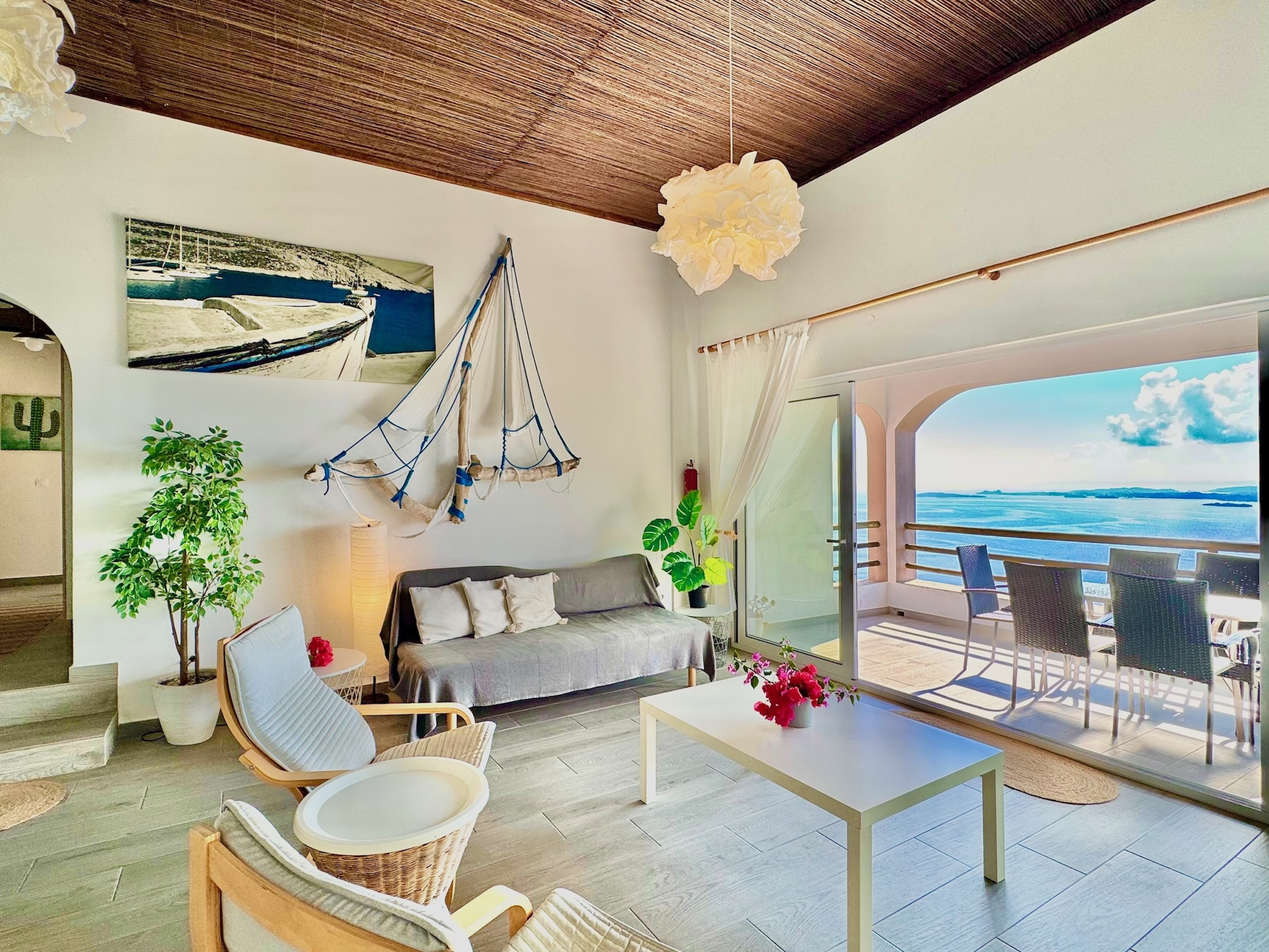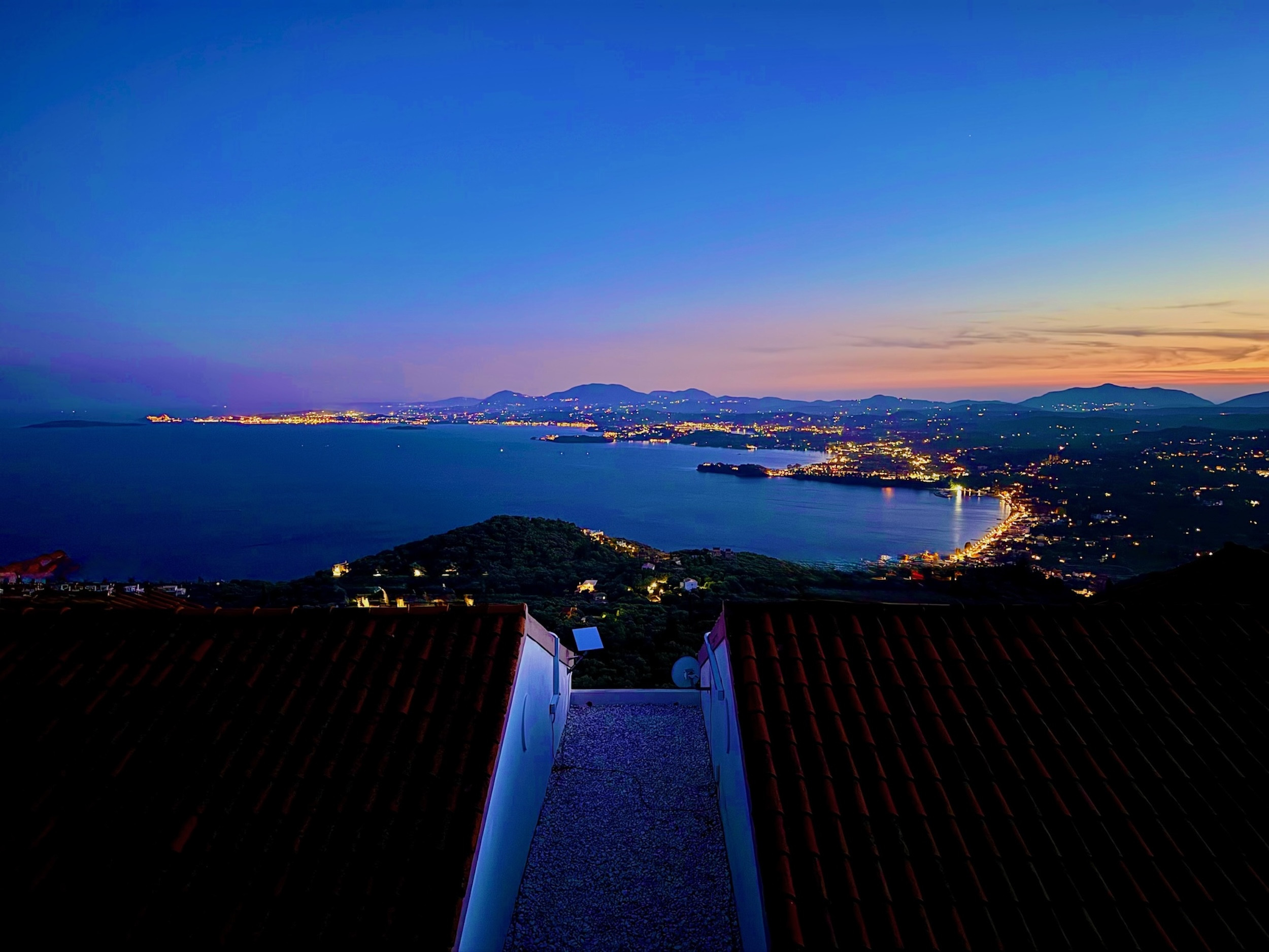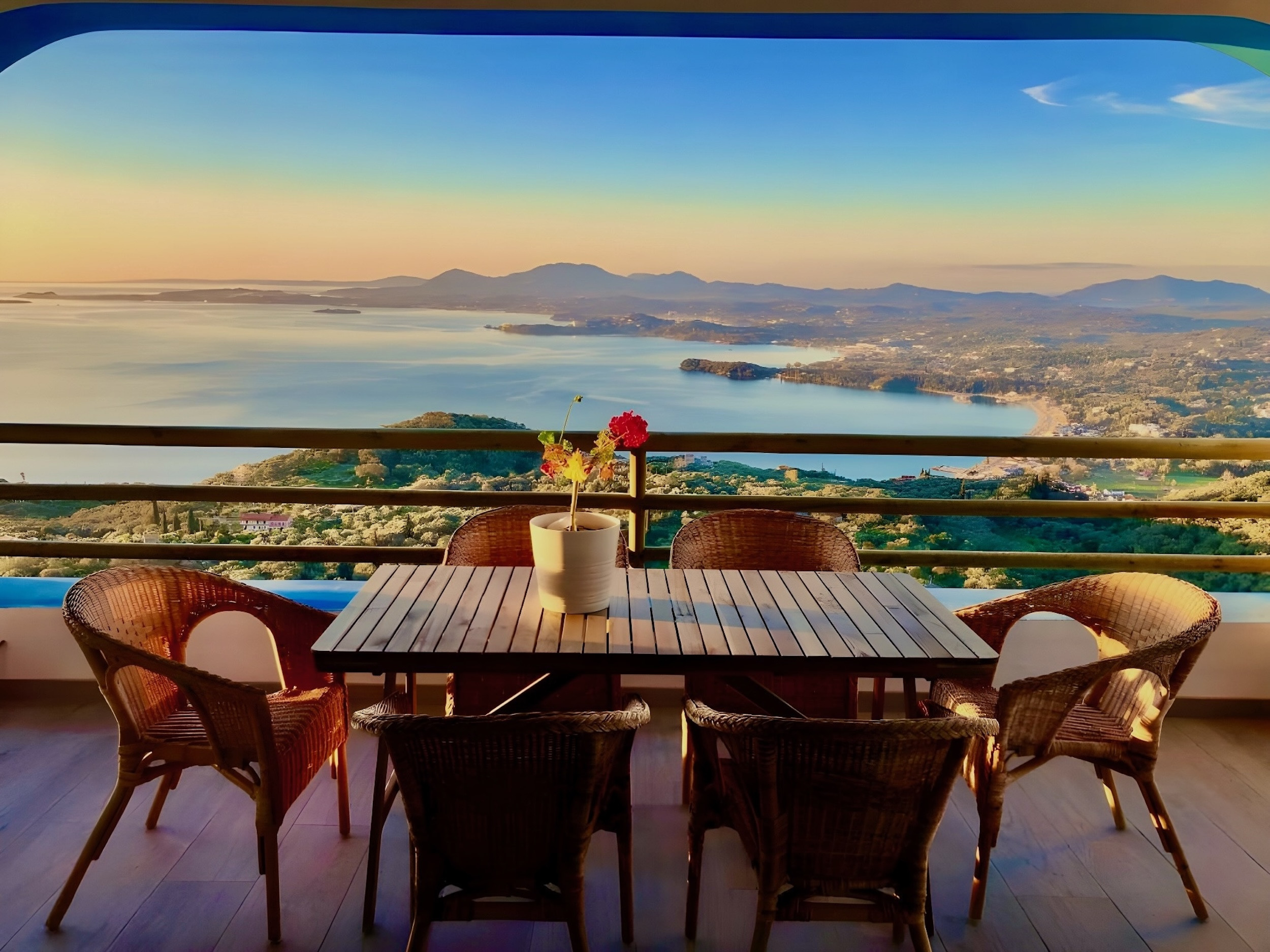 Steps lead down from the accommodation area to the newly redesigned pool terrace, providing once again the most sensational views over the sea. This is an unique spot to enjoy the shining Greek sun and enjoying the views of the boats passing by. The upgraded pool area features comfortable sunbeds and poufs, as well as barbecue and a dining table for 12, where all the guests can dine together al fresco. The lovely, sparkling private pool measures 7m x 3,5m and also features shallow ends to chill out and relax: a true delight all summer long. Spending long, lazy hours admiring the glorious views while sunbathing, will be the experience of a lifetime. And while the lights of Corfu Town in the distance light up at dusk: simply wow! Private parking is also available within the premises.